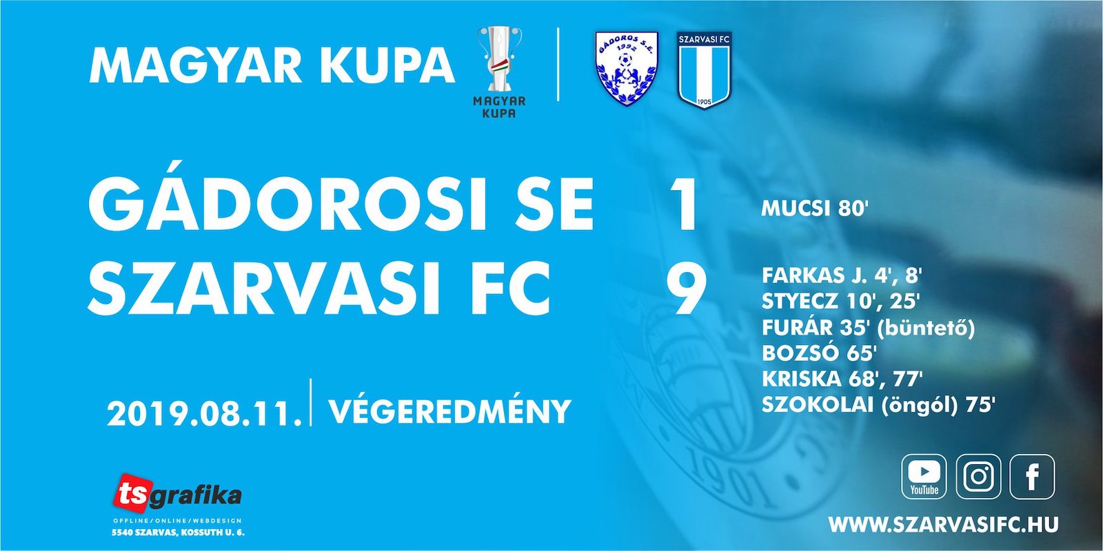 Vasárnap késő délután Gádoroson, a Magyar Kupa megyei fordulójában léptünk pályára, ahol tíz perc alatt magabiztos előnyre tettünk szert és könnyed győzelemmel jutottunk tovább a következő, országos főtáblára jutásról döntő fordulóba.