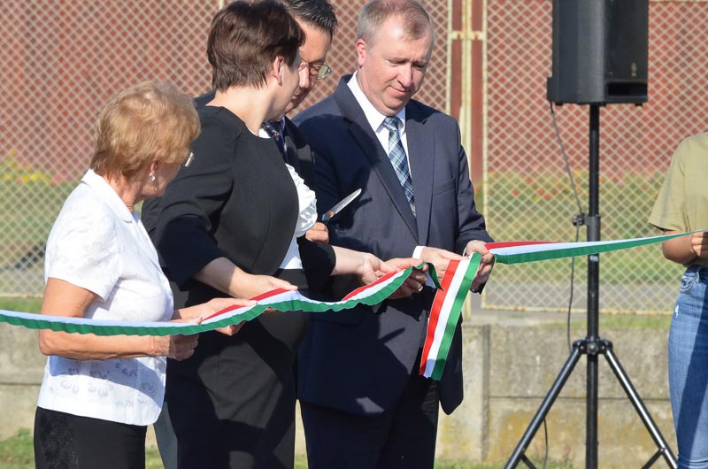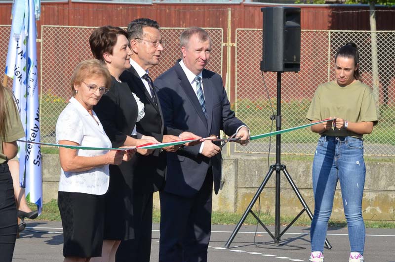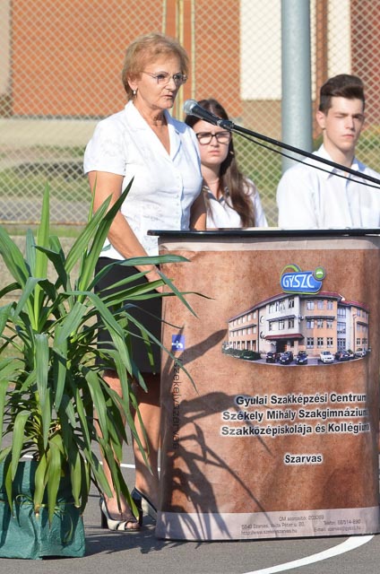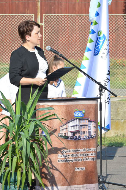 Igazgató asszony tanévnyitó gondolatai után Kovács Zsuzsanna, a Gyulai Szakképzési Centrum főigazgató asszonya is köszöntötte a diákokat, tanárokat, az iskola dolgozóit, majd ezután a felújított sportpálya ünnepélyes átadása következett.