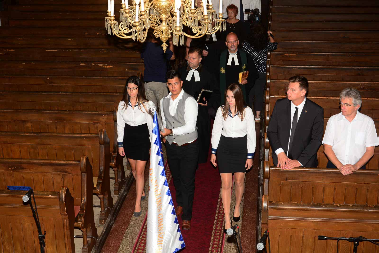 2019. szeptember 2. 9 óra. Az iskolazászlót, lelkészeket, iskolavezetést, vendégeket követve az ünneplőbe öltözött diákság bevonult az Újtemplomba. Az Erős vár a mi Istenünk versszakainak éneklését követően a 86. zsoltár és a kezdő imádság mondatai vezették fel Ördögh Endre lelkész úr igehirdetését.