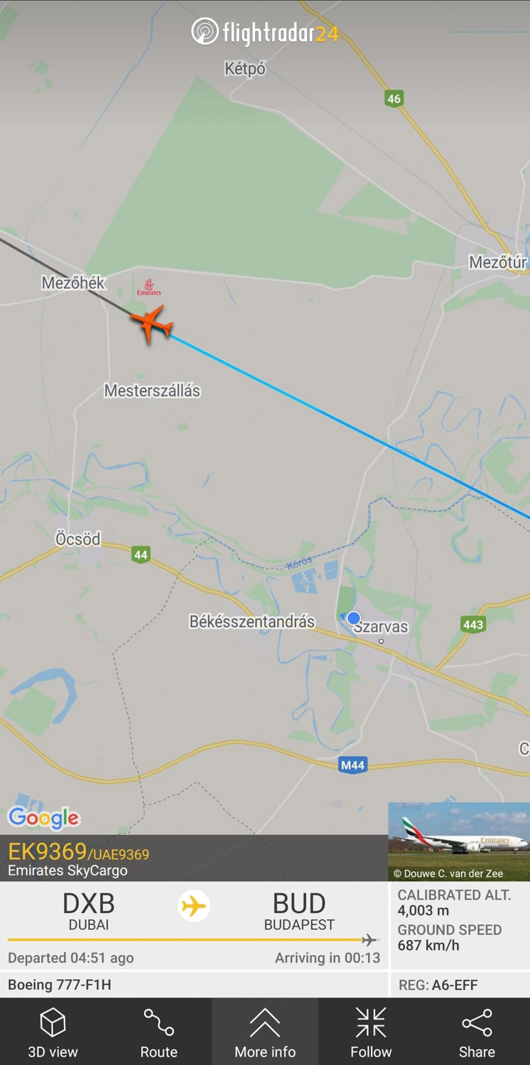 2.) A gép Dubaiból Budapestre tartott. Az Emirates SkyCargo felettünk repülő gépe március vége óta jár heti egy-két alkalommal. Amit eddig megoldottak napi egy utasszállító fordulójának a gyomrában, azt most a vírus miatt március 23-án leállt személyforgalom miatt másképp kell megoldani, mert a teherforgalmat továbbra is le kell bonyolítani.