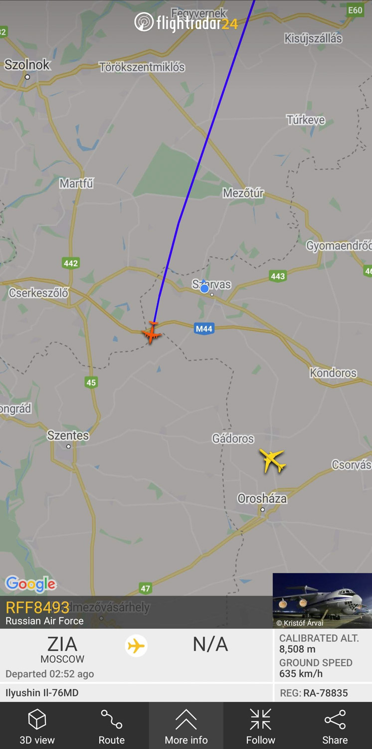 1.) Russian Air Force IL-76MD. A múlt vasárnap három is ment Belgrádba, és még aznap vissza, Moszkvába. Ami felettünk elrepült, egy hónap híján 30 éve, 1990 májusában gyártották. Konkrétan ez a gép szállítmányozott Putyinnak 2019. október 27-én, amikor legutóbb Budapesten járt, ezt szintén a repülőtéren kapta lencsevégre Dávid.