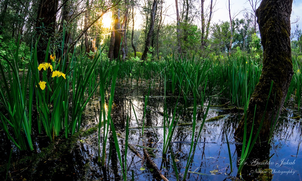 A fotók a Körös árterében készültek, miközben sárga nőszirmot és réti iszalagot fotóz.
