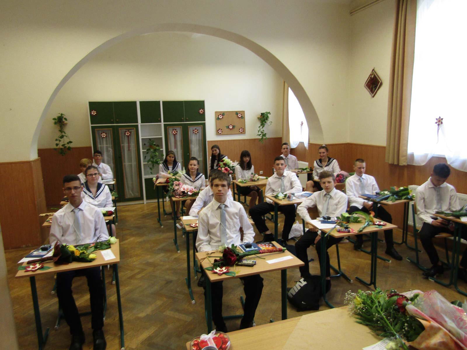 Szokatlan csend ülte meg az iskolát június 19-én délelőtt. Rendhagyó volt az ünnep a diáktársak, barátok és rokonok nélkül, ugyanakkor családias hangulatú. Tíz órakor felcsendültek a jól ismert ballagási dalok, és a nyolcadikosok tanáraik előtt elvonultak a díszterembe, ahol a szüleik várták őket. A Himnusz elhangzása után Rejtő Csaba intézményvezető köszöntötte a vendégeket, majd búcsúzott az osztálytól.