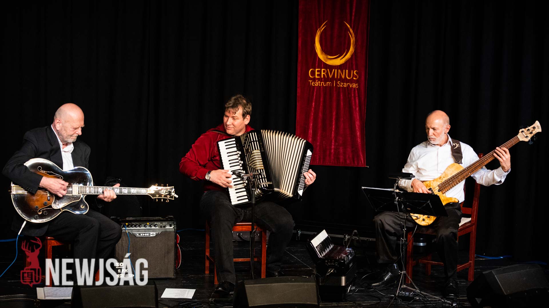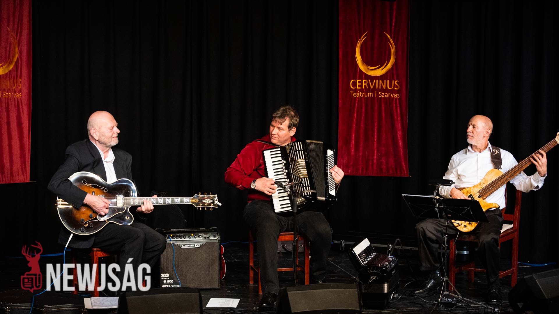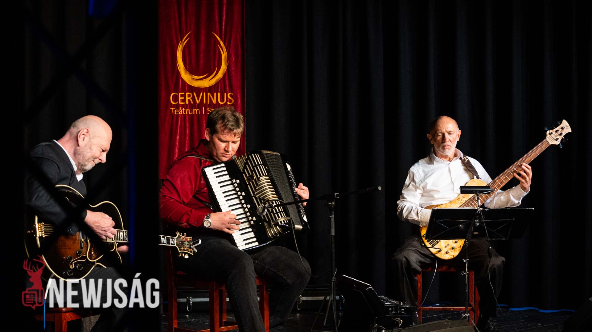 – A színpadon a Molnár Trió – konferálta fel a TérZene programban Szarvasra érkező együttest Csasztvan András a Cervinus Teátrum Kamaratermében. Az eredetileg a Zenepavilonhoz meghirdetett eseményt még a délelőtt folyamán átirányították fedett pályára, mert mint mondta, nem hitték, hogy a prognózisnak megfelelően valóban ki fog sütni a nap, miközben fél szemmel az első sorban ülő Pártai Lúciára sandított.