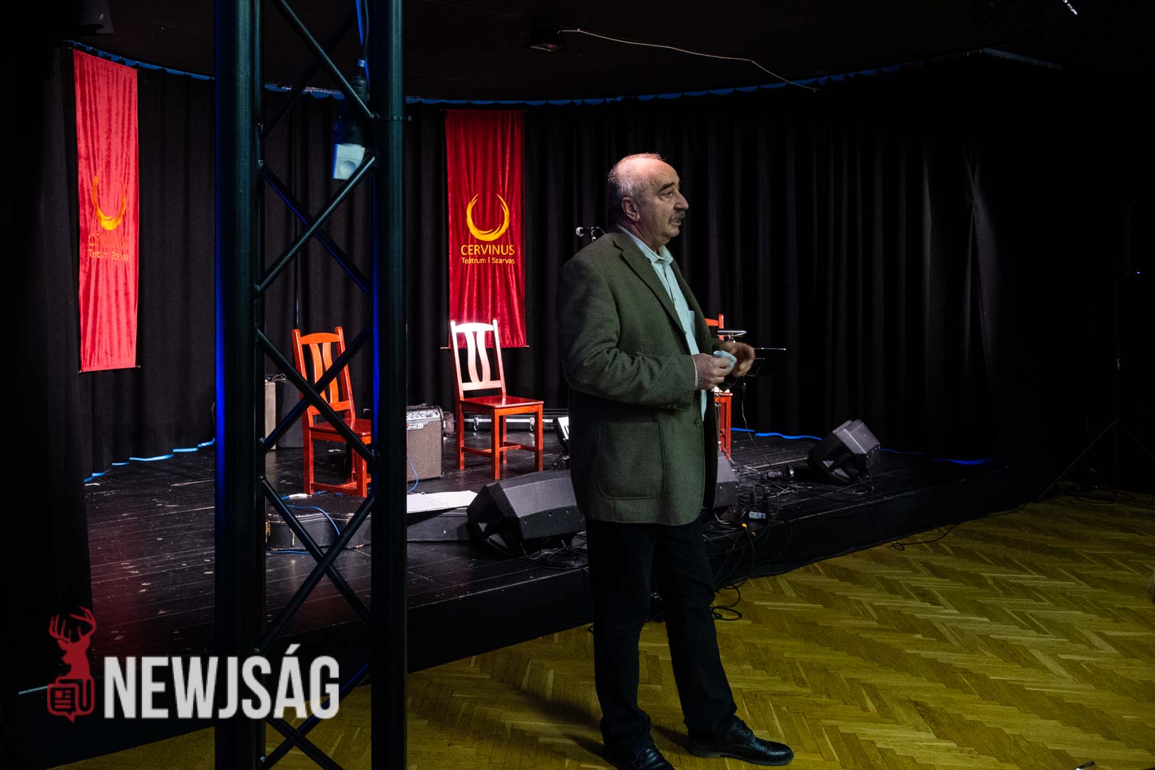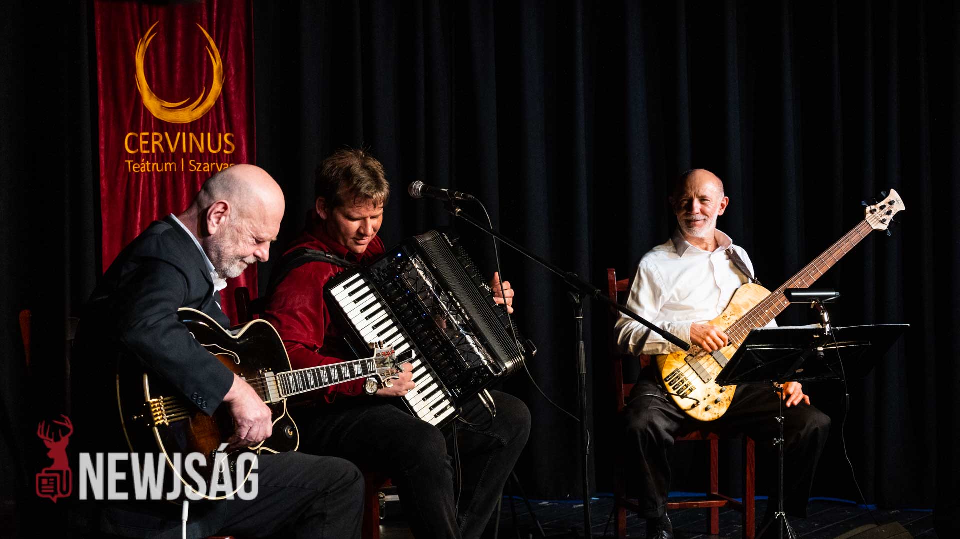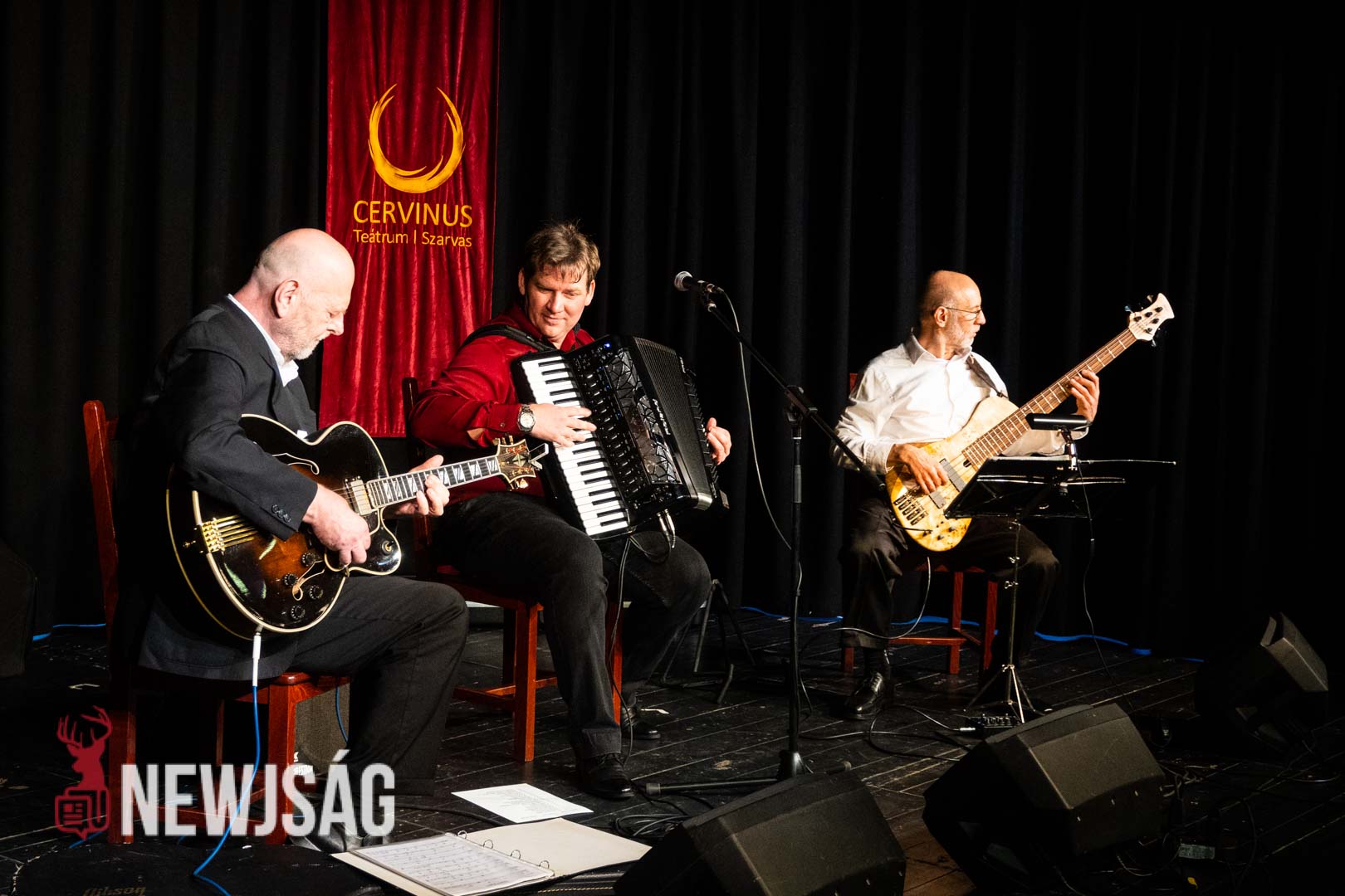 – A színpadon a Molnár Trió – konferálta fel a TérZene programban Szarvasra érkező együttest Csasztvan András a Cervinus Teátrum Kamaratermében. Az eredetileg a Zenepavilonhoz meghirdetett eseményt még a délelőtt folyamán átirányították fedett pályára, mert mint mondta, nem hitték, hogy a prognózisnak megfelelően valóban ki fog sütni a nap, miközben fél szemmel az első sorban ülő Pártai Lúciára sandított.