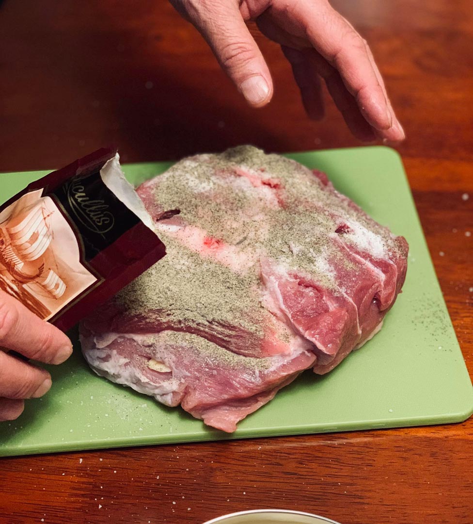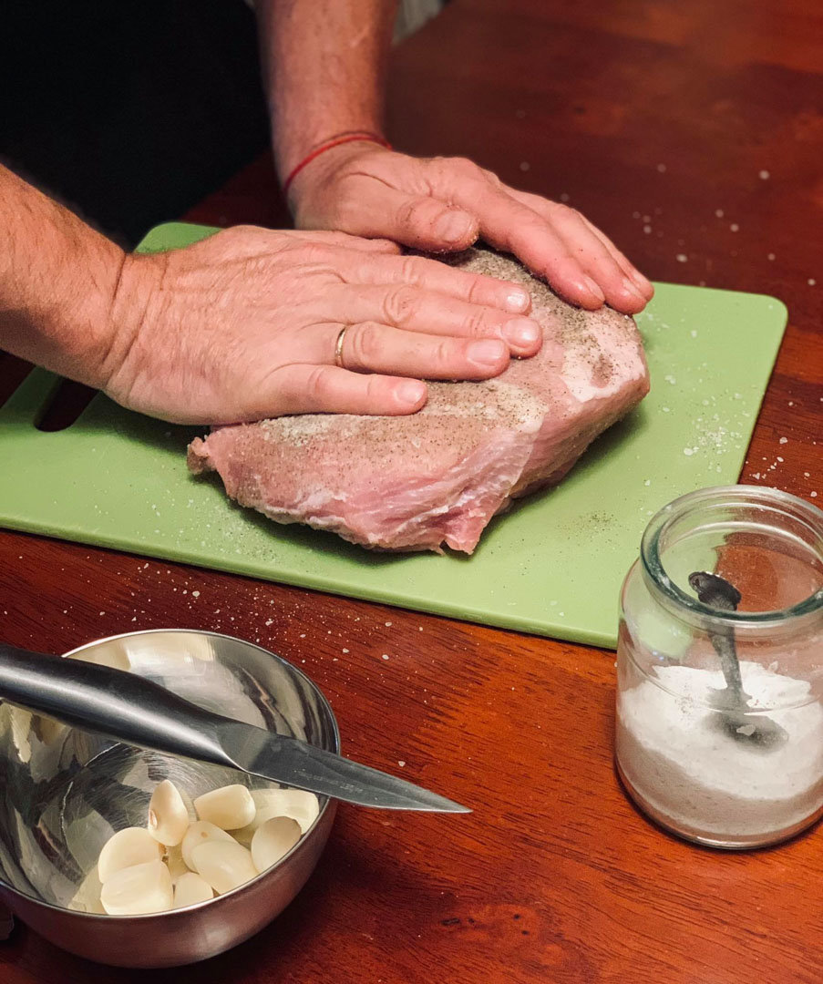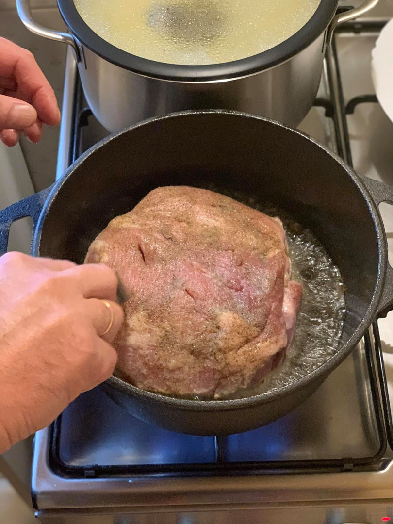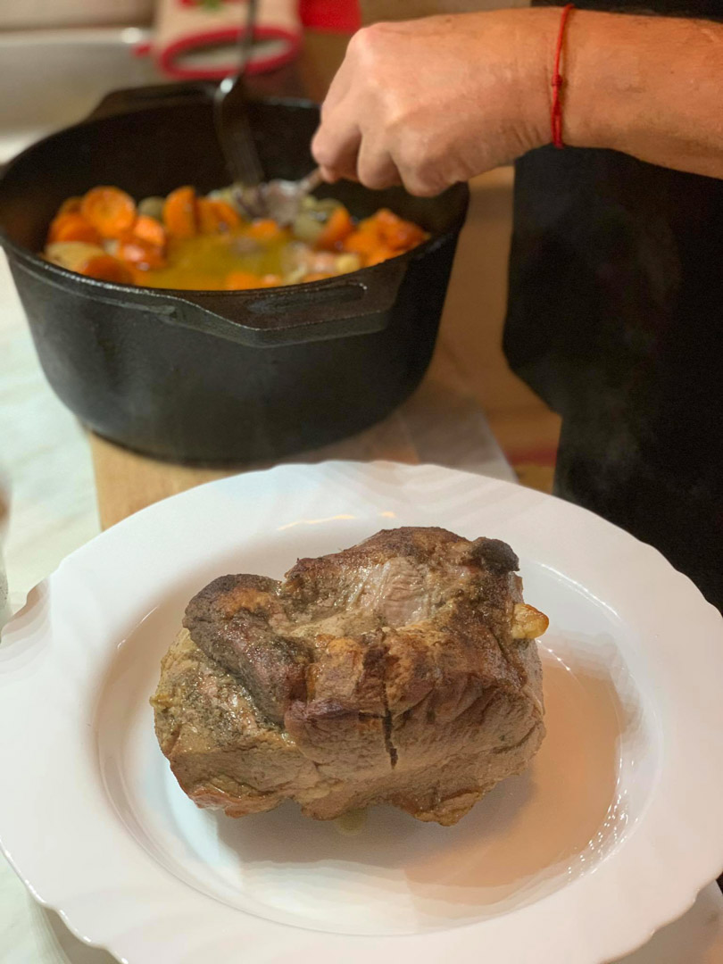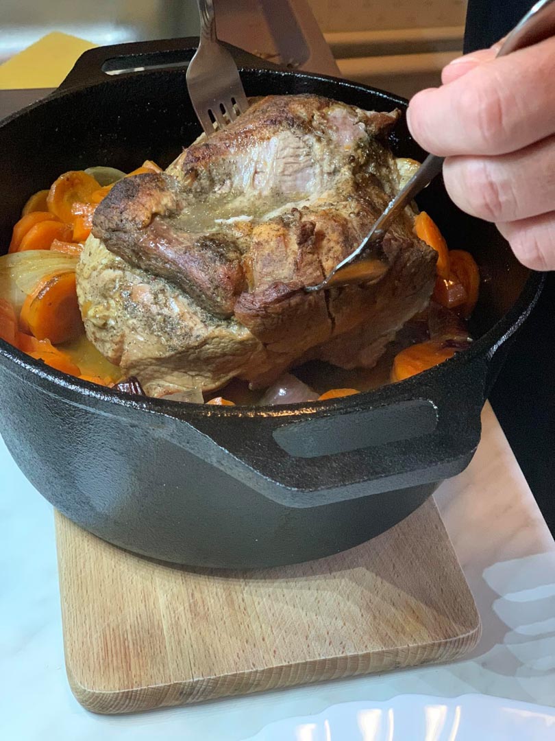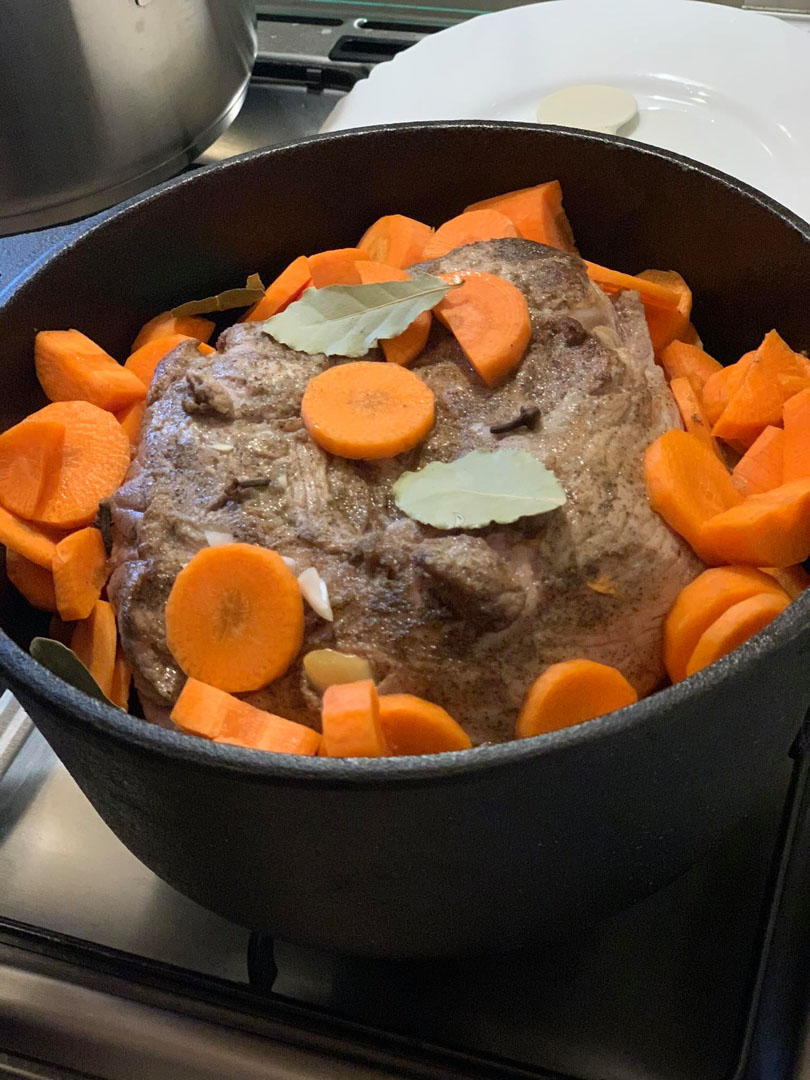 Szóval: kell hozzá egy másfél kilós sertéscomb egyben, só és bors, három szegfűszeg, két-három babérlevél, két sárgarépa, két petrezselyem, egy karalábé, négy nagyobb vöröshagyma, nyolc-tíz gerezd fokhagyma, húsleves alaplé (kockából is lehet), két dl vörösbor, két dl főzőtejszín. Először is a húst megtűzdelem a fokhagyma gerezdekkel, alaposan bedörzsölöm sóval és borssal és úgy hagyom egy fél órát. A vaslábasban zsírt forrósítok, és a megtűzdelt húst gyorsan, minden oldalán megpörkölöm benne, majd a húst félreteszem. Nagyobb cikkekre vágom a vöröshagymát, feldarabolom kockákra a karalábét, felkarikázom a répát és petrezselymet, ezeket berakom a vaslábasba. A tetejére ráteszem a körbesütött combot és felöntöm az alaplével úgy, hogy az kb. a comb feléig érjen. Mehet bele a száraz vörösbor, a szegfűszeg és babérlevél. 180 fokos sütőben legalább két órán át fedő alatt kell sülnie. Akkor megnézzük, megpuhult-e a hús. Ha még ráfér, visszatoljuk a sütőbe. Ha már puha, levesszük a fedőt és úgy sütjük 200 fokon amíg egy kicsit meg nem pirul. Hagyjuk a sütőben az egészet még egy kicsit, majd a húst kivesszük egy tálra. A léből kiszedjük a babérlevelet és a szegfűszeget, a zöldségeket a lében összetörjük villával és a tejszínt beleöntve egyet forralunk rajta, ha kell utánasózzuk és borsozzuk. Egy-két szelet hús, mellé rizs vagy krumplipüré, jól meglocsolva a szafttal… így szeretjük. Valami hasonlót láttam Jamie Oliver egyik műsorában, bár az szarvascomb volt, más zöldségekkel, zsír helyett vajjal és ott a szabadban, parázson készült. Csak az öntöttvas lábas stimmel…