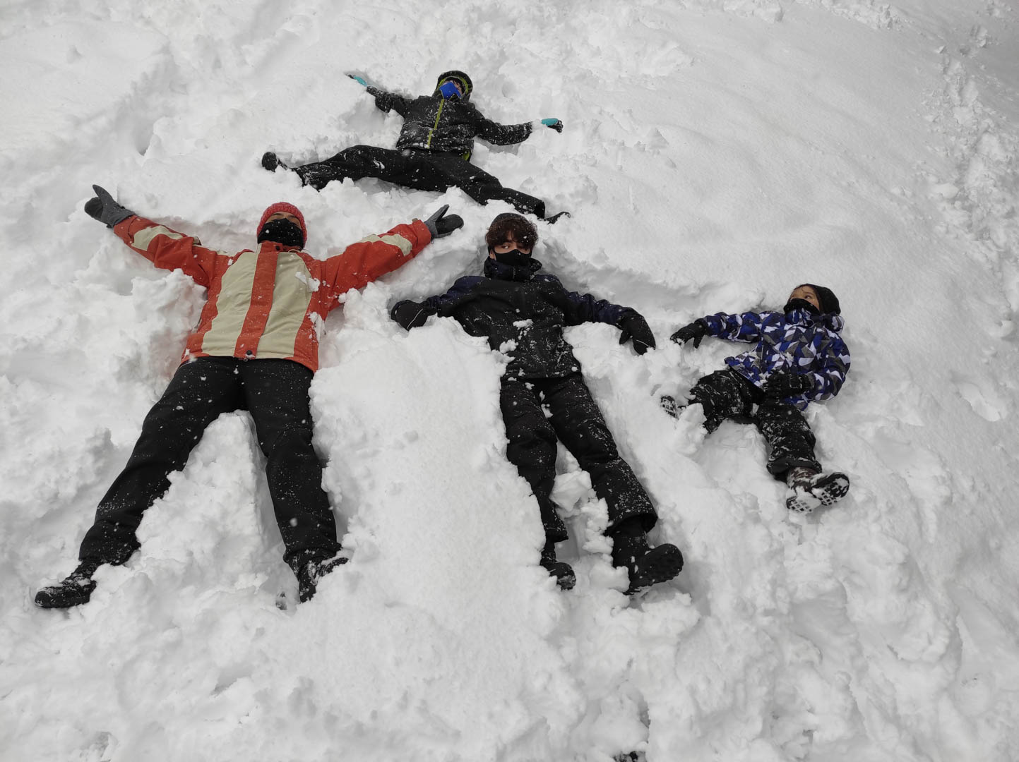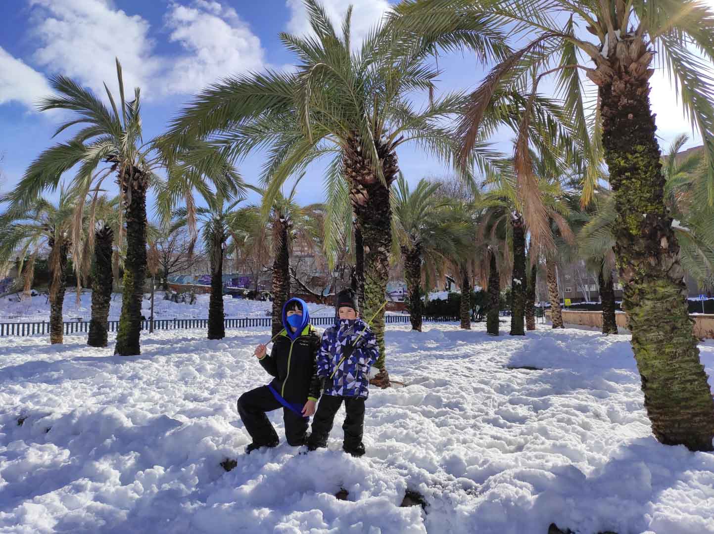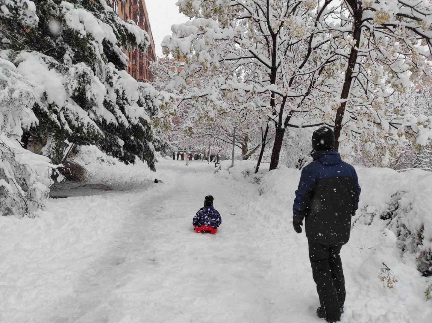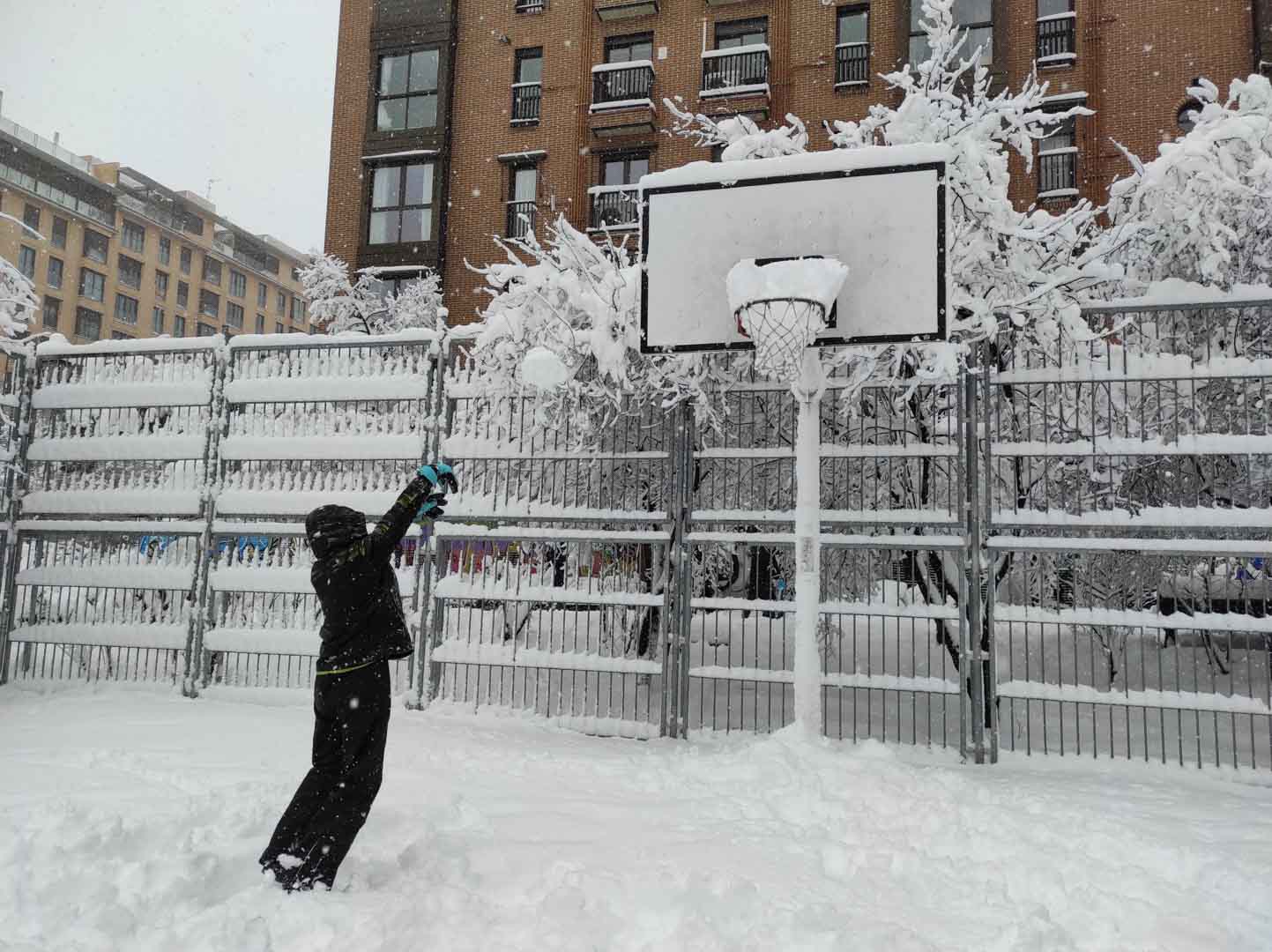 A madridi gyerekek között biztosan sokan voltak, akik most láttak először havat. A mi gyerekeink hozzá vannak szokva a hóhoz, hiszen járunk Magyarországra és néha síelni is. Nagyon szeretik és különös érzés volt nekik bent Madridban szánkót húzva síruhában és hócsizmában közlekedni. A kosárpályán hógolyóval kosaraztak és szó szerint fejest ugrottak a jó mély hóba.