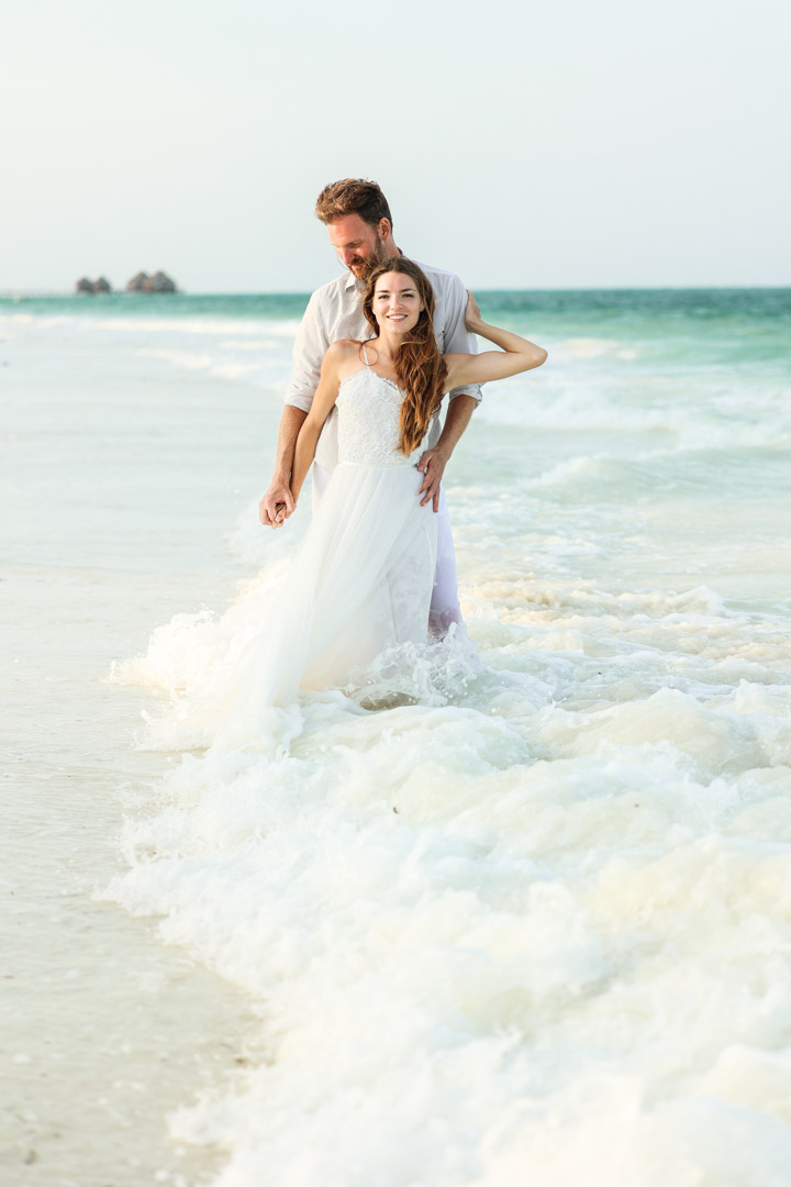 Az előző fotózáson azt az utasítást adtam nekik, hogy nyugodtan “spontánkodjanak”, öleljék, puszilják egymást. Megszólal és mondja, hogy ő most egy elég spontán dologgal készült és elővett a táskájából egy eljegyzési gyűrűt. Nagyon meglepett és nagyon örültem, hogy lefotózhatom nekik ezt a pillanatot. Igyekeztem burkolni az örömöm, hogy Daniella ne sejtsen semmit. A fotózás végén megadtam a jelet, tisztes távolból követtem az eseményeket a 70-200-as objektívemmel. A helyszínünk a Zawadi hotel hófehér homokos partja volt, majd onnan egy sétányon be az óceánba, amit már a hullámok beleptek. Beszéljenek tovább a fotók!