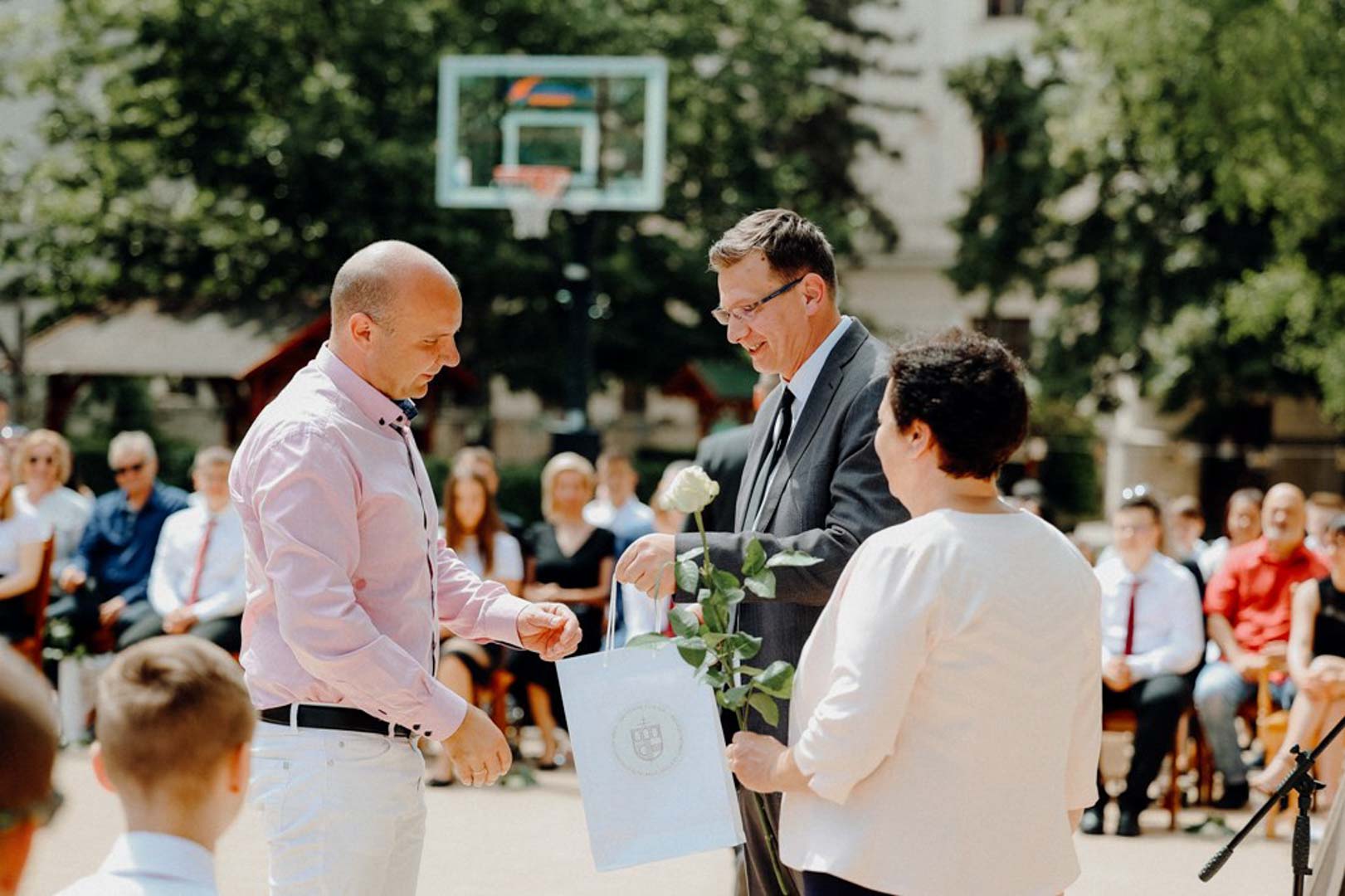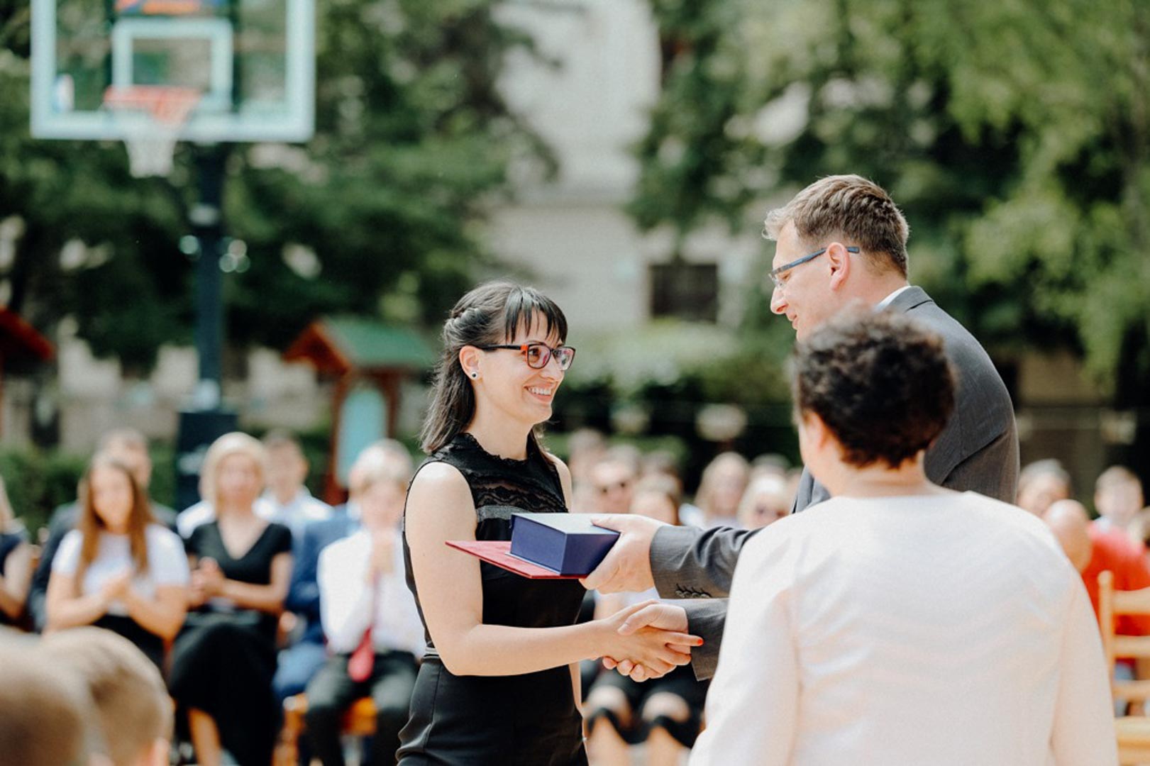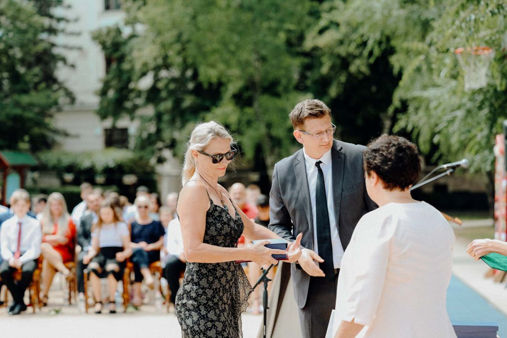 A Gyakorlóintézményben a idei évben a járványügyi helyzetre tekintettel osztályközösségekben szervezik a tanévzáró ünnepélyt. A legrangosabb elismerések így a ballagáson kerültek átadásra. Dr. Benczéné Kardos Karola a Bóbita Alapítvány elnöke, Bajomi-Nagy Éva igazgatóhelyettes és Bíró Gyula intézményvezető adta át az idei elismeréseket.