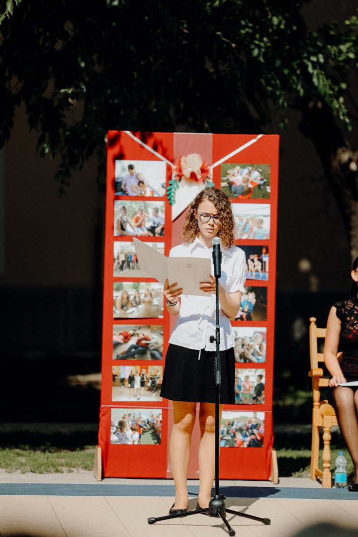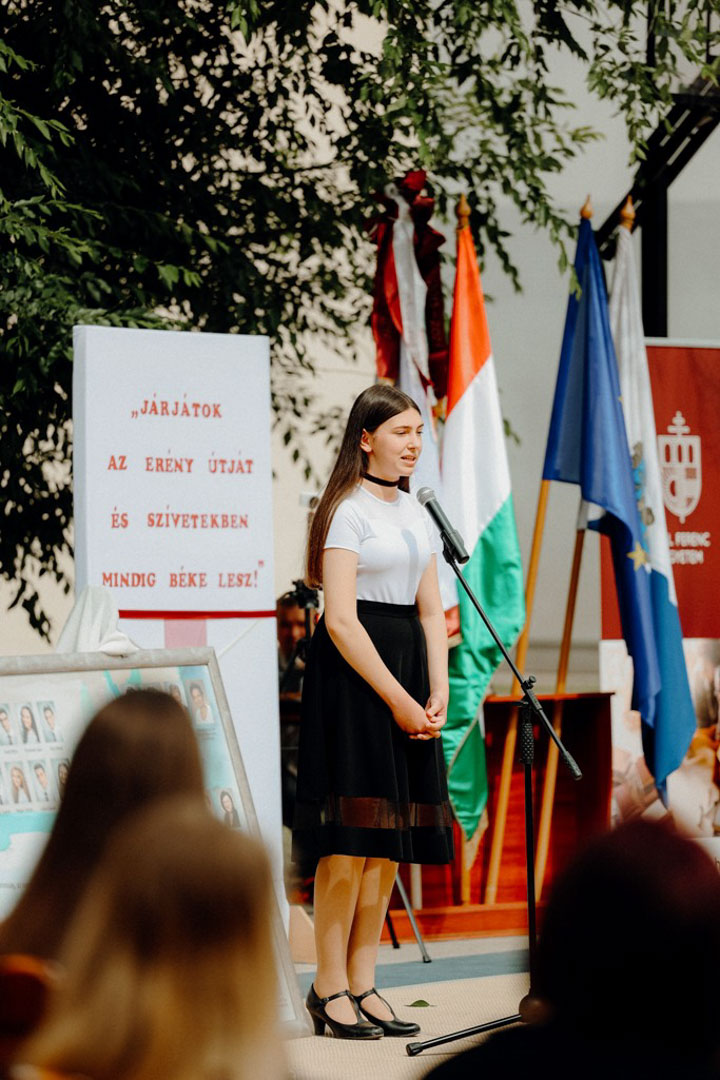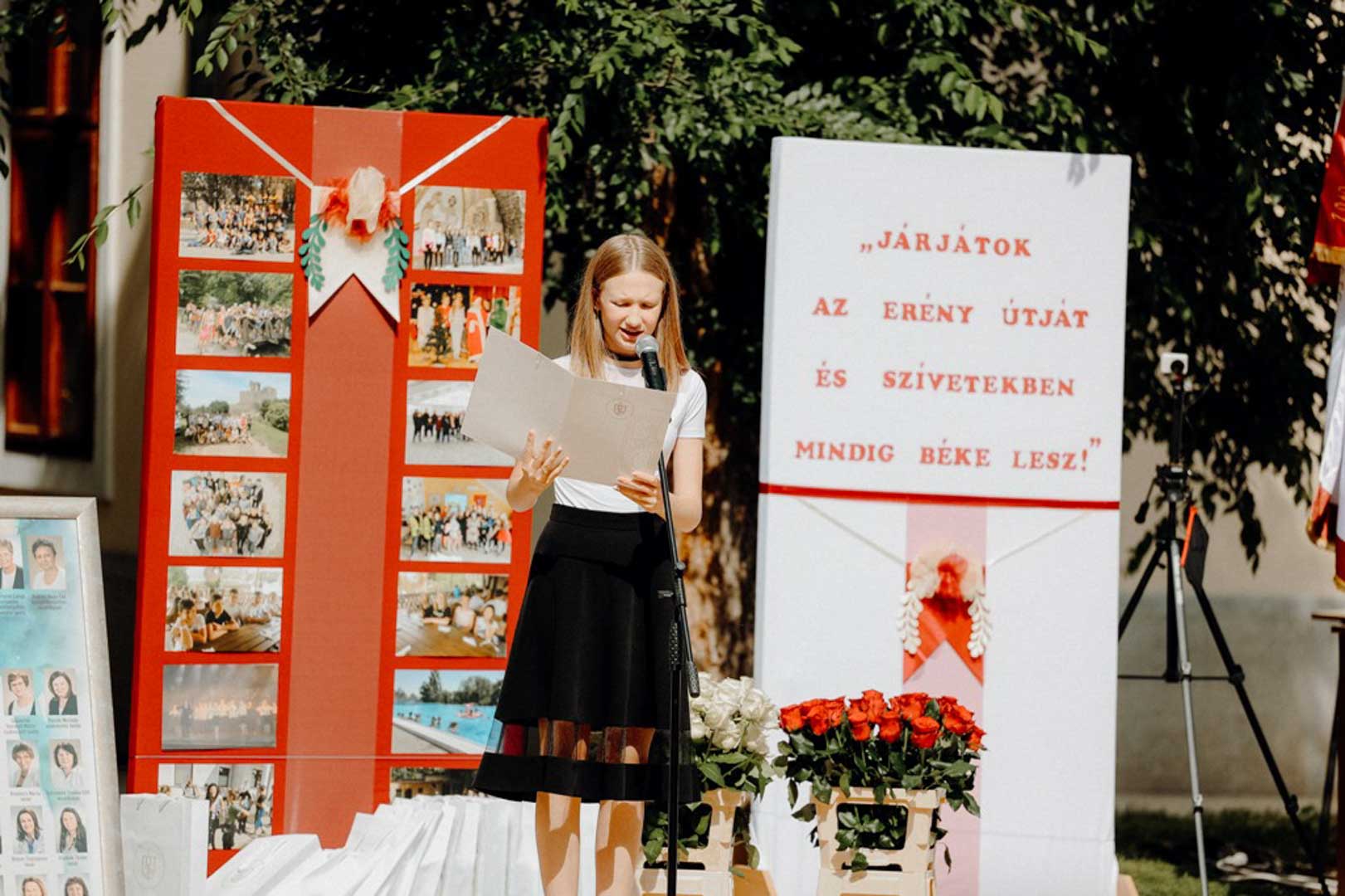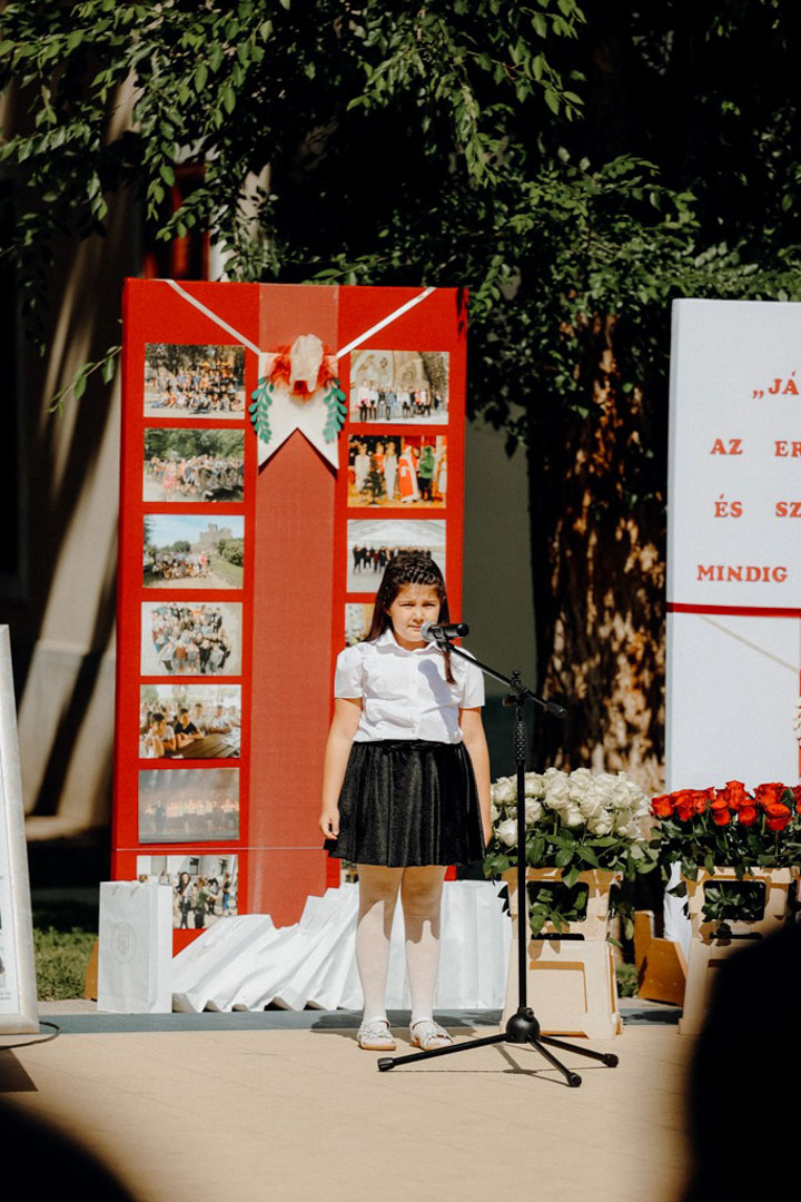 Nieddu Azzurra és Magyar Maja első osztályos tanulók verssel búcsúztak az elköszönő osztálytól. A hetedik osztály szívhez szóló érzés-szólamokat tolmácsolt Sass Péter és Diviki Anett búcsúzójában. Pachelbel: Kánon and Gigue című aláfestő darabja meghozta az első könnycseppeket szeretetközösségünkbe. Csapó Sára negyedik osztályos tanuló Szabó T. Anna Belső mosoly című versével köszönt el az alsó tagozatosok nevében. Felcsendült Massanet: Meditation aus Thais című darabja, ami a nyolcadik osztály elköszönő gondolatainak aláfestő zenéjeként szolgált. Pljesovszki Pálma és Kis Dominik nyolcadik osztályos tanulók megfogalmazták azokat a különleges érzéseket, érzelmeket, amelyek az együtt-„lélekzés” fájó-könnyed felidézése volt. A Gyakorlósság életérzése, összhangzattana harmóniában csendült föl az elköszönő gondolatokban. Nyolcadik osztályos iskolapolgáraink egy szál vörös rózsával köszönték meg szüleiknek a szerető áldozatot, és azt, hogy nemcsak egy iskolába íratták a gyermekeiket, hanem egy családi közösségbe, egy különleges együtt dobbanó szívhangzatba, amit az óvoda és az iskola különleges együttélése ad, legtöbb gyermeknek háromtól tizennégy éves korig. Neveltjeink egy szál fehér rózsával mondtak köszönetet tanáraiknak azért a több, mint tudásért, lelki közösségért, ember-érzékenységért, amit ez az intézmény jelent számunkra.