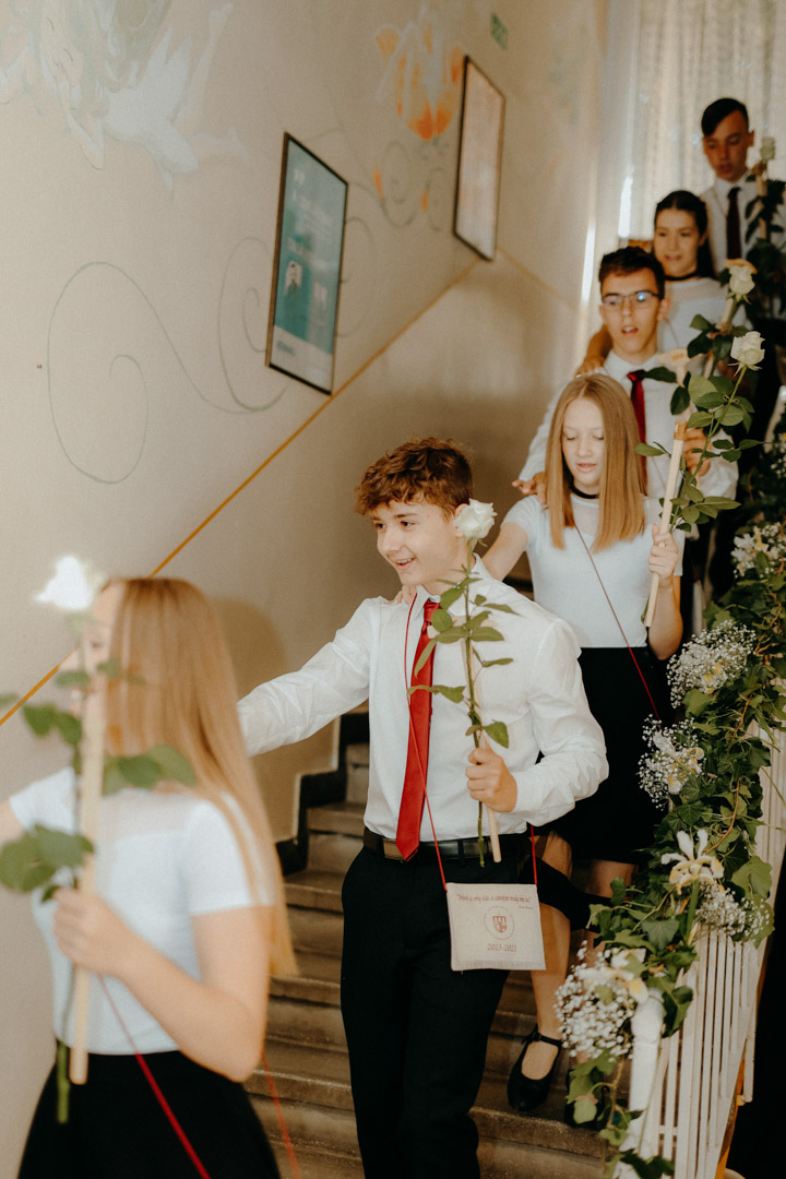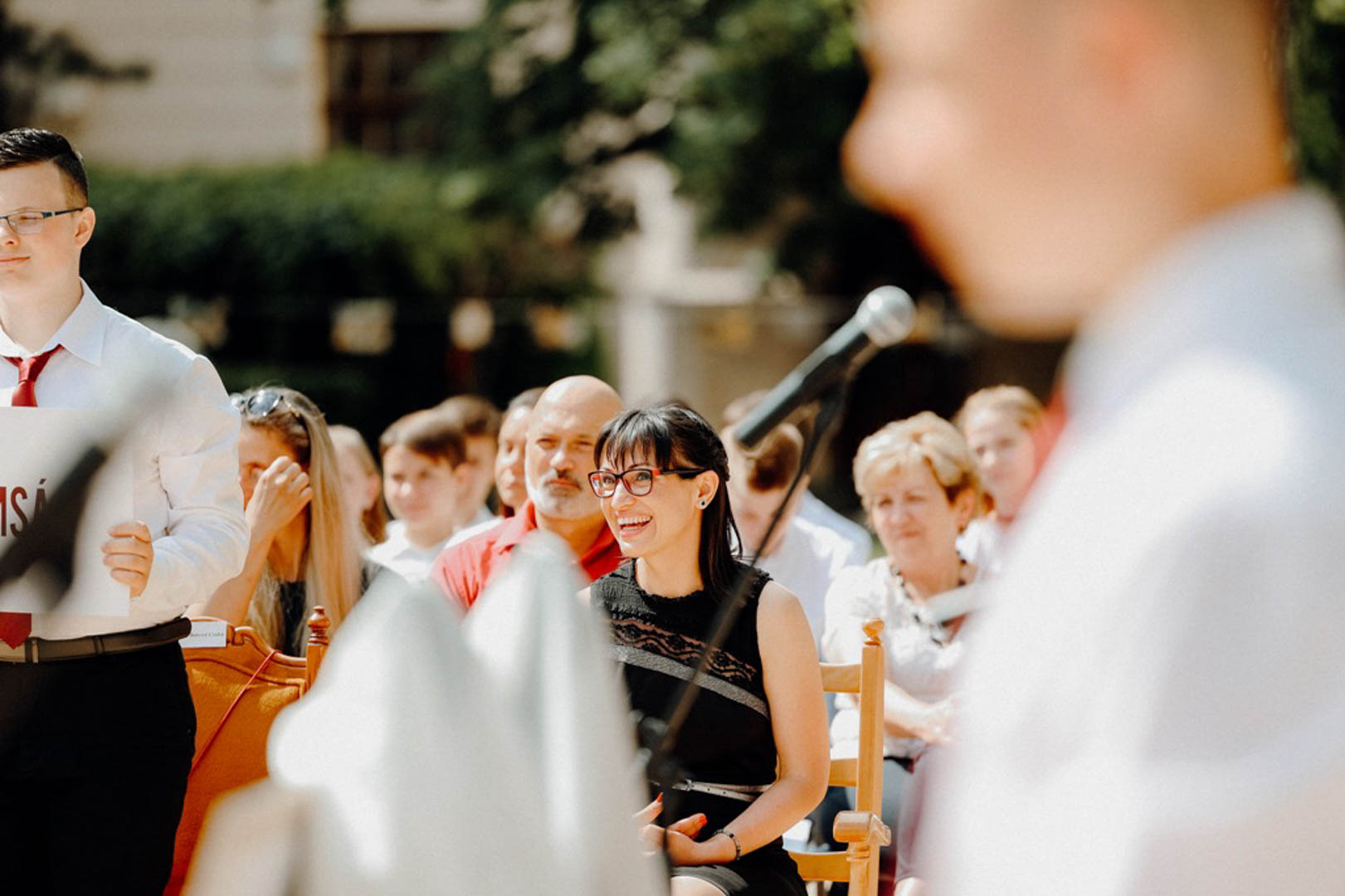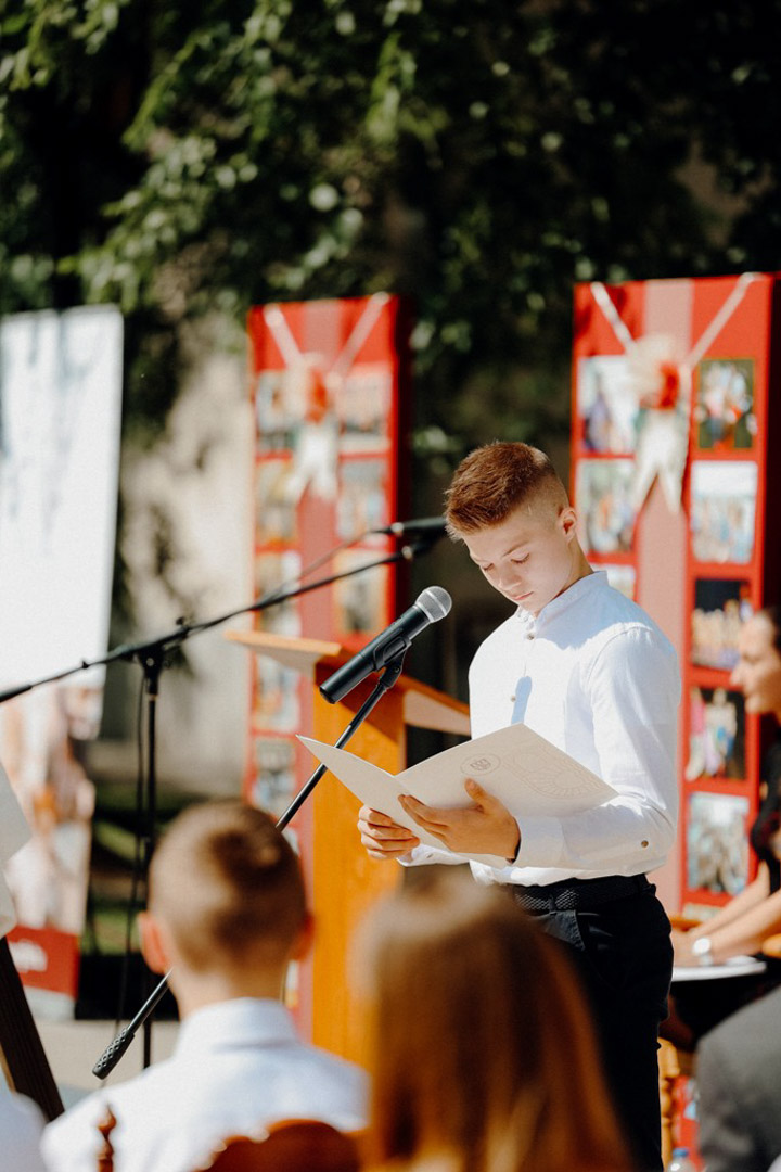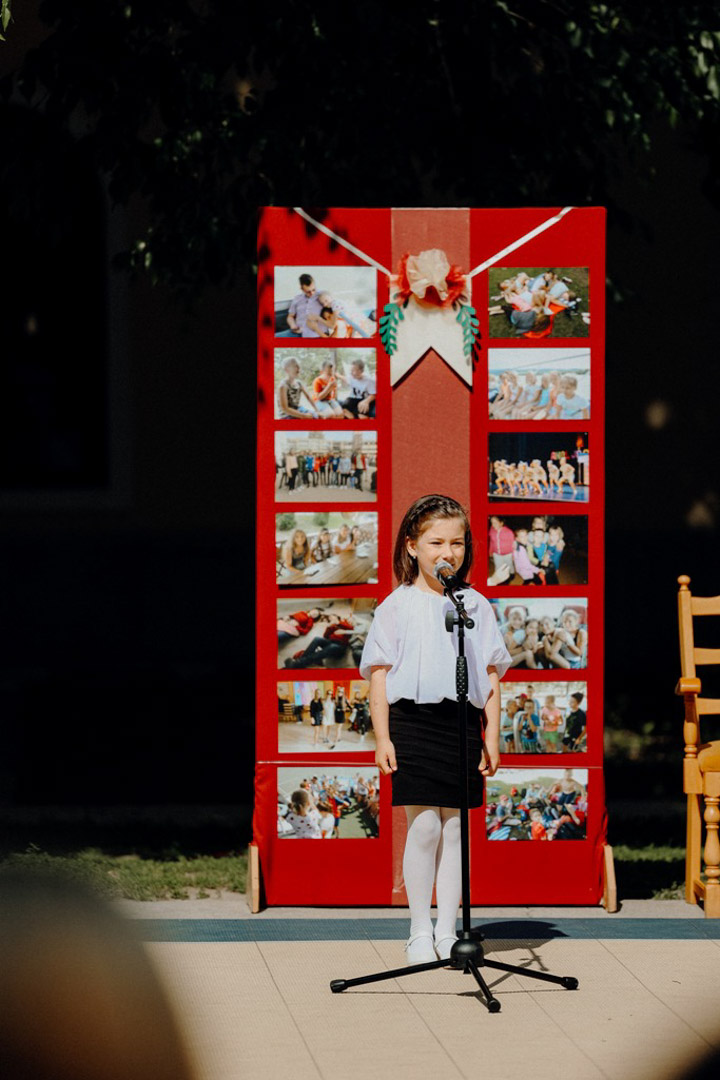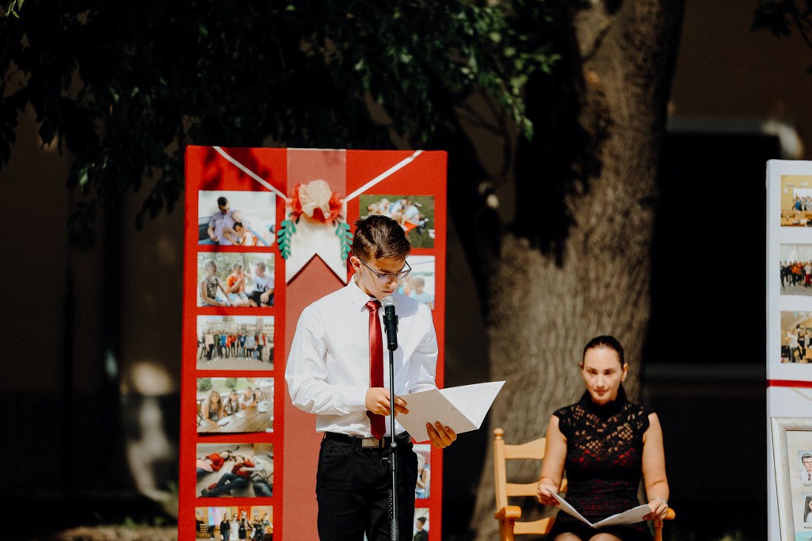 Nieddu Azzurra és Magyar Maja első osztályos tanulók verssel búcsúztak az elköszönő osztálytól. A hetedik osztály szívhez szóló érzés-szólamokat tolmácsolt Sass Péter és Diviki Anett búcsúzójában. Pachelbel: Kánon and Gigue című aláfestő darabja meghozta az első könnycseppeket szeretetközösségünkbe. Csapó Sára negyedik osztályos tanuló Szabó T. Anna Belső mosoly című versével köszönt el az alsó tagozatosok nevében. Felcsendült Massanet: Meditation aus Thais című darabja, ami a nyolcadik osztály elköszönő gondolatainak aláfestő zenéjeként szolgált. Pljesovszki Pálma és Kis Dominik nyolcadik osztályos tanulók megfogalmazták azokat a különleges érzéseket, érzelmeket, amelyek az együtt-„lélekzés” fájó-könnyed felidézése volt. A Gyakorlósság életérzése, összhangzattana harmóniában csendült föl az elköszönő gondolatokban. Nyolcadik osztályos iskolapolgáraink egy szál vörös rózsával köszönték meg szüleiknek a szerető áldozatot, és azt, hogy nemcsak egy iskolába íratták a gyermekeiket, hanem egy családi közösségbe, egy különleges együtt dobbanó szívhangzatba, amit az óvoda és az iskola különleges együttélése ad, legtöbb gyermeknek háromtól tizennégy éves korig. Neveltjeink egy szál fehér rózsával mondtak köszönetet tanáraiknak azért a több, mint tudásért, lelki közösségért, ember-érzékenységért, amit ez az intézmény jelent számunkra.