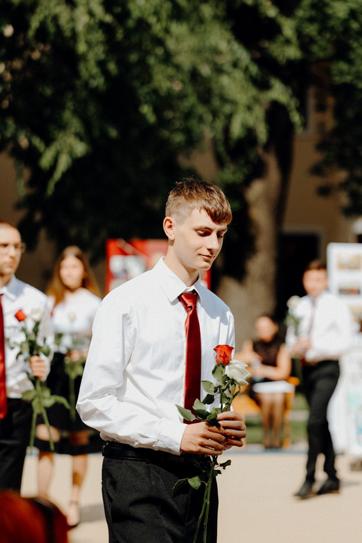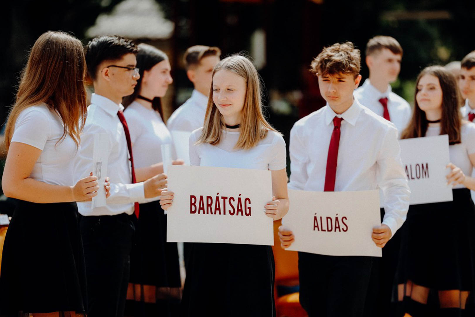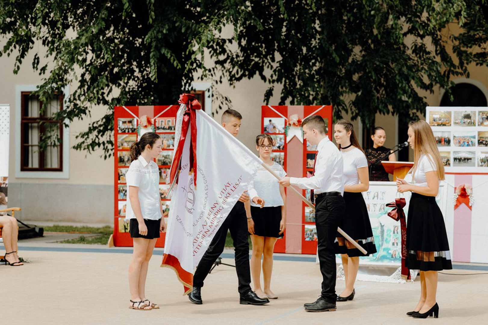 Hogy mit adtak, vagy hogy mit kaptak a nyolcadikosaink? -Bogdán Péter felvezetésével egyetlen szóban foglalták össze a ballagók a Kaukázus zenekar számára egy-egy ajándékba kapott, egy-egy örökül hagyott szóval, értékkel, érzelem-lenyomattal. A zászlóátadást követően Nieddu Roberto és Groditzki Anna nyolcadik osztályos tanulók verssel köszöntek el. Pachabel jól ismert dallamai és egy-egy mondat a búcsúzó nyolcadikosoktól a szeretet üzenetével…