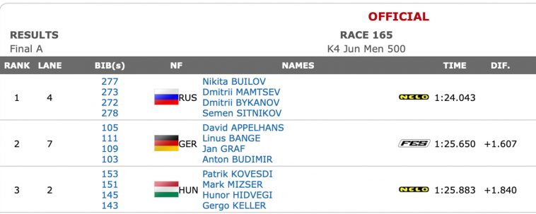 Végeredmény. Junior K-4 500 m: 1. Oroszország 1:24,043 p, 2. Németország 1:25,650, 3. Magyarország (Kövesdi Patrik, Mizsér Márk, Hídvégi Hunor, Keller Gergő) 1:25,883.