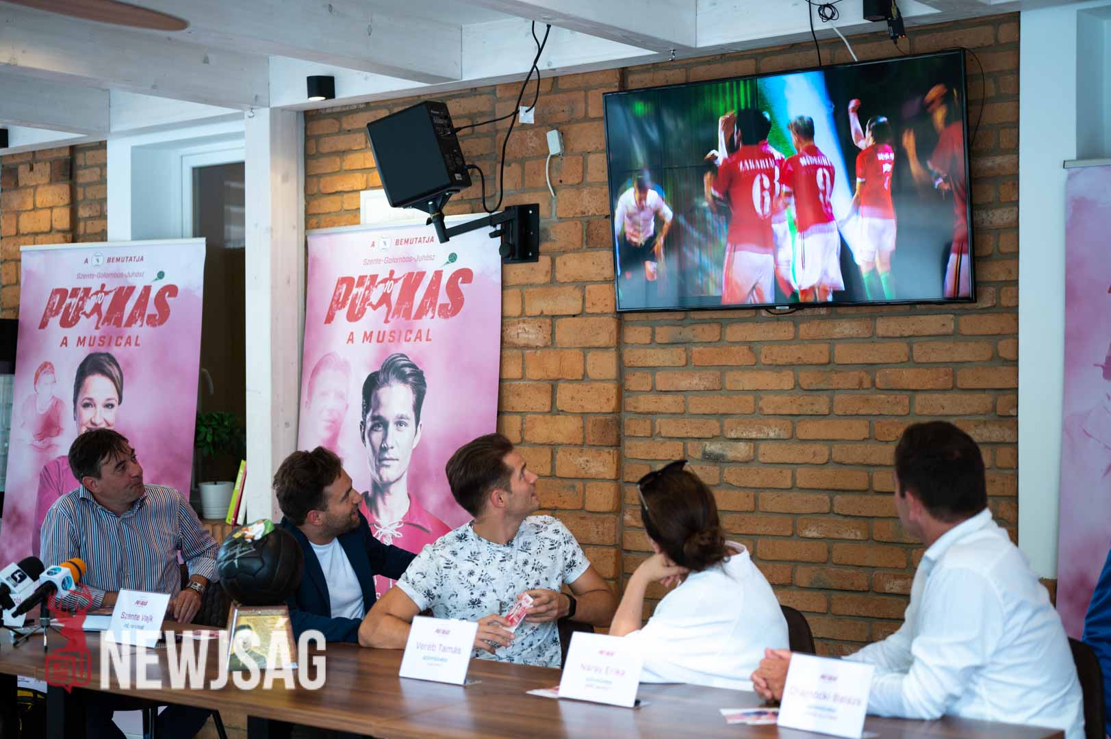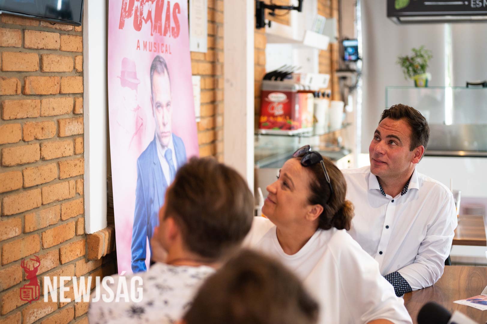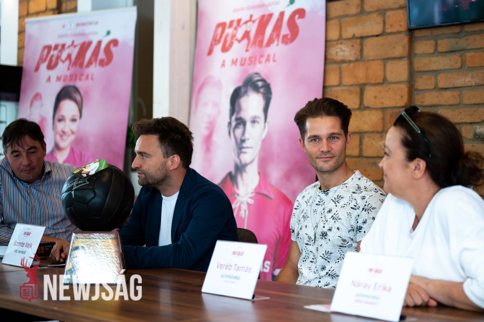 A musicalt bemutató sajtótájékoztatón jártunk a Turul kisvendéglőben, ahol Szabó László, a Puskás, a musical producere látta vendégül a darab rendezőjét, Szente Vajkot, a címszereplőt, Veréb Tamást, a Puskás Ferenc édesanyját alakító Náray Erikát, illetve a fiktív Vörös elvtárs “szemétláda” szerepében színpadra lépő Chajnóczki Balázst.