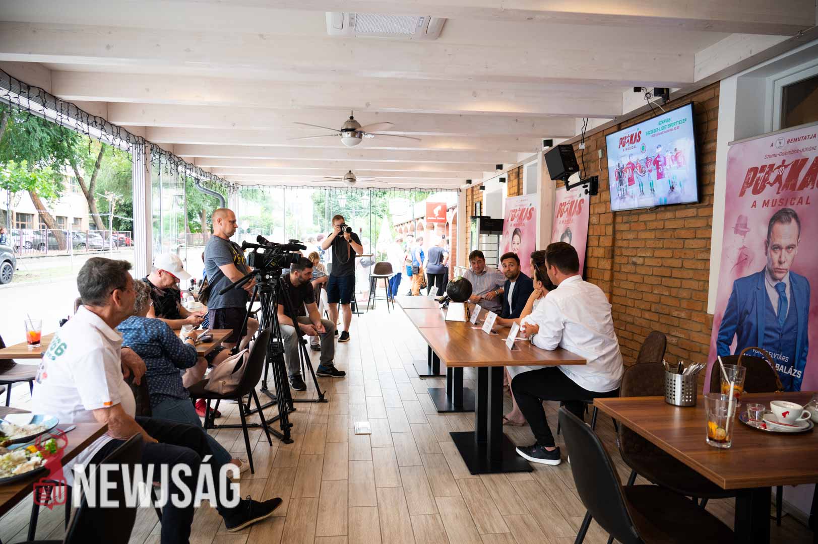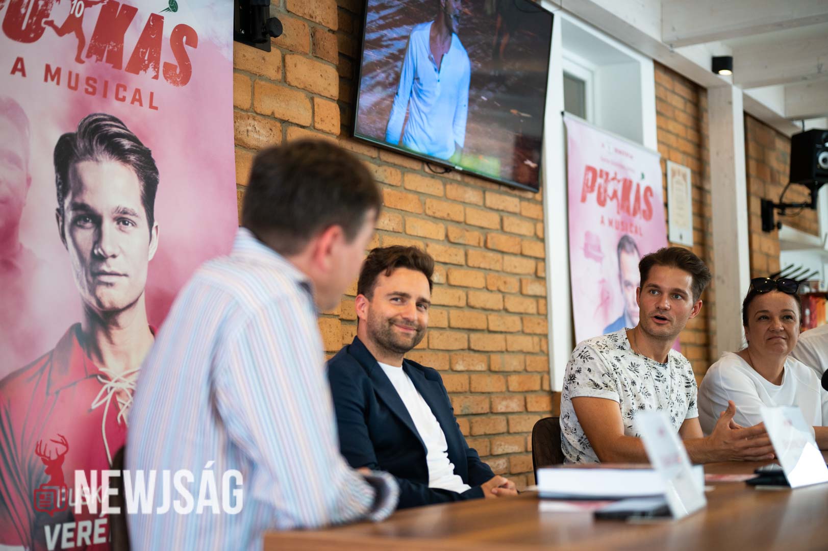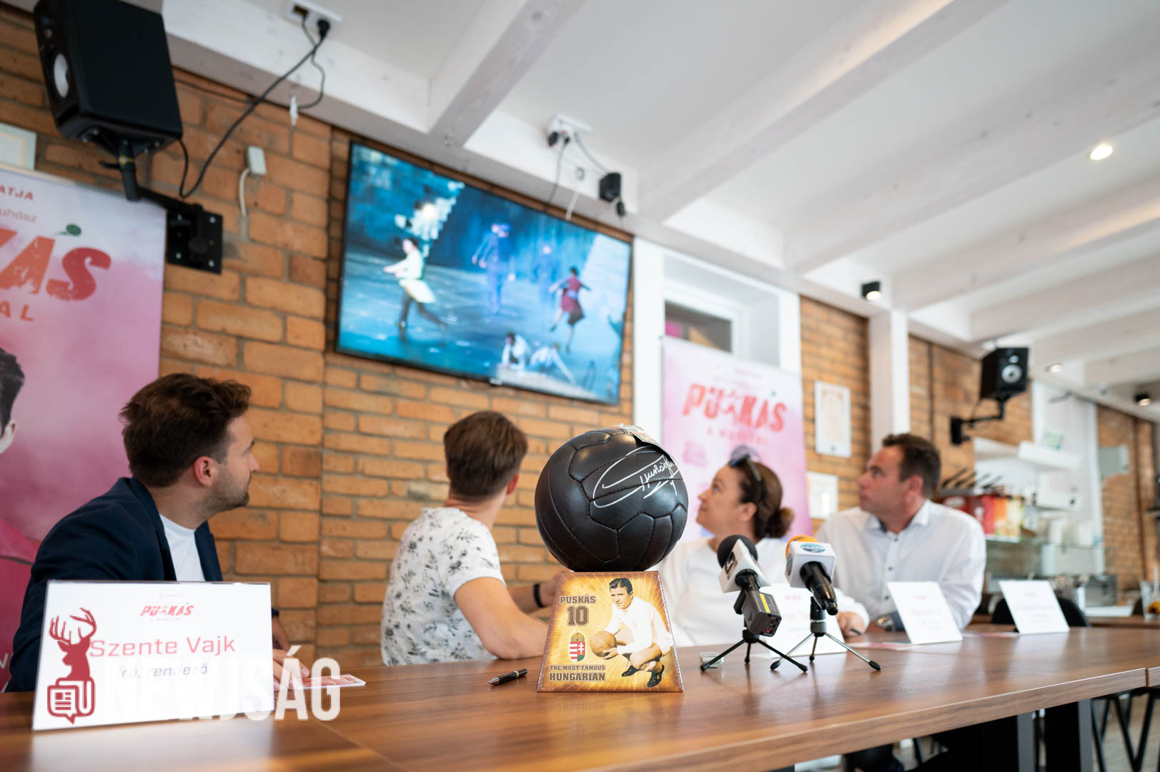 A musicalt bemutató sajtótájékoztatón jártunk a Turul kisvendéglőben, ahol Szabó László, a Puskás, a musical producere látta vendégül a darab rendezőjét, Szente Vajkot, a címszereplőt, Veréb Tamást, a Puskás Ferenc édesanyját alakító Náray Erikát, illetve a fiktív Vörös elvtárs “szemétláda” szerepében színpadra lépő Chajnóczki Balázst.
