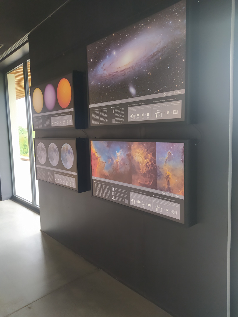 Belül ismeretterjesztő leírásokon és filmeken keresztül lehet megismerkedni a csillagászat rejtelmeivel, amelyet az asztrofotósok állandó tárlata tesz teljessé.