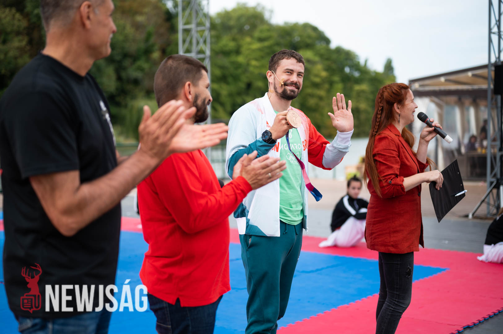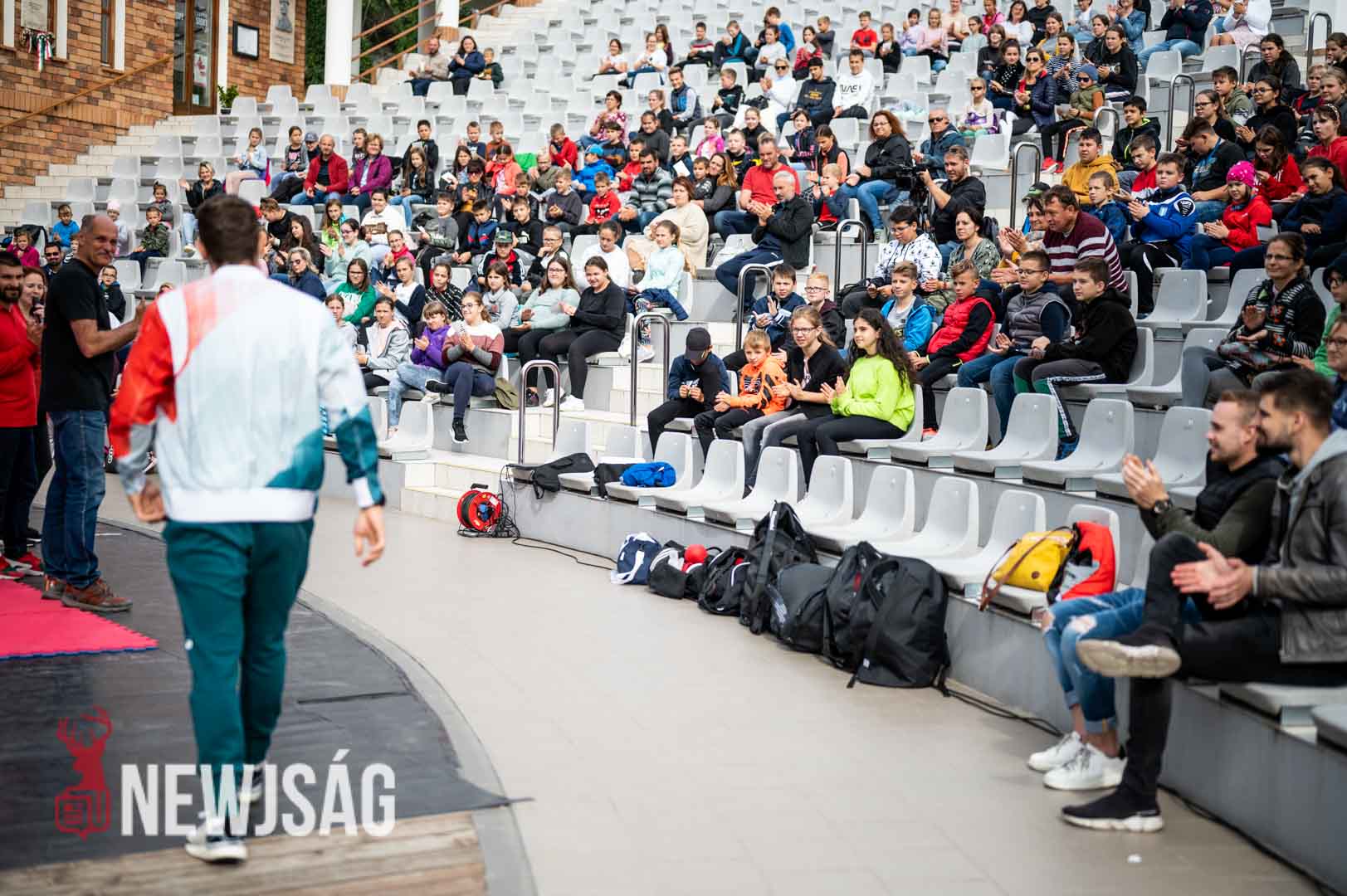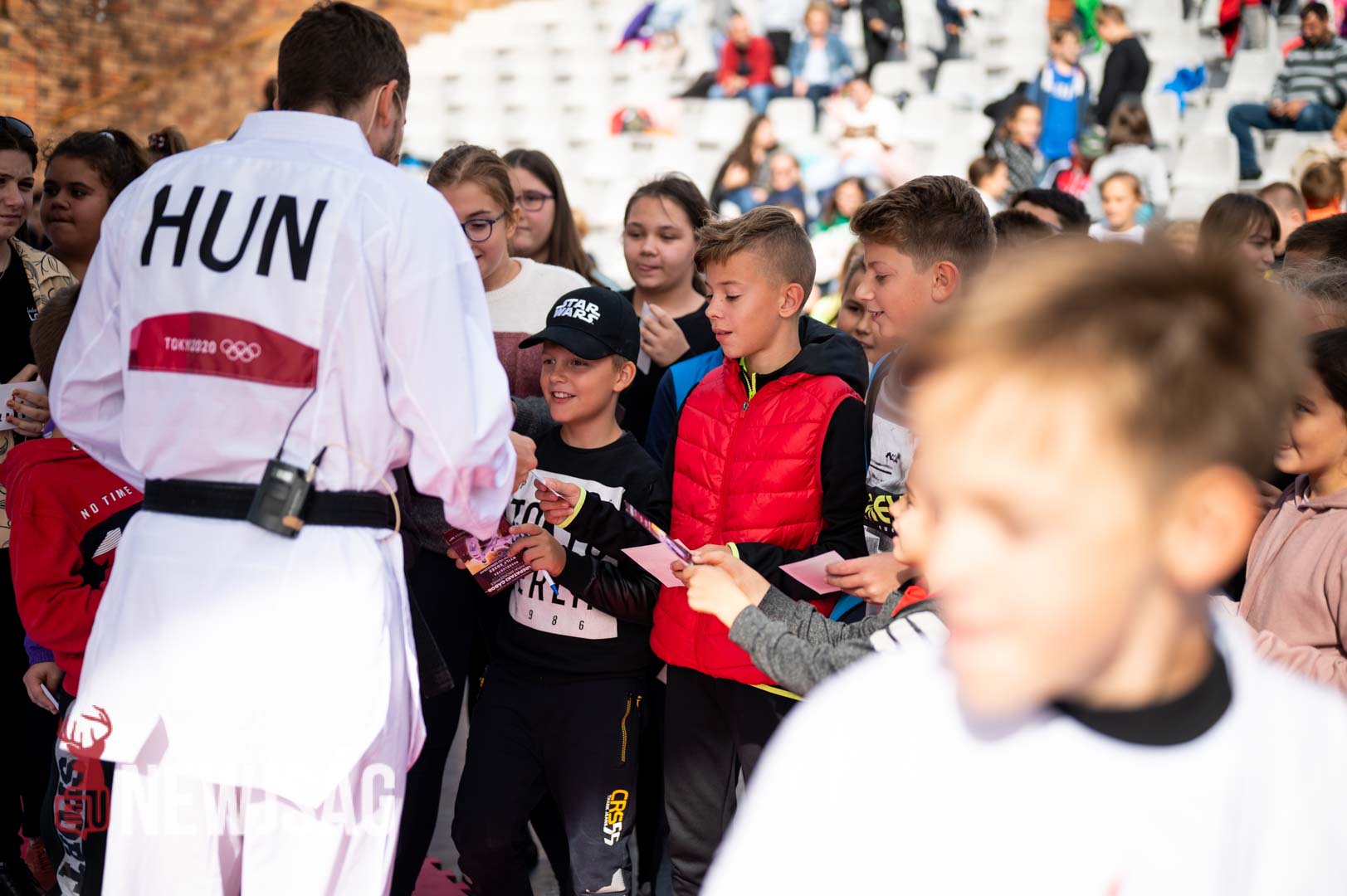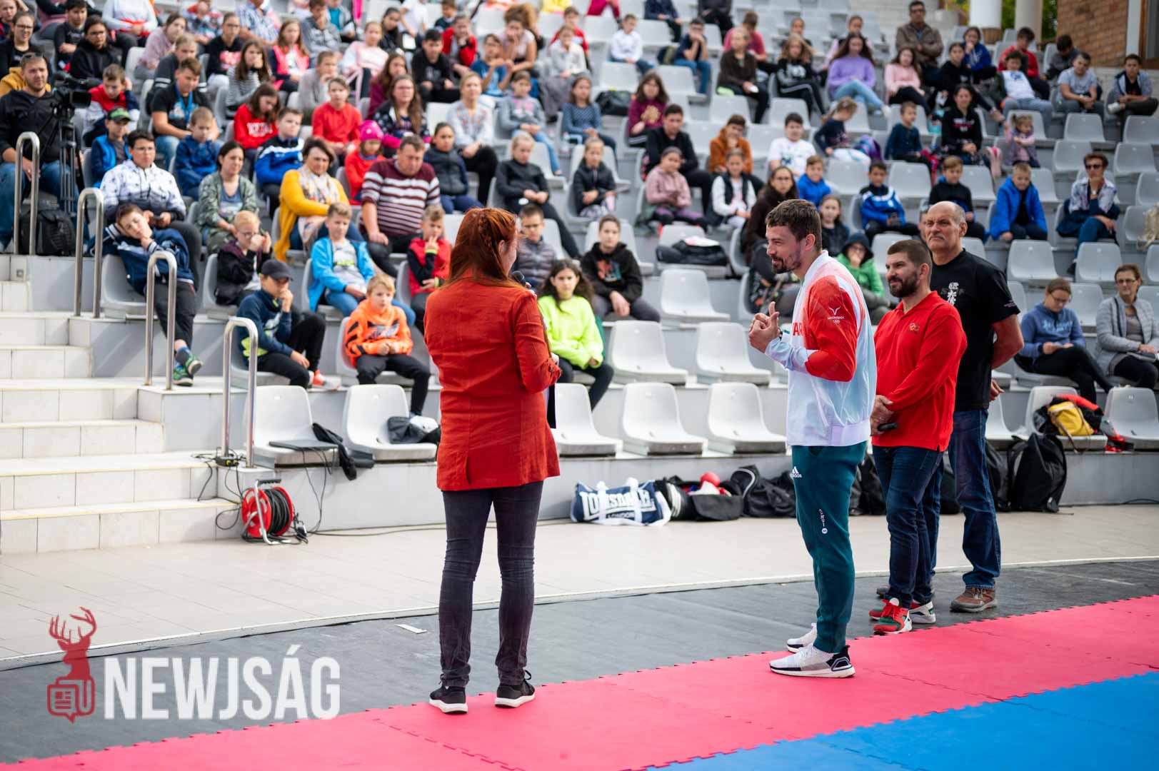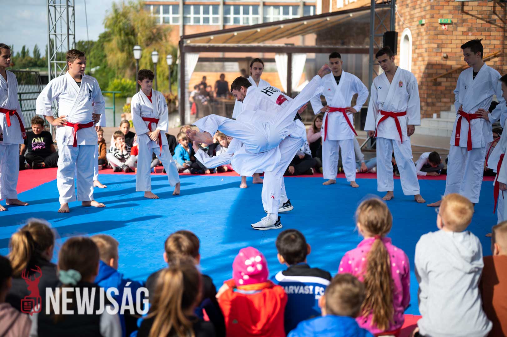Hárspataki Gábor bemutatta kedvenc elsőkezes ütését, majd a karatéban is használt dobás két technikáját. Végül a tatami szélén ülők közelről nézhették meg a bronzdöntőn Nisimura Kennek eladott fejre irányuló rúgását, amivel nyolc századdal a vége előtt megfordította a mérkőzést, és szerzett történelmi bronzot Magyarországnak.