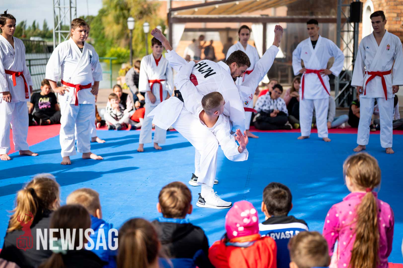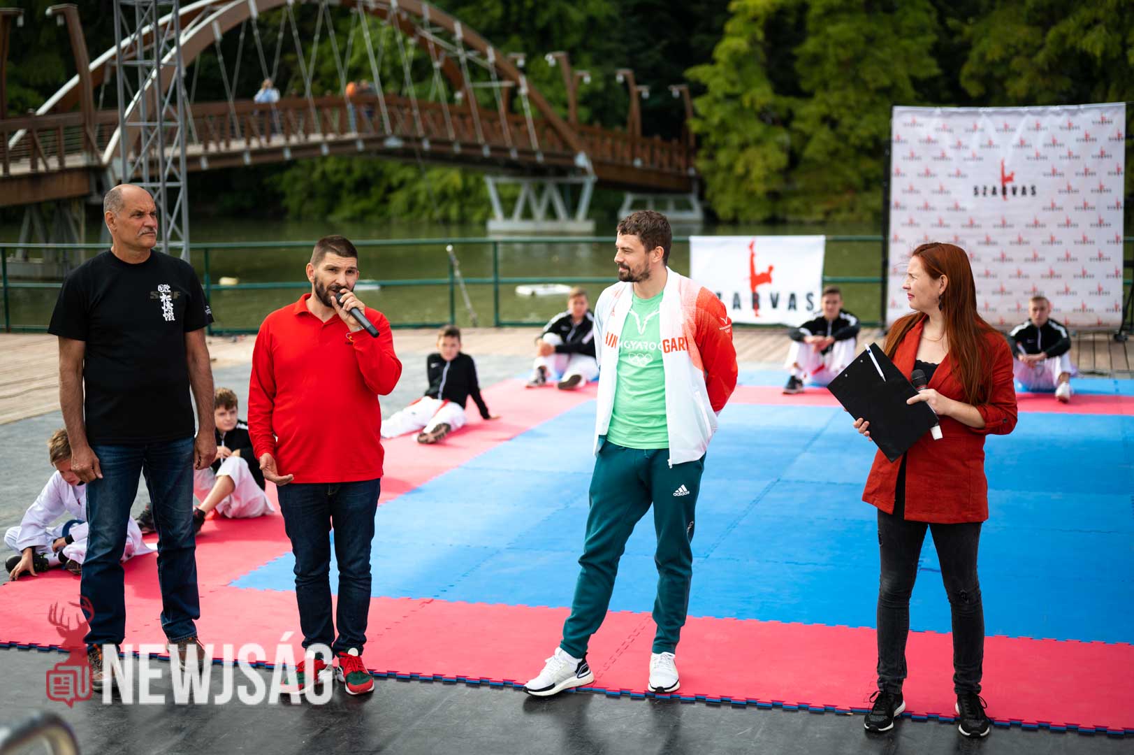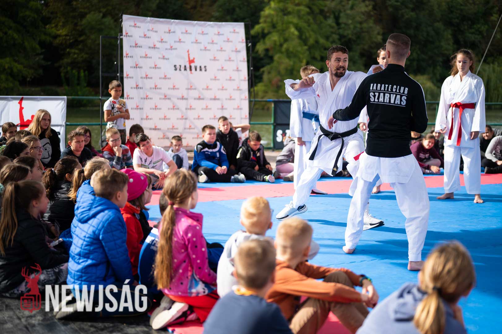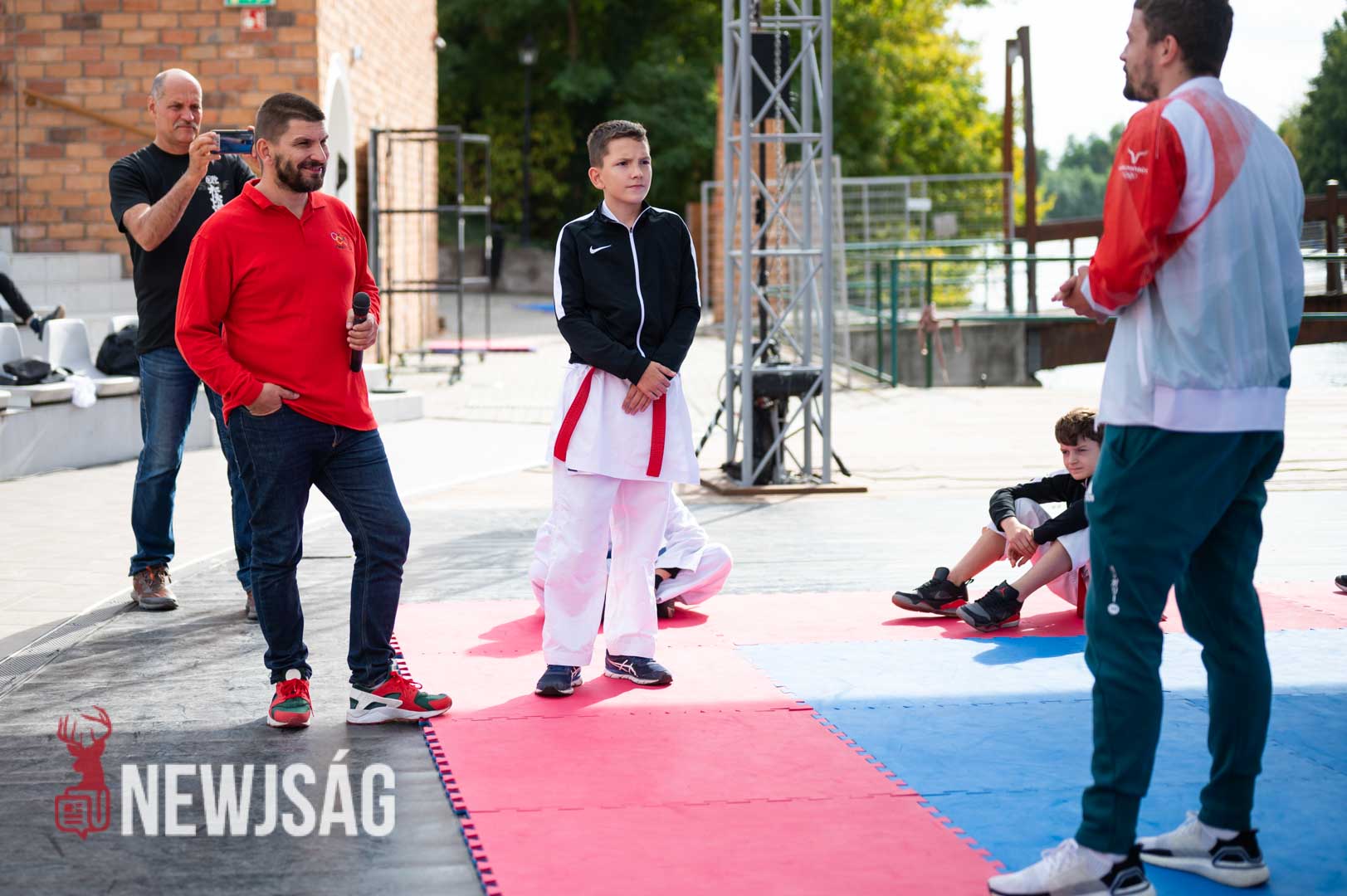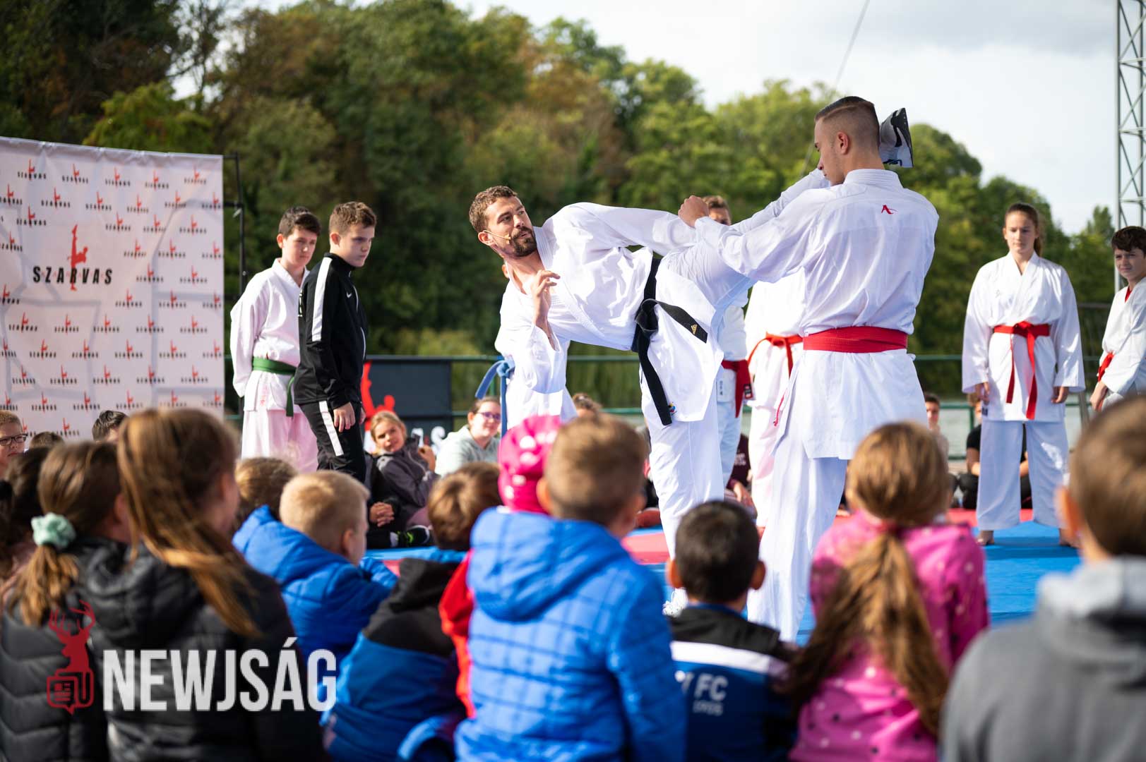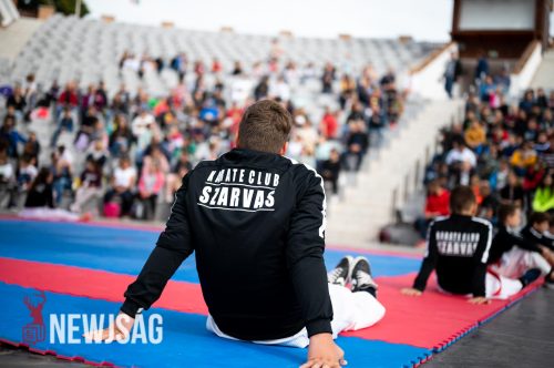 Tegnap Hárspataki Gábornak egyetlen ellenfele volt Szarvason, a szél, ami minden áron vízi sportot szeretett volna csinálni a karatéból azzal, hogy a tatamit a Körösbe fújja. A szelet a színpadi beszélgetés ideje alatt a szarvasi karatésok, majd az azt követő bemutatóedzés alatt a szélén ülő fiatalok hatástalanították.