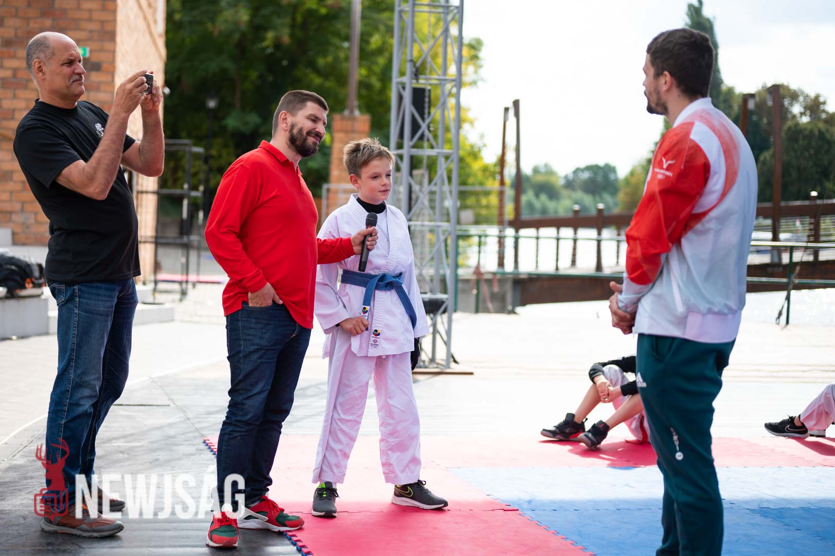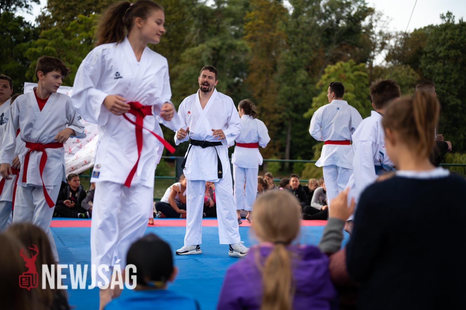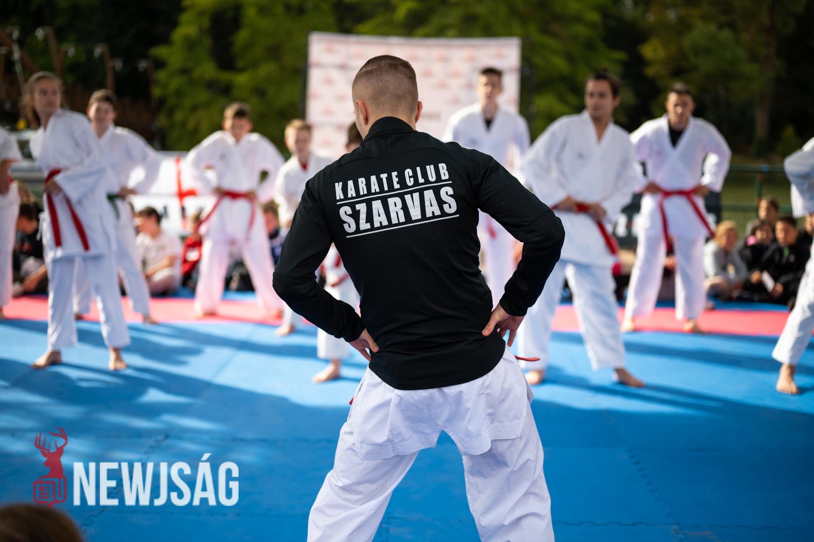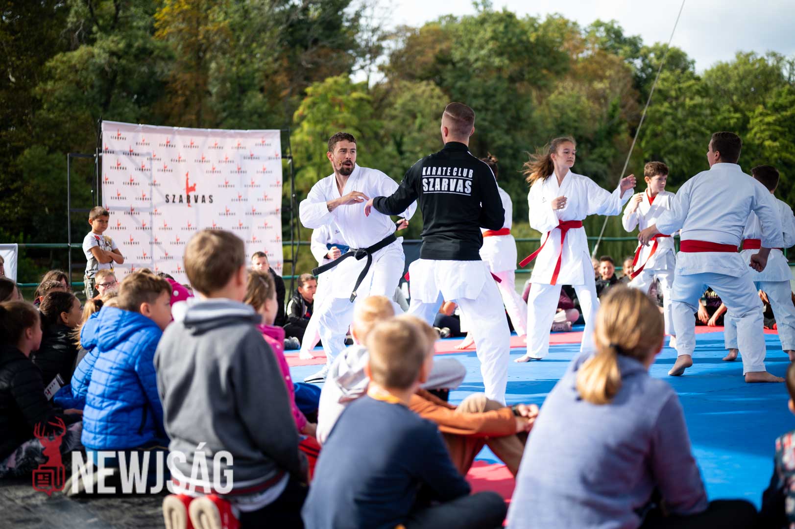 Tegnap Hárspataki Gábornak egyetlen ellenfele volt Szarvason, a szél, ami minden áron vízi sportot szeretett volna csinálni a karatéból azzal, hogy a tatamit a Körösbe fújja. A szelet a színpadi beszélgetés ideje alatt a szarvasi karatésok, majd az azt követő bemutatóedzés alatt a szélén ülő fiatalok hatástalanították.