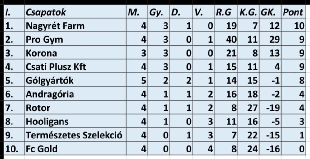 GÓLGYÁRTÓK-NAGYRÉT FARM 3-3(2-3) jv: Csicsely gólok: Stanley, Kondacs, Barta ill. Kriska 2, Viszkok