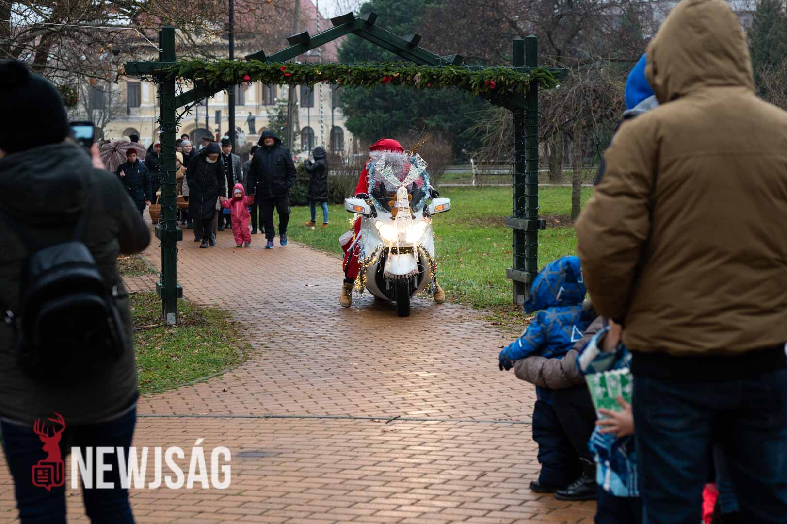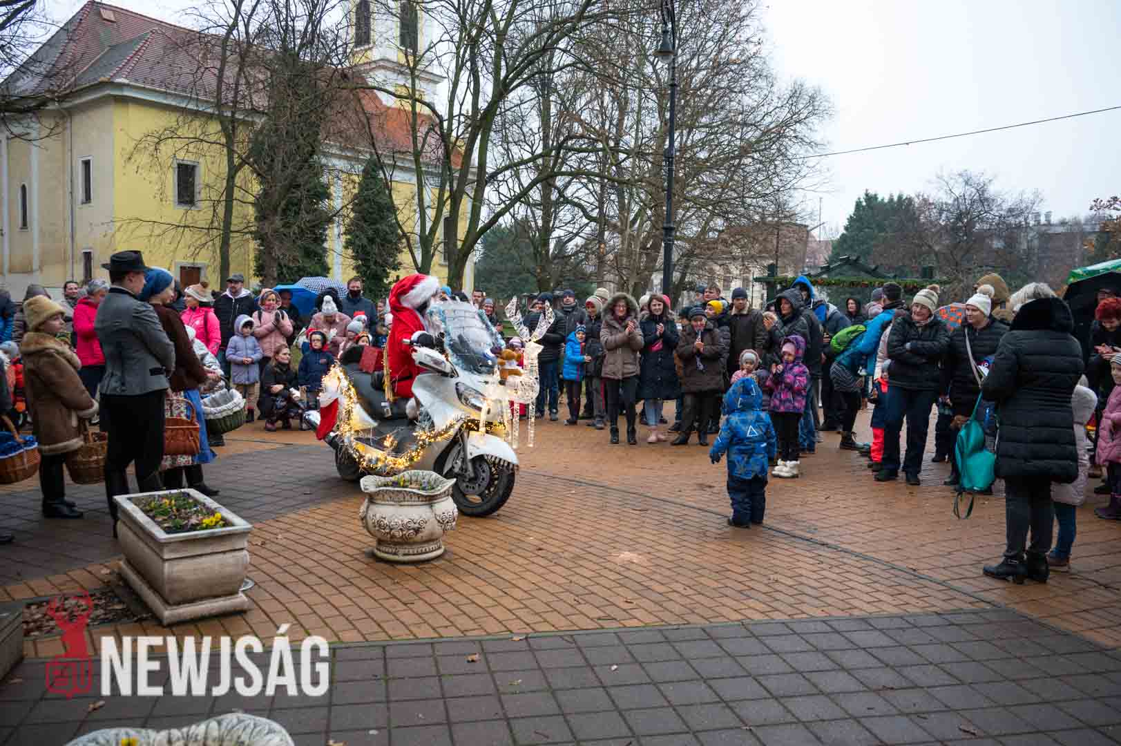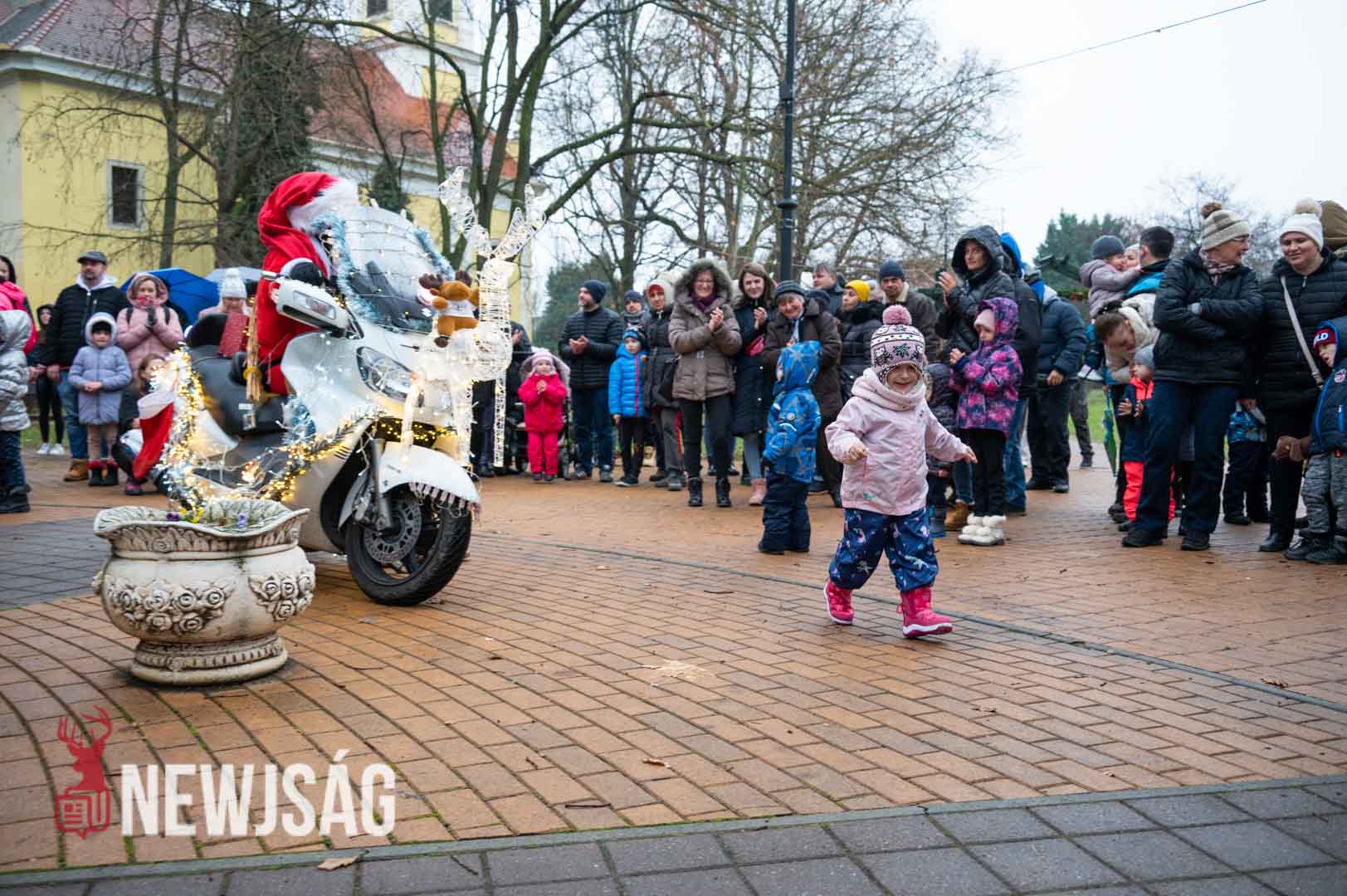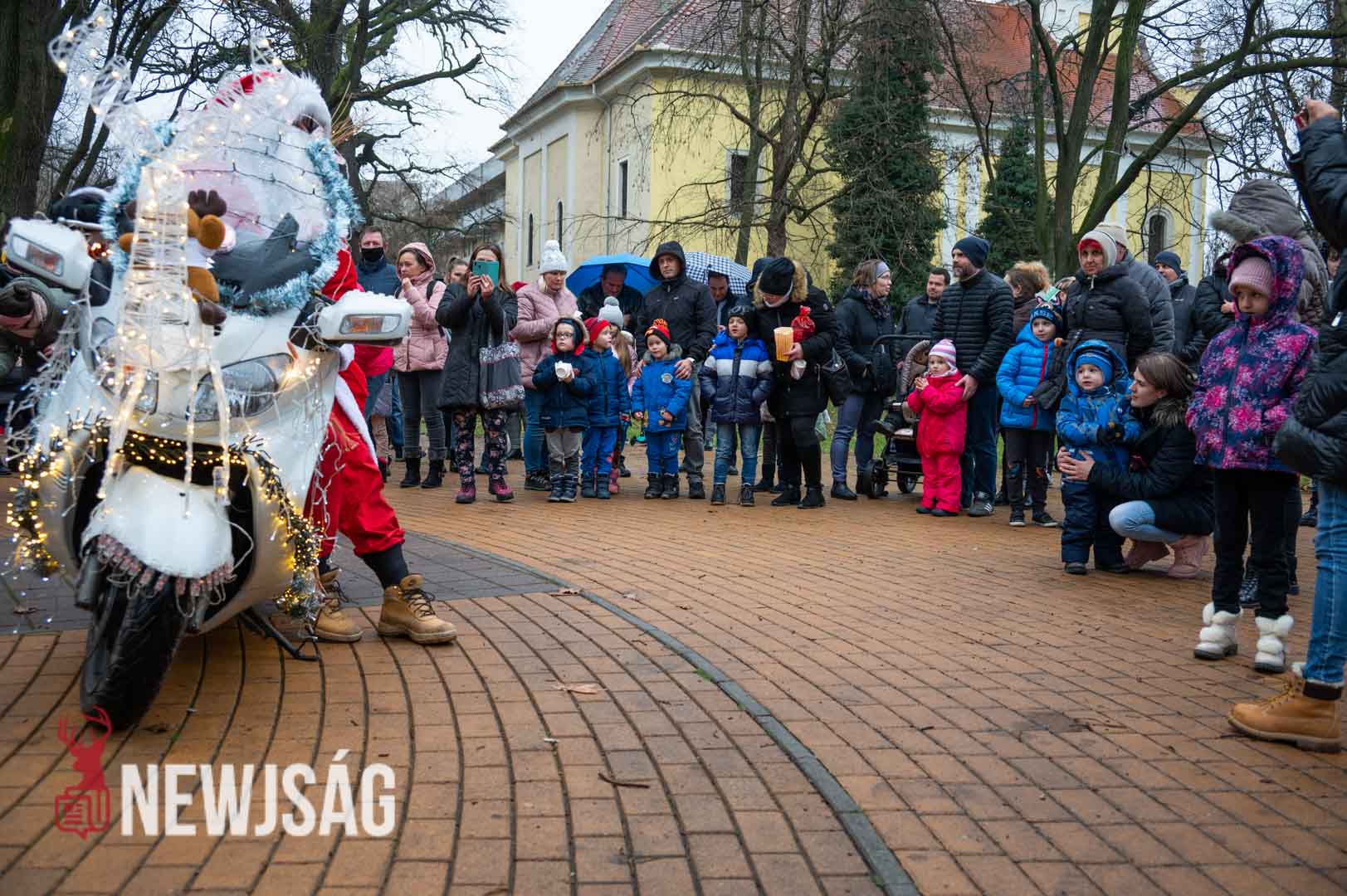 Ide érkezett a Mikulás motoron, akit Csasztvan András, a város Miklás-ügyi kapcsolattartója kért fel a színpadra Babák Mihály polgármester mellé.