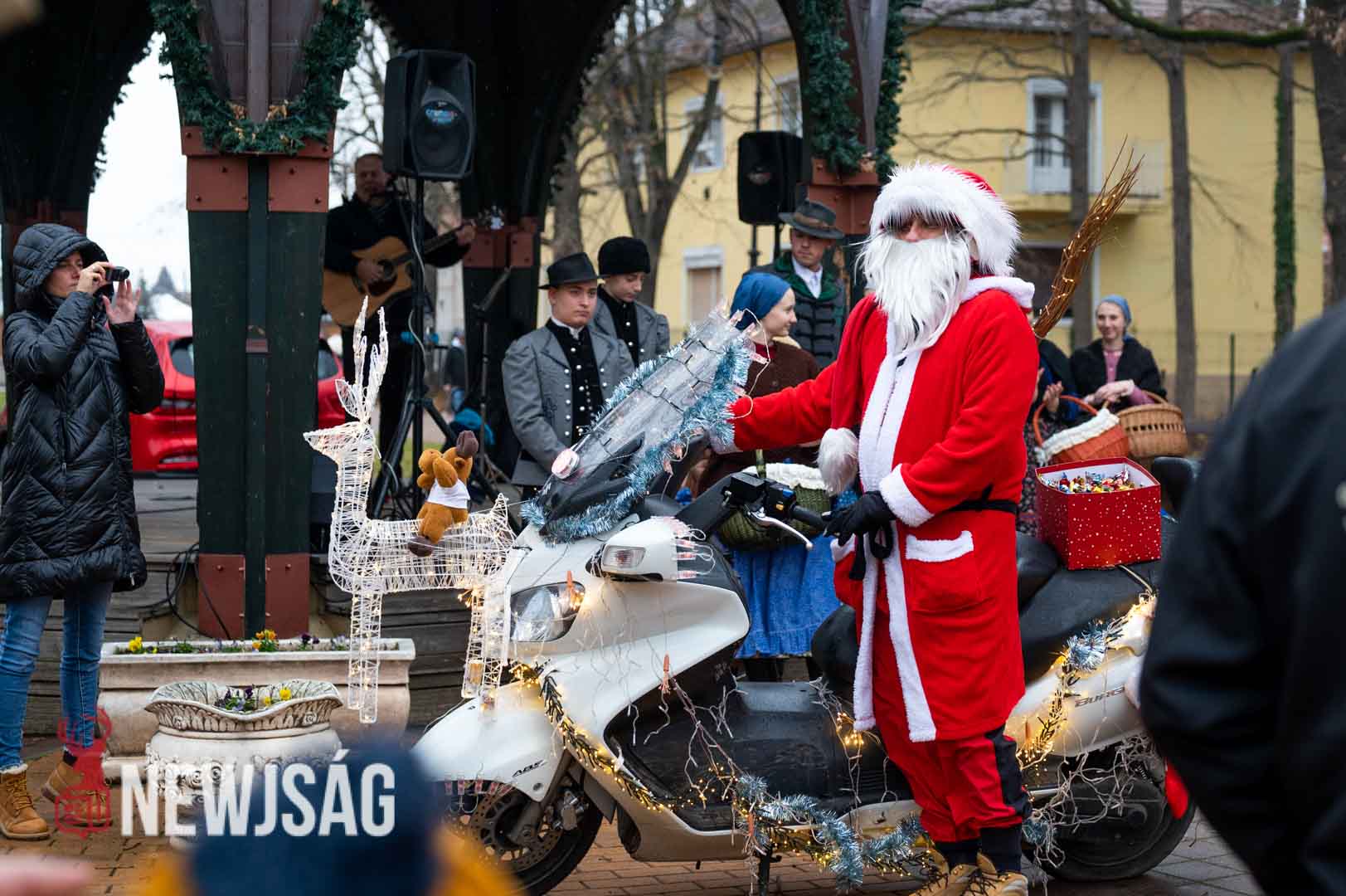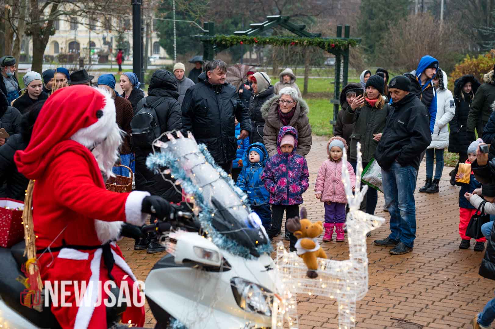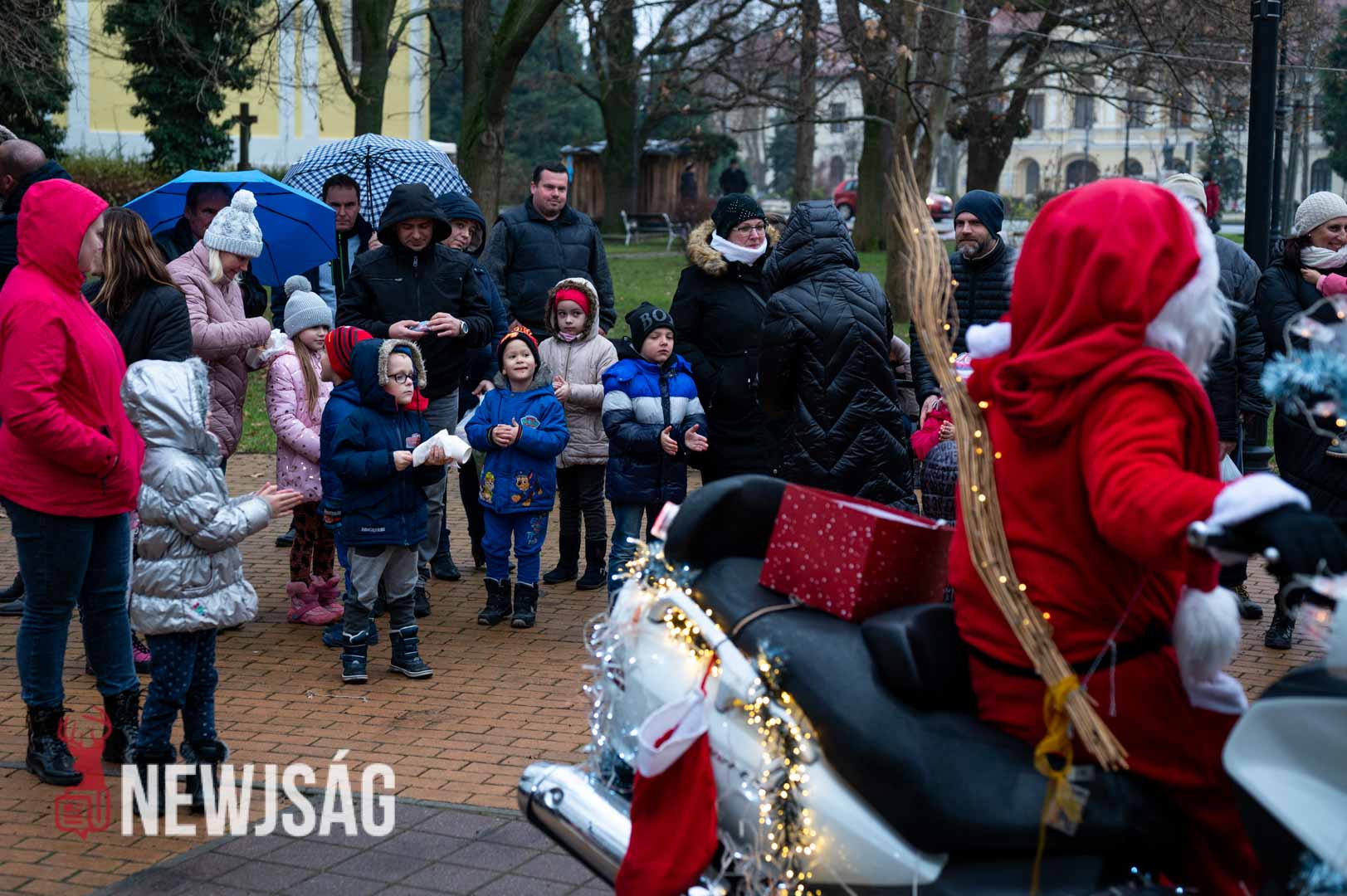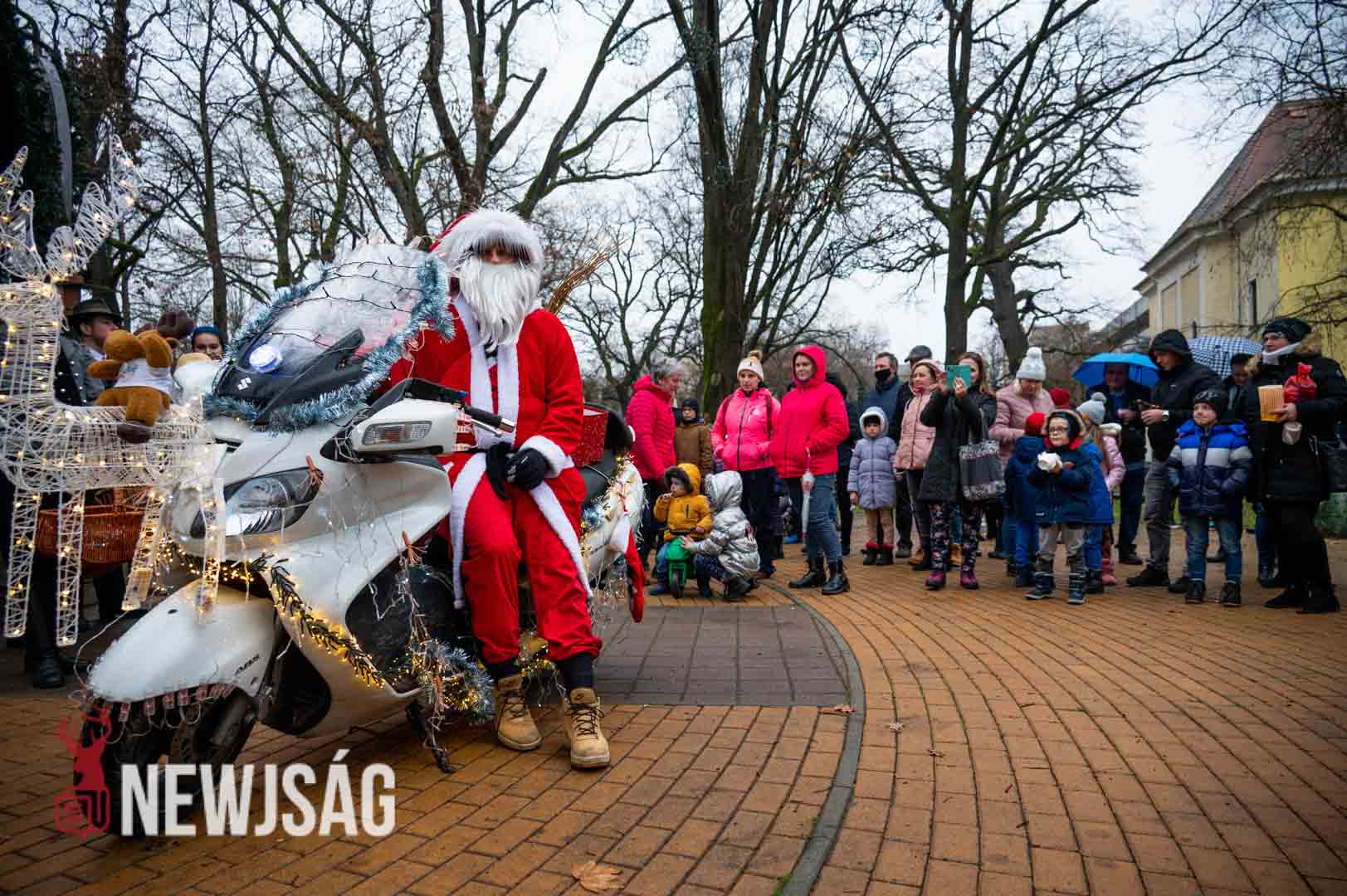 Ide érkezett a Mikulás motoron, akit Csasztvan András, a város Miklás-ügyi kapcsolattartója kért fel a színpadra Babák Mihály polgármester mellé.