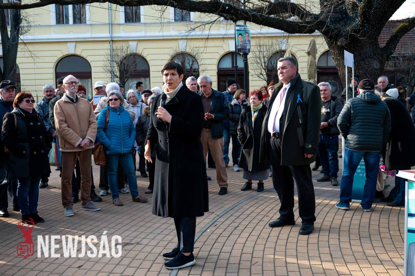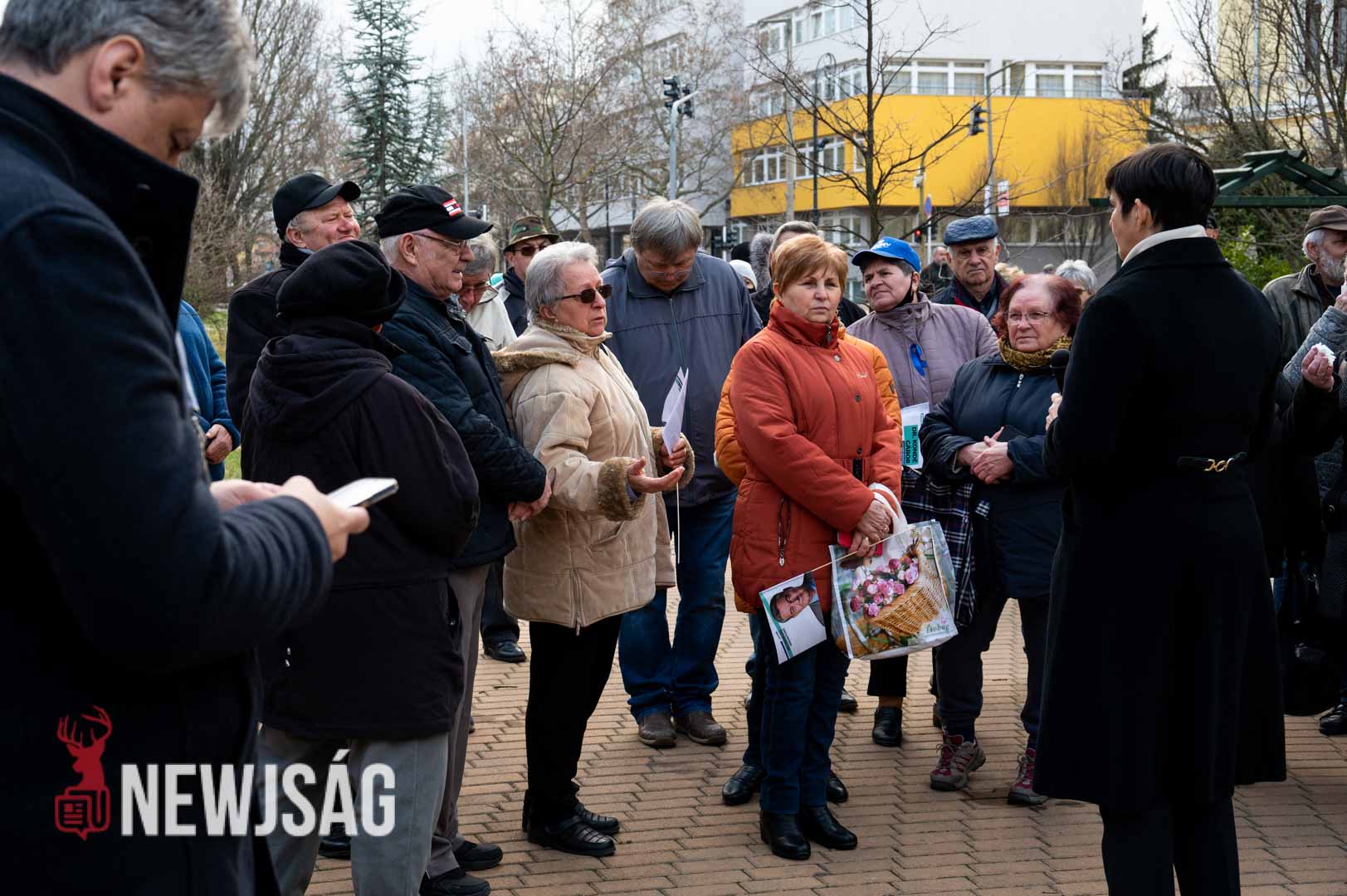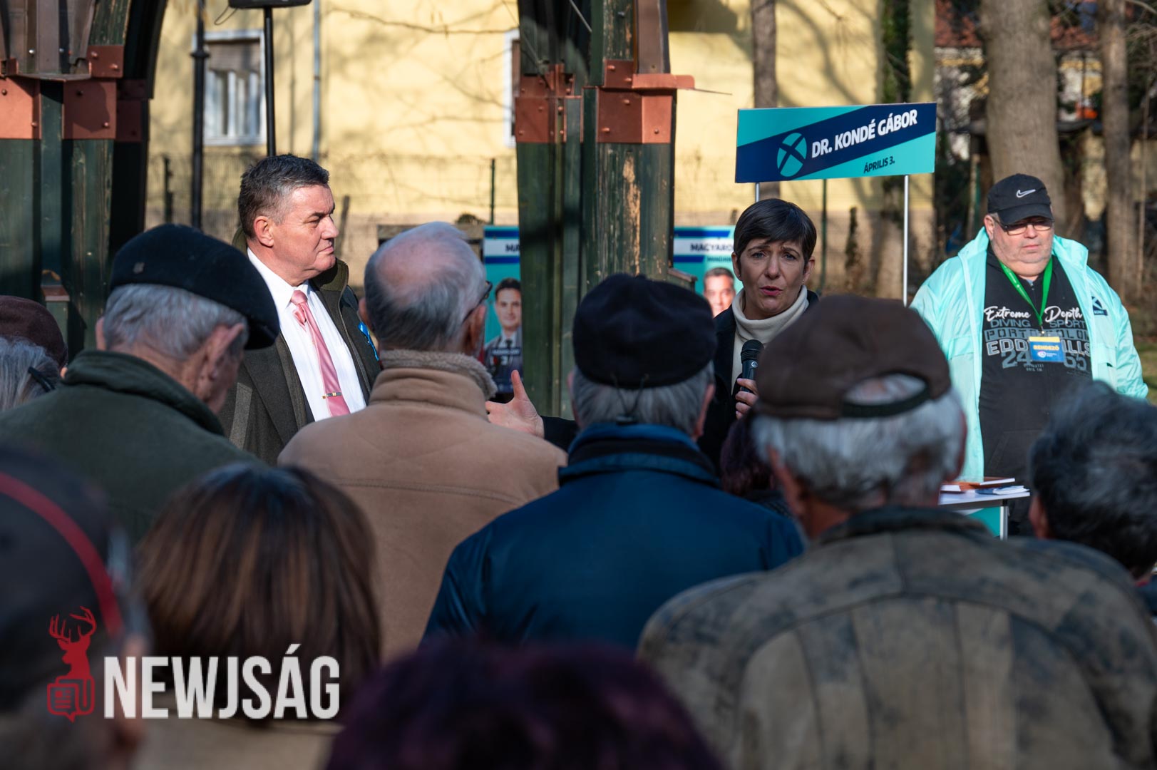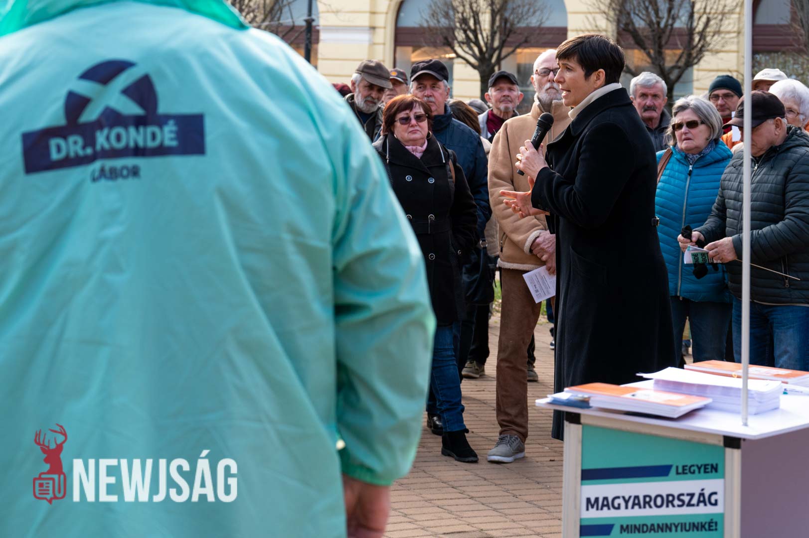 “Április 3-án mi, magyarok, újra arról fogunk dönteni, amiről már döntöttünk, és Szent István óta újra és újra döntenünk kell, hogy hová akarunk tartozni”, mondta Dobrev Klára a körülötte állóknak, miután a magát néhány mondatban bemutató dr. Kondé Gábortól megkapta a szót.