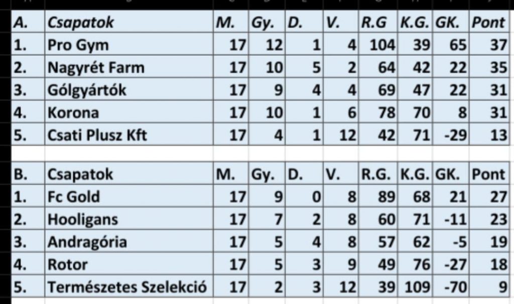 GÓLGYÁRTÓK-CSATI PLUSZ KFT. 7-1(3-1) jv: Orovecz gólok: Márkus 2, Takács 2, András, Paulik, Lestyan Goda ill. Gombár