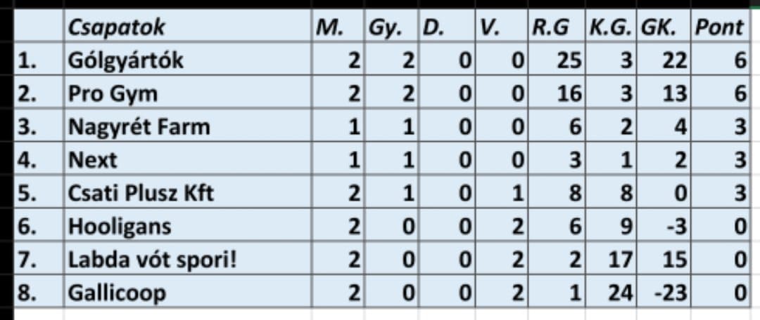Góllövőlista: 7: Virág(Pro Gym), 6: Takács és Paulik(Gólgyártók)