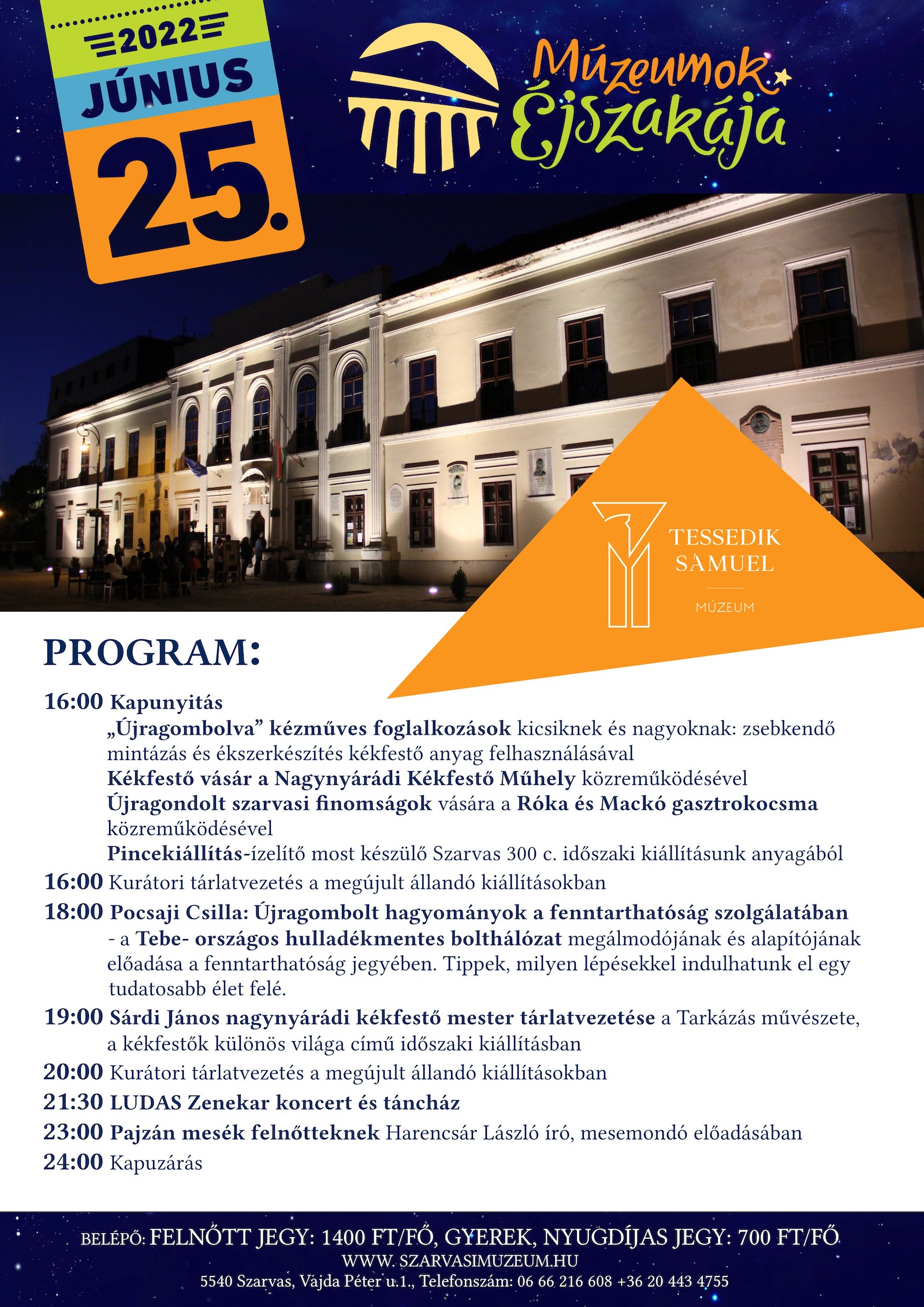 A Múzeumok Éjszakáján a Tessedik Sámuel Múzeum is életre kel. Interaktív tárlatvezetések, előadások, népzenei koncert, pincekiállítás, gyermekprogramok és sok más érdekesség várja az érdeklődőket június 25-én 16 órától egészen éjfélig.