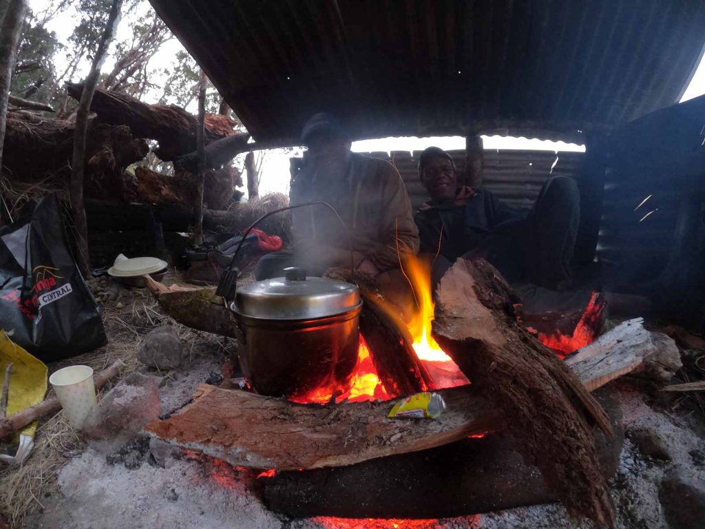 Három napot töltöttünk el a vulkánon, és hihetetlen nagy szerencsénk volt az időjárással. Az egyenlítői éghajlati övben még a száraz évszakban is rendkívül ritka, hogy három nap alatt mindössze pár órát cseperegjen az eső. A csúcsról körbenézve azt láttuk, hogy körülöttünk az összes hegycsúcs közelében ott ólálkodnak a felhők, csak a Mount Giluwe környékén nincs egy sem. A két éjszakát az alaptáborban, 3.650 méteren töltöttük; ki sátorban, ki pedig a falubéliek által összeeszkábált kunyhócskában.