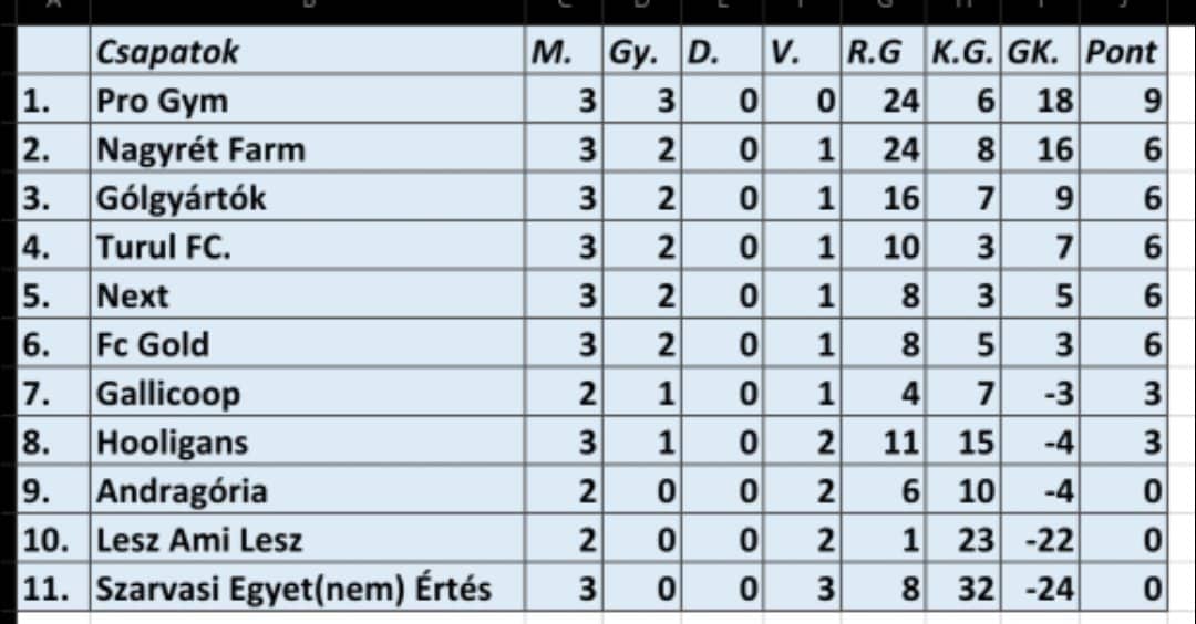 Góllövőlista: 9: Lestyan-Goda (Nagyrét Farm), 7: Olasz (Pro Gym)