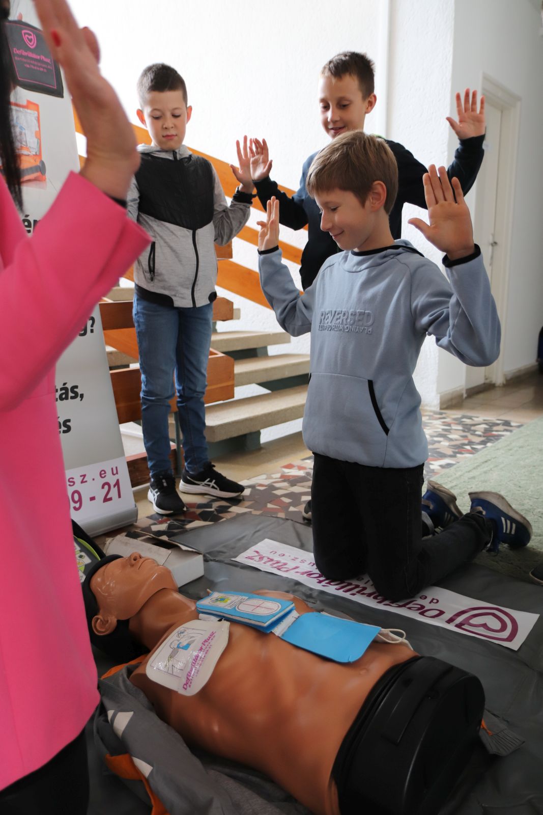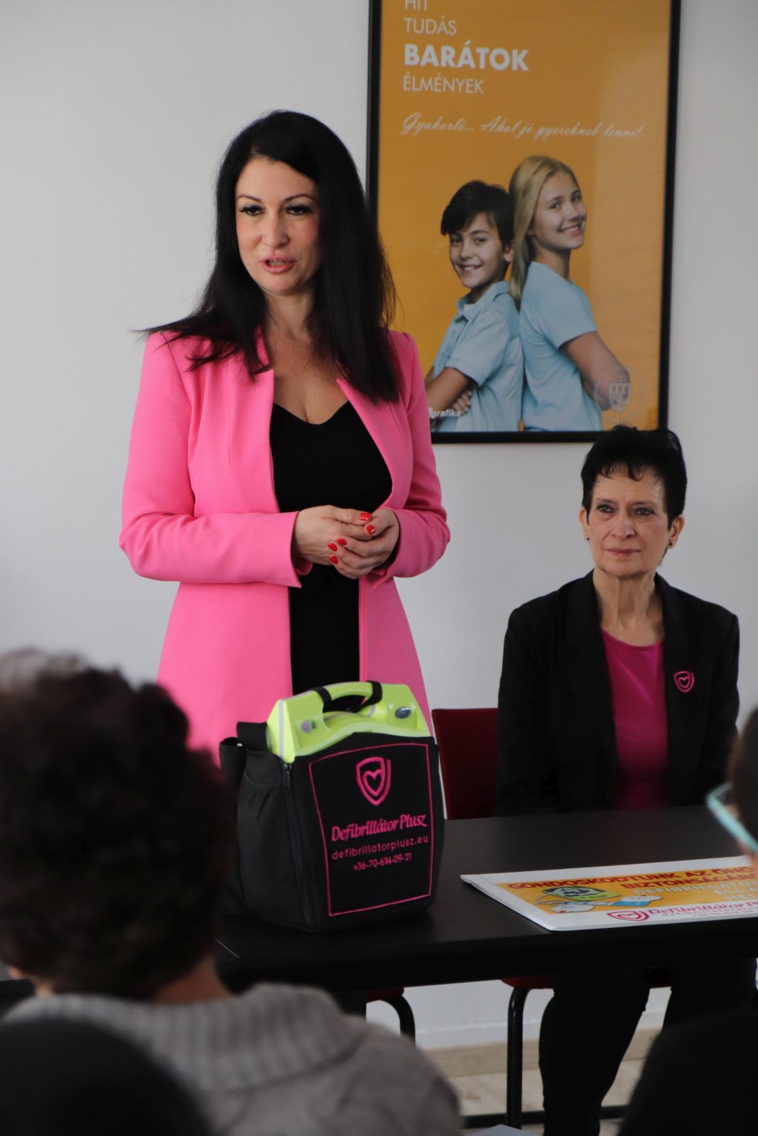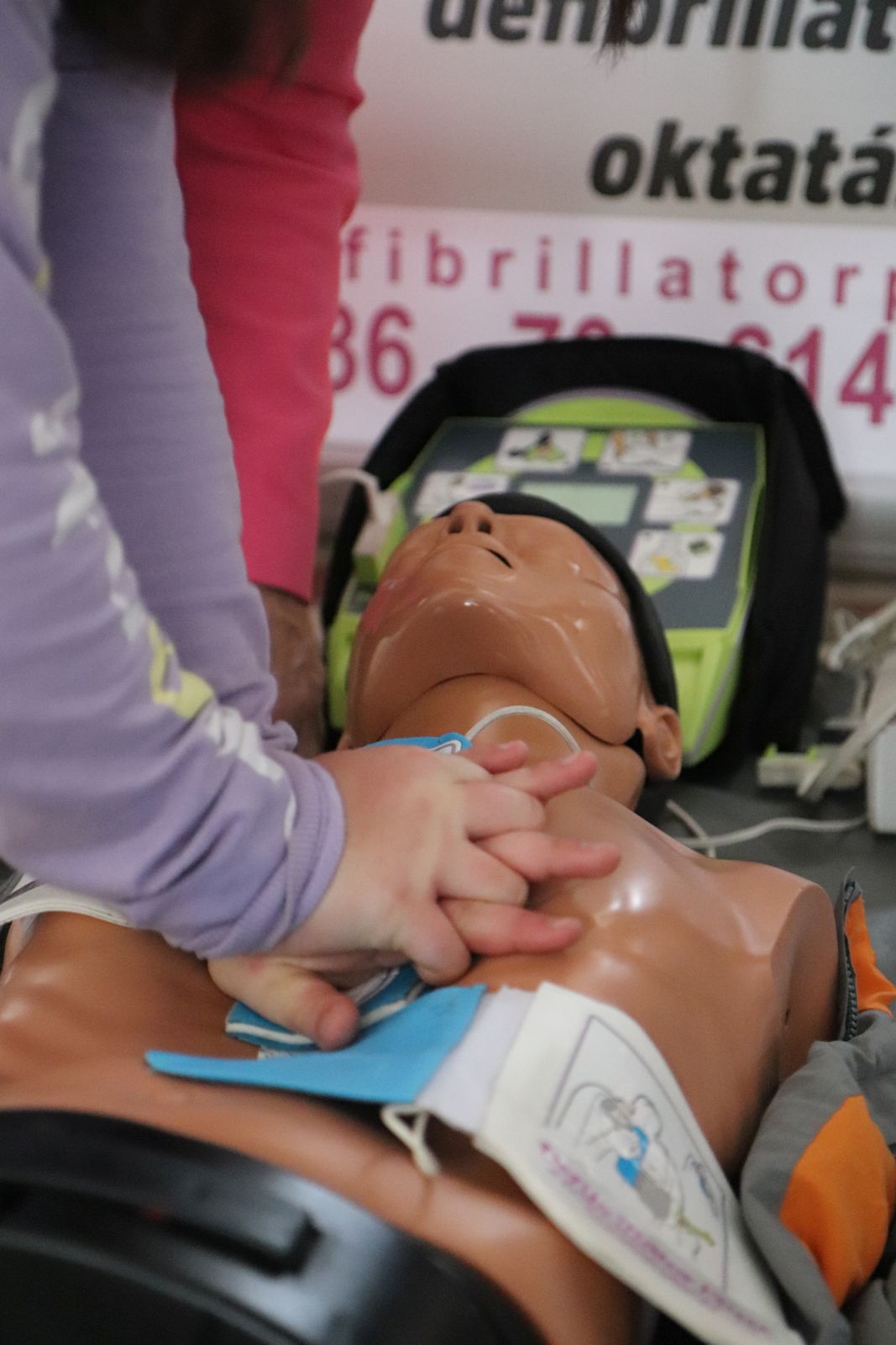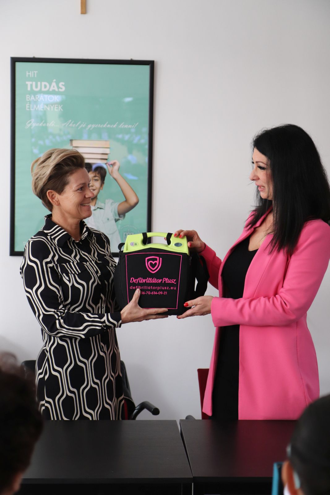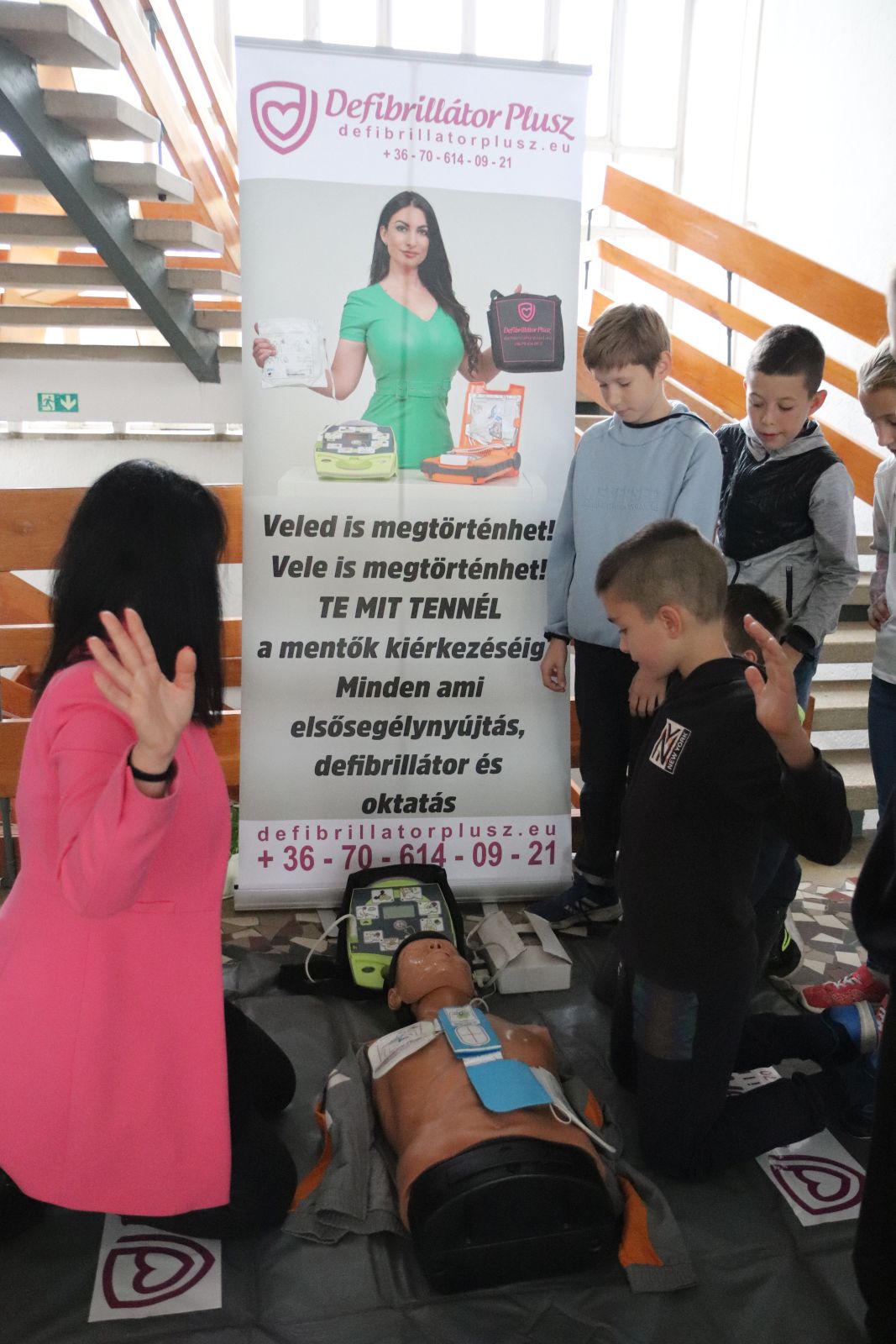 A gyűjtést elindító mozzanat az a „helyzet”, amit egy Gyakorlós tanuló gyermek szívproblémája és a hozzá kapcsolódó cselekvés; vagyis a „bármikor és veled is megtörténhet” érzése váltott cselekvéssé, sokakat megmozgató aktivitássá. Az intézmény és az alapítványa megkereste azt a partnert, aki a profilhoz legjobban illeszkedő eszköz ajánlatot tudta tenni, és minden olyan igényt ki tud elégíteni, ami jelenti a tartósságot és az egyszerű használatot és annak megtanulását. Varga Erika a Defibrillátor Plusz Kft. ügyvezetője látva a gyors cselekvést, és összefogást, a gépvásárláshoz felajánlotta, hogy 30 fő nevelőt, egyetemi hallgatót képeznek ki a Gyakorlóintézményben, hogy ha bármikor szükség van a krízishelyzet kezelésére, legyen olyan segítség, aki meg tudja kezdeni az életmentő beavatkozást. Dr. Benczéné Kardos Karola kuratóriumi elnök átadta az intézmény részére azt az alapítványi beszerzést, amely kettő darab EPIPEN oldatos injekció előre töltött tollban, ami gyermekek vagy felnőttek számára anafilaxiás reakció esetén beadható. Természetesen ennek megtanulása is feladat, így kapcsolódó felajánlásként a Defibrillátor Plusz Kft. a képzésbe ágyazva ennek az eszköznek a használatának betanítását is vállalta, segítve az intézmény biztonságtudatának erősítését. A bemutatón a Kft. képzője oktatóbabán mutatott be újraélesztést az eszköz használatával, amit a gyermekek is kipróbálhattak, és láttatták, hogy akár nyolc éves gyermekek számára is megtanulható és elvégezhető az eszközzel a beavatkozás, szükség esetén.