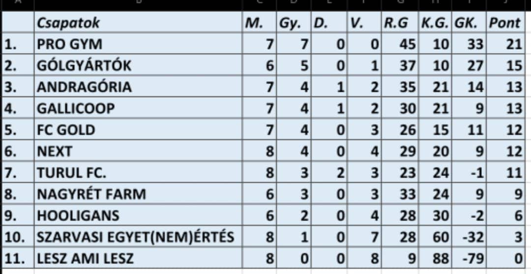 FC GOLD-SZARVASI EGYET(NEM)ÉRTÉS 7-2(4-1) jv: Pálinkás gólok: Debróczki 2, Szécsi 2, Altmann, Bencsik P., Bencsik G.ill. Gábos, Körösparti