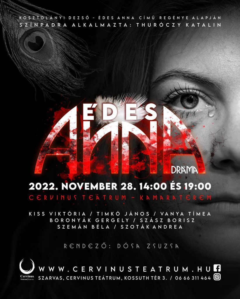 A Cervinus Teátrumban november 7-én lesz a második bérletes előadás, az éppen egy hónapja, október 8-án bemutatott Kosztolányi Dezső Édes Anna című kisregényének színpadi változata Dósa Zsuzsa rendezésében. A dráma címszereplője, Édes Anna megformálója Kiss Viktória, aki a Valahol Euróbában című musical egyik gyermekszereplője volt, ma pedig végzett színésznőként a Békéscsabai Jókai színházban dolgozik. Két előadást emelnék ki Molnár Ferenc Liliomában Julikát, és egy kétszemélyes darabban, Bartus Gyula Királyom, Isten áldjon, című kétszemélyes drámájában Edelpeck Borbála szerepét személyesítette meg Békéscsabán, mindkettőt csodálatosan.