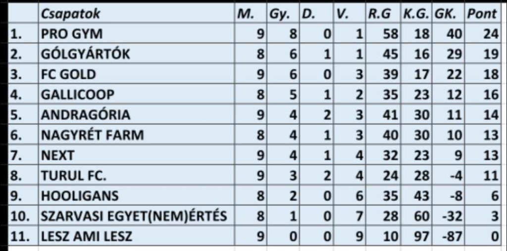 PRO GYM-HOOLIGANS 9-4 (5-2) jv: Pálinkás gólok: Kajtár 4, Kis 2, Olasz, Sonkoly, Kasik M.ill. Bány, Szedlják, Köteles, Jansik