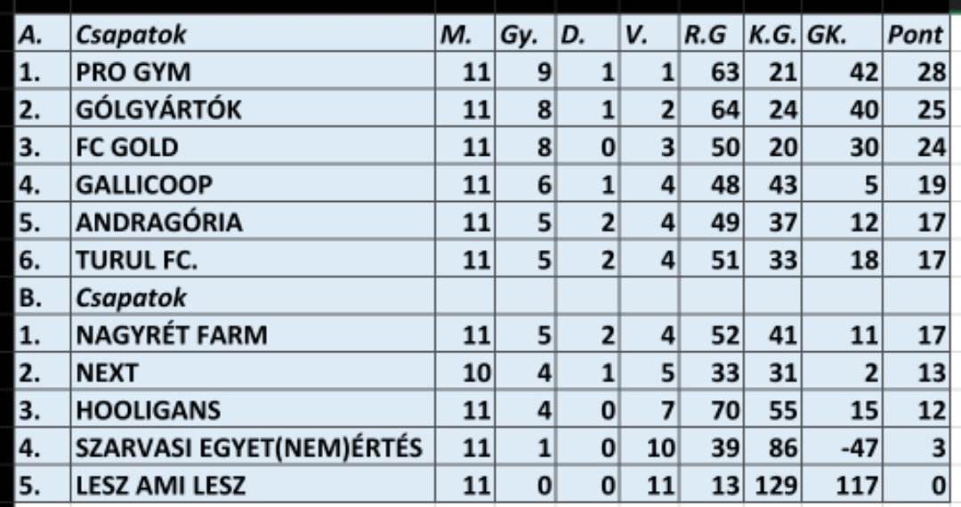 Góllövőlista: 20: Takács (Gólgyártók), 15: Szécsi (FC Gold)