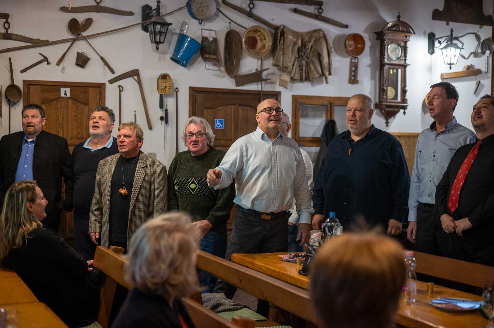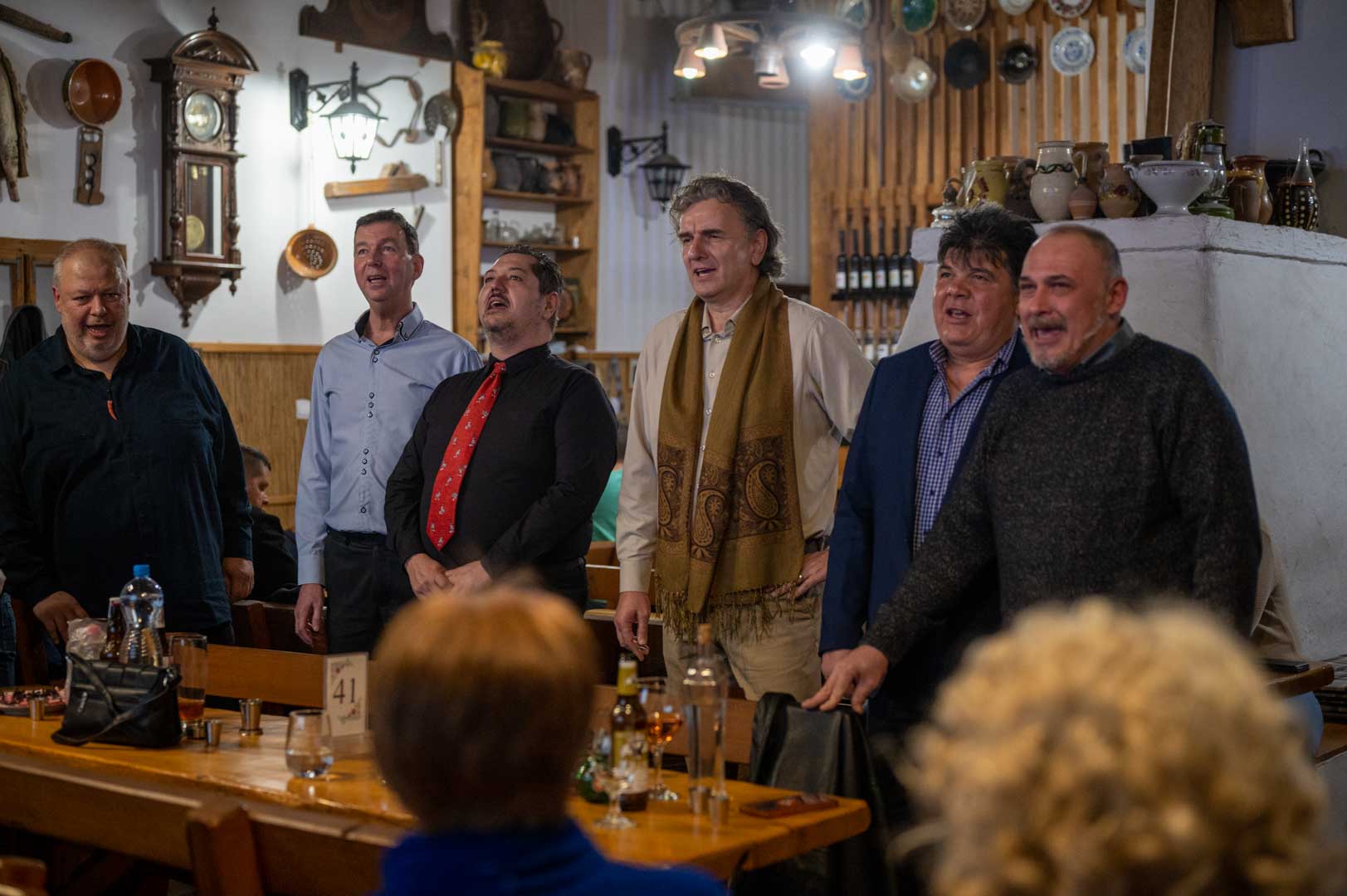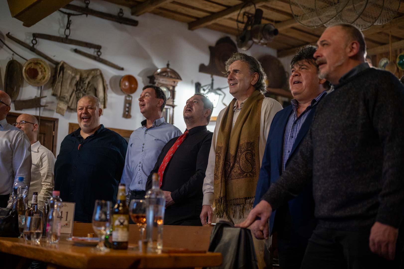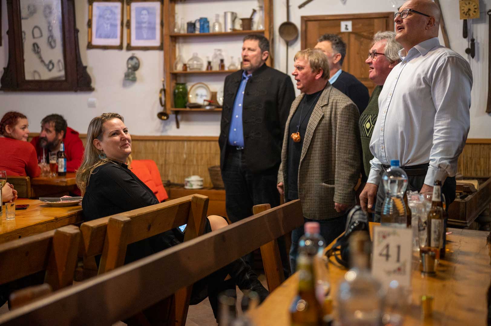 A 12 aktív kerettag mellé ilyenkor elhívják a régi tagokat is. Ottjártunkkor még alakult a társaság, de már ott volt a rangidős énekes, a 84 éves Balogh Laci bácsi, aki megtiszteli ezeket az összejöveteleket.