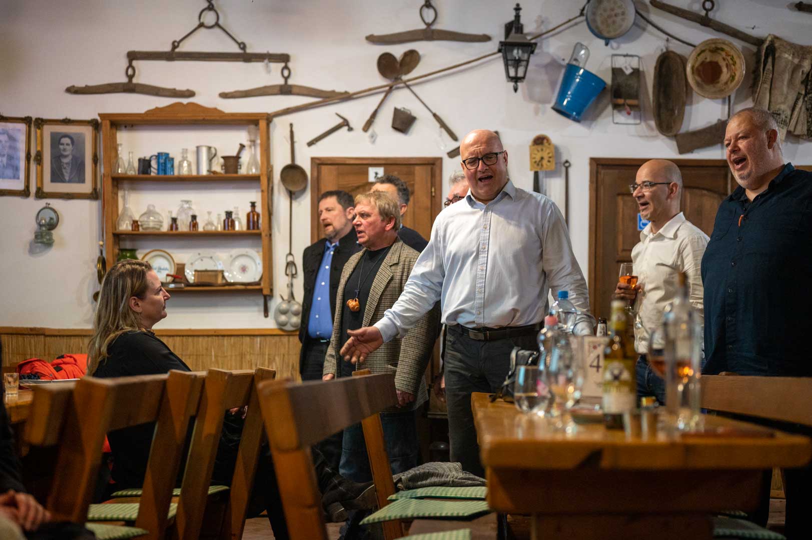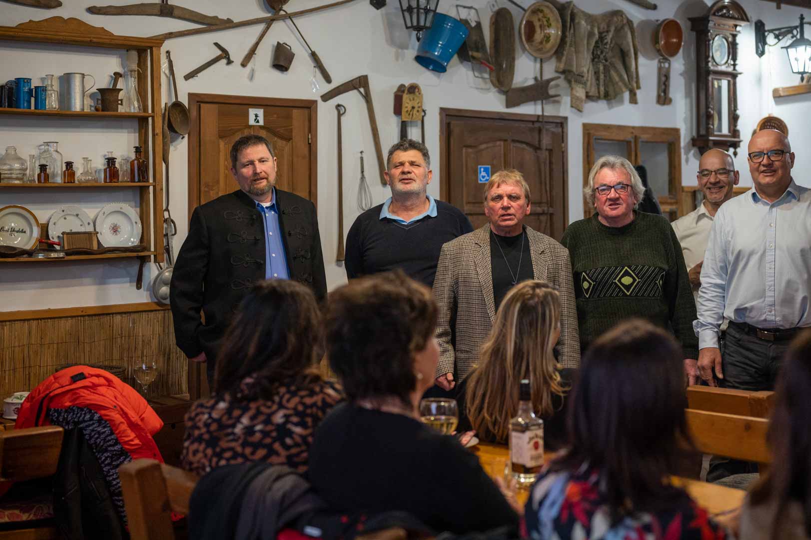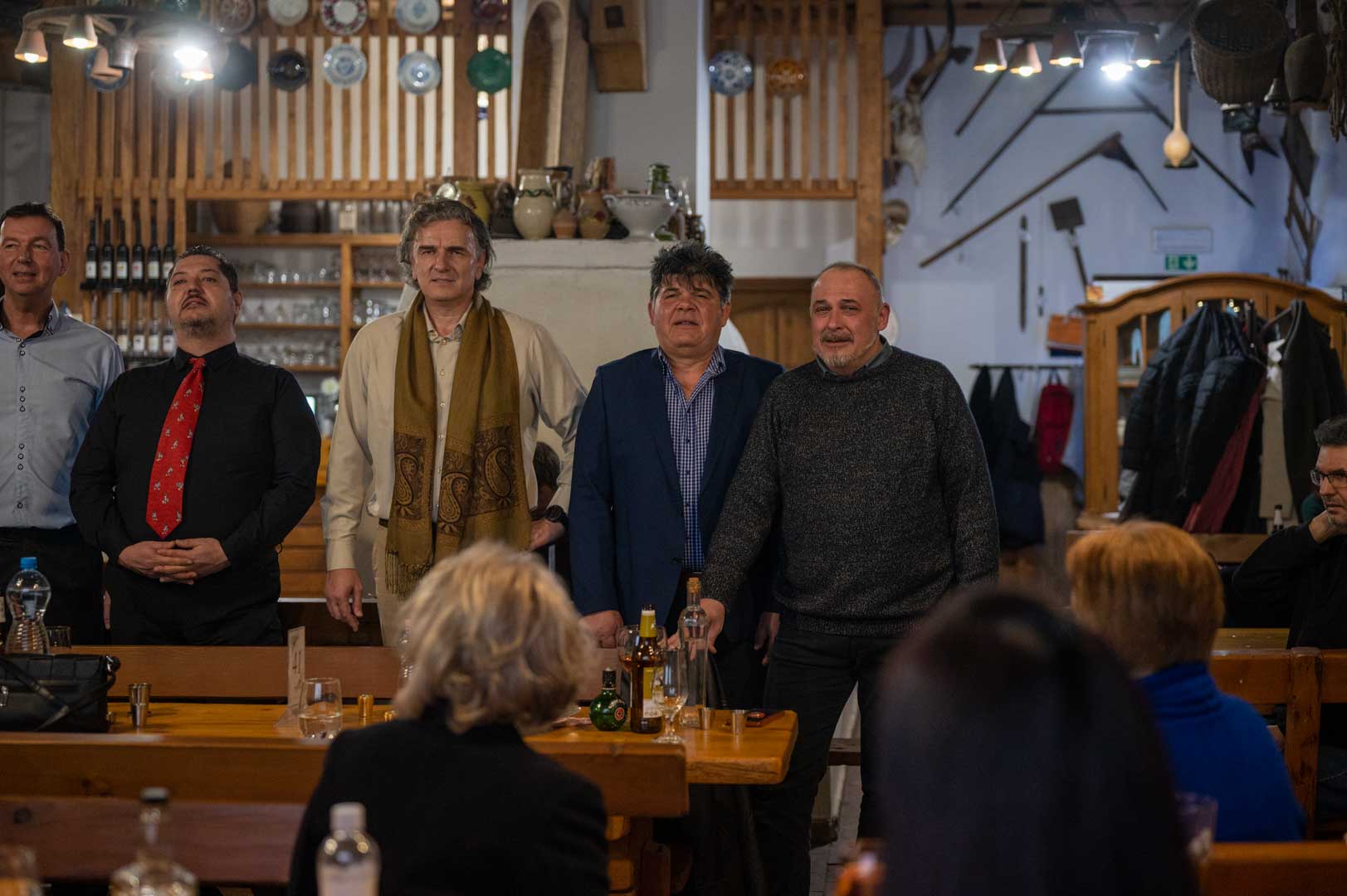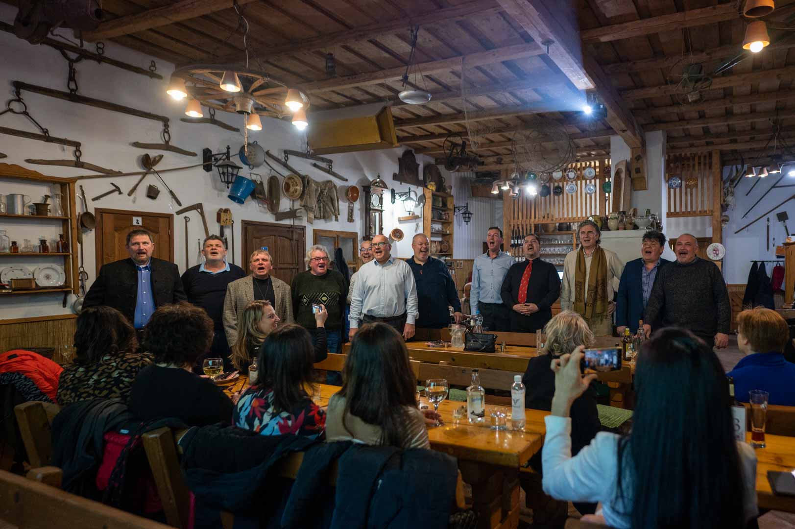 A 12 aktív kerettag mellé ilyenkor elhívják a régi tagokat is. Ottjártunkkor még alakult a társaság, de már ott volt a rangidős énekes, a 84 éves Balogh Laci bácsi, aki megtiszteli ezeket az összejöveteleket.