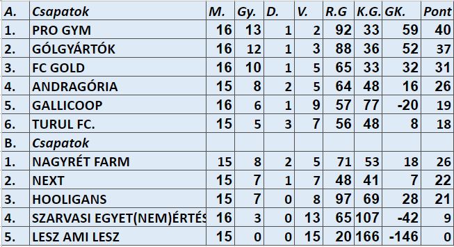 Góllövőlista: 24: Takács (Gólgyártók), 22: Radics (Gólgyártók)