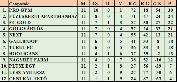 Góllövőlista: 21: Bakos (Next), 18: Kiri B. (Füzeskerti Apartmanház)
