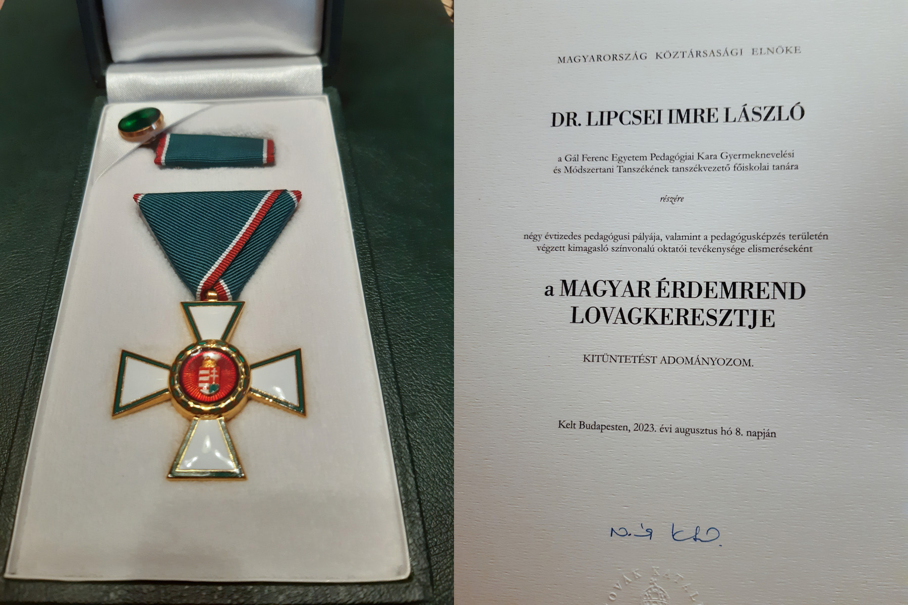 Az augusztus 20-i állami ünnep alkalmából dr. Lipcsei Imre László, a Gál Ferenc Egyetem Pedagógiai Kara Gyermeknevelési és Módszertani Tanszékének tanszékvezető főiskolai tanára részére négy évtizedes pedagógiai pályája, valamint a pedagógusképzés területén végzett kimagasló színvonalú oktatói tevékenysége elismeréseként a Magyar Érdemrend lovagkeresztje kitüntetést adományozta Novák Katalin köztársasági elnök.