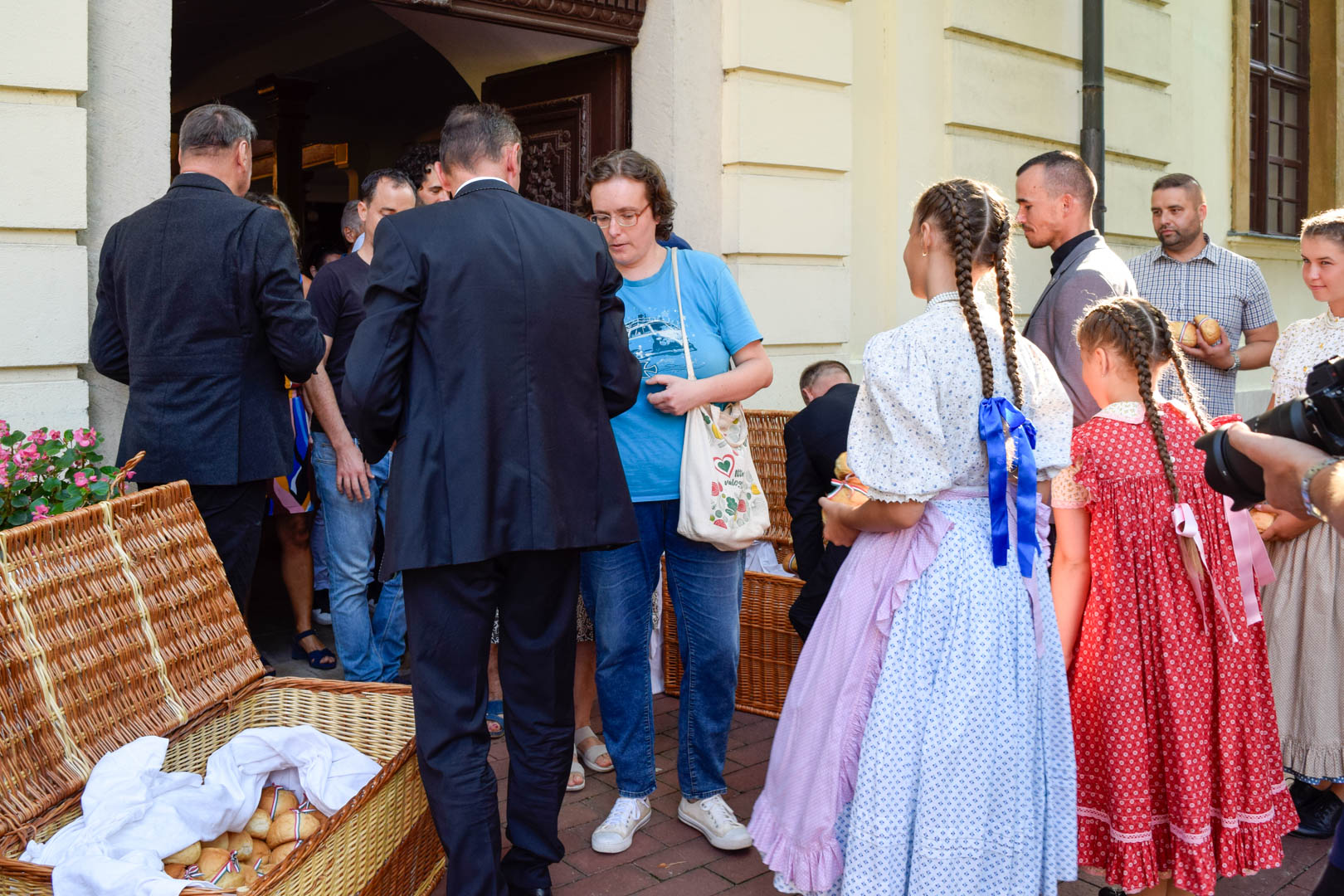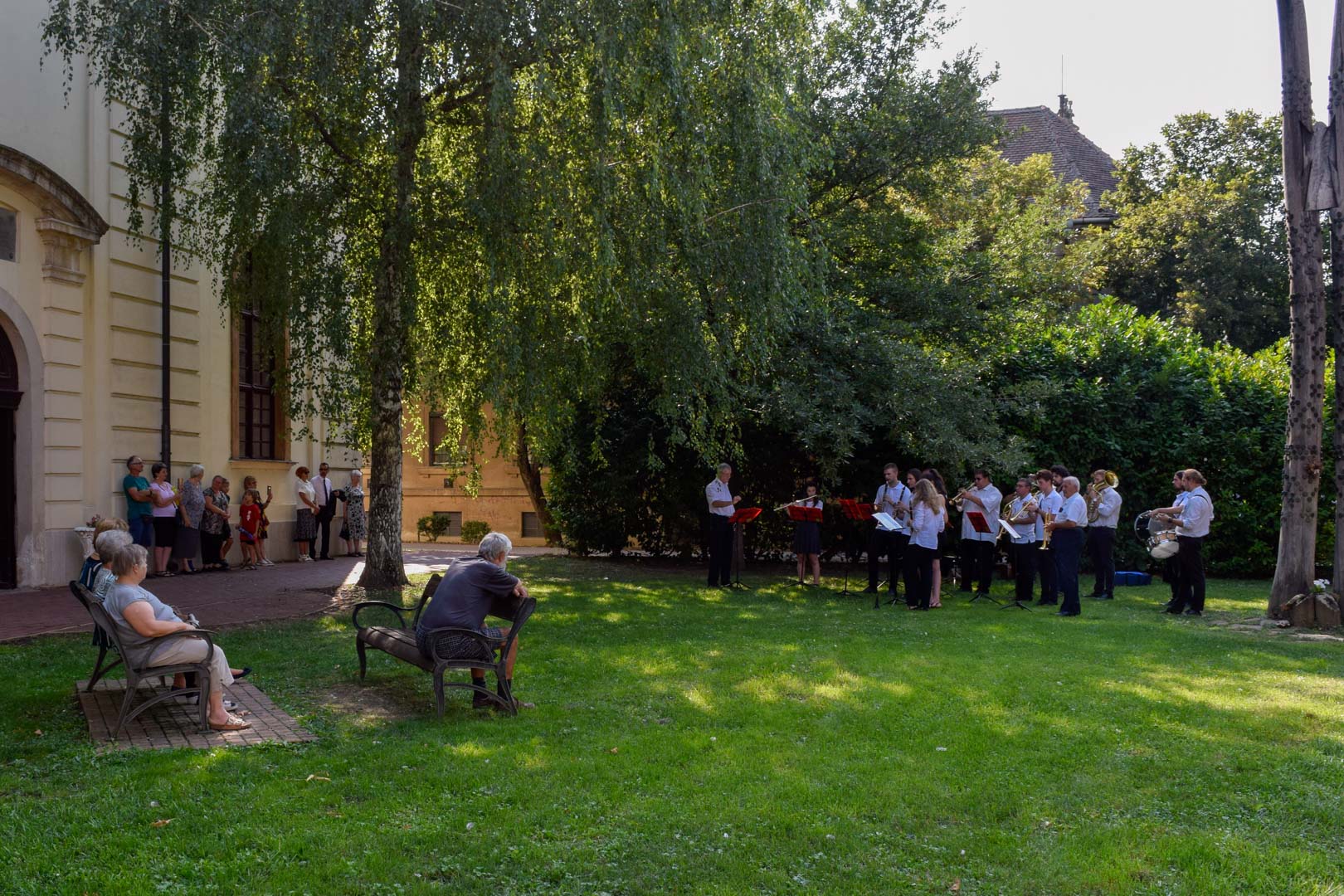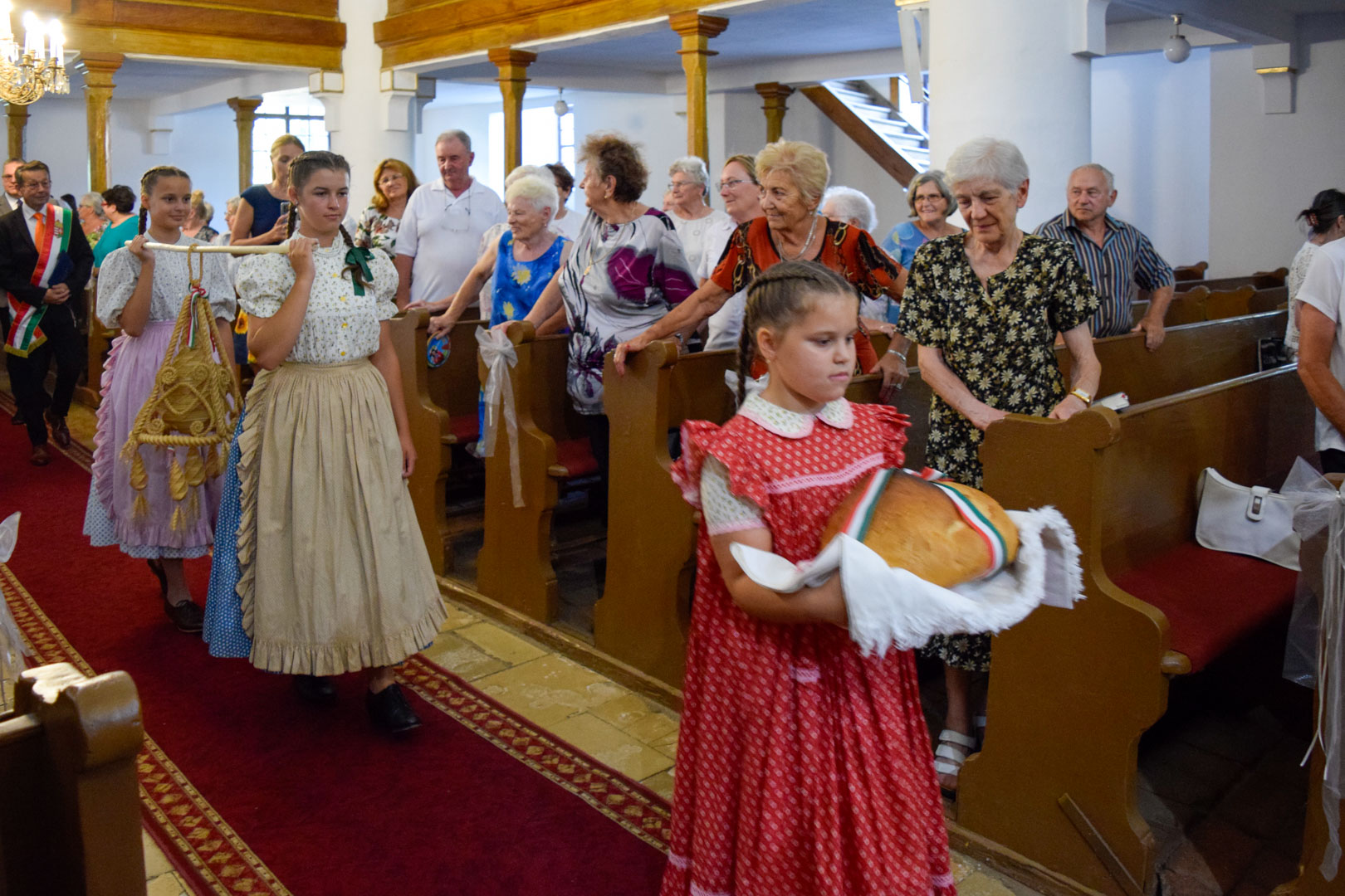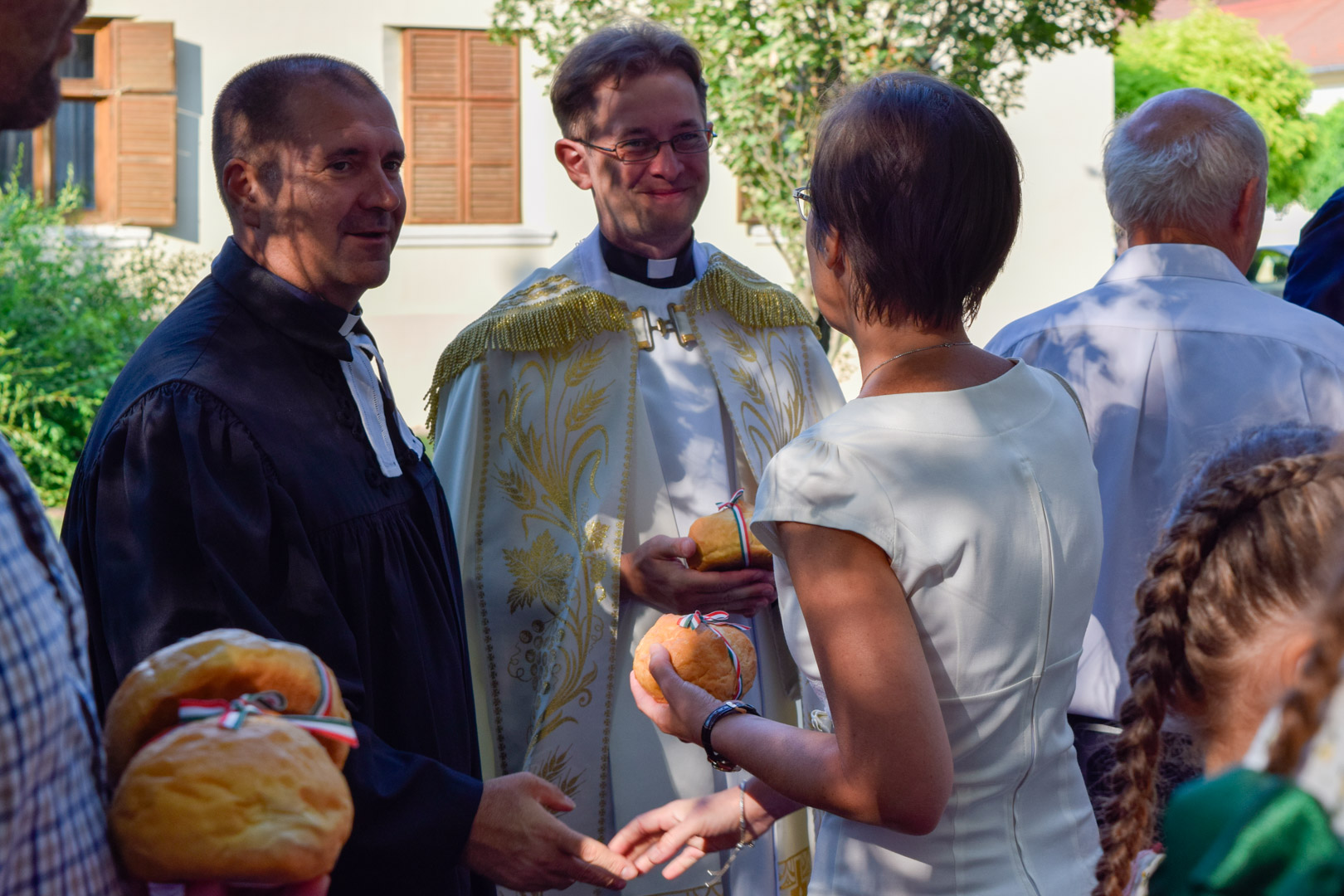 Koradélutáni kánikulában kezdődött a kenyéráldás Szarvason, vasárnap, az augusztus 20-iki ünnepi programok részeként. Az Ótemplom árnyas oldalán a Szarvasi Fúvószenekar Szabados Tóth Gábor vezetésével népszerű melódiákat játszott a gyülekezőknek, majd az újkenyeret és az aratókoszorút követve vonultak be, hogy elfoglalják helyüket a templom padsoraiban.