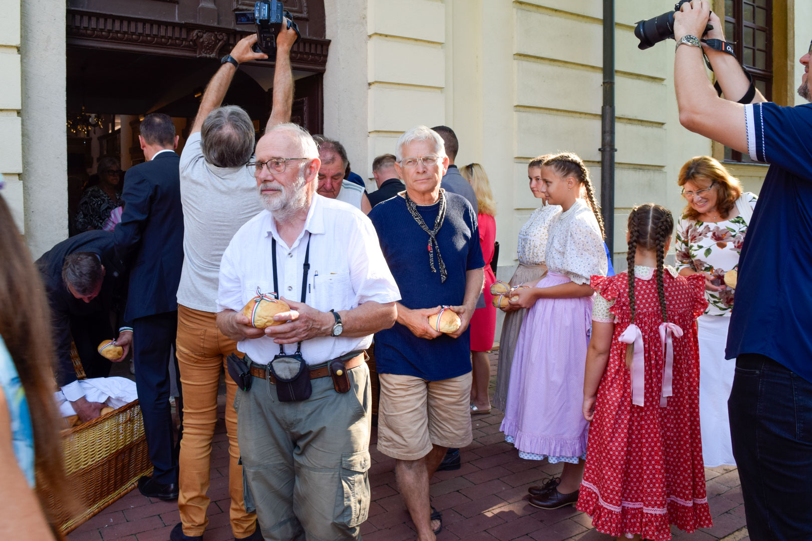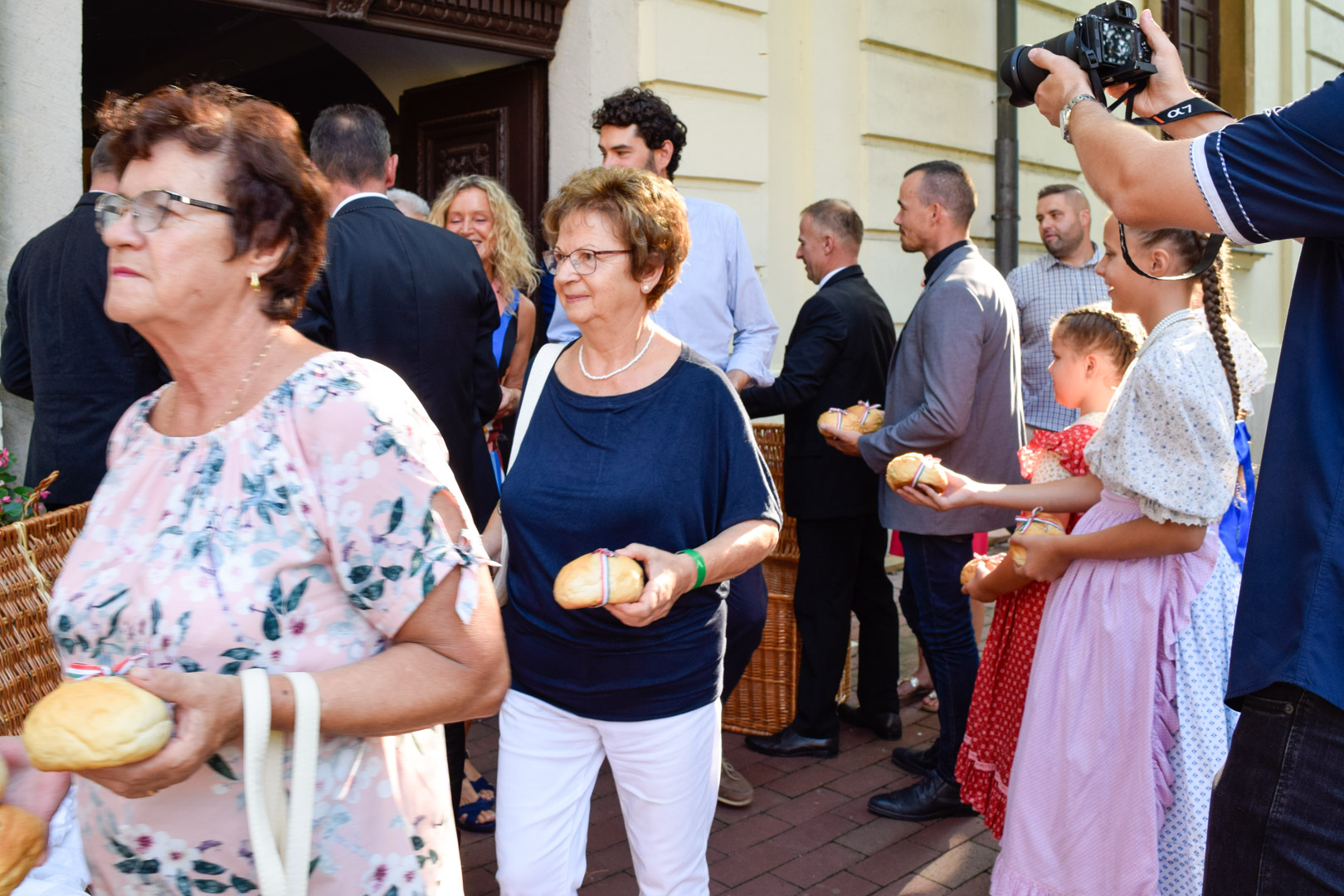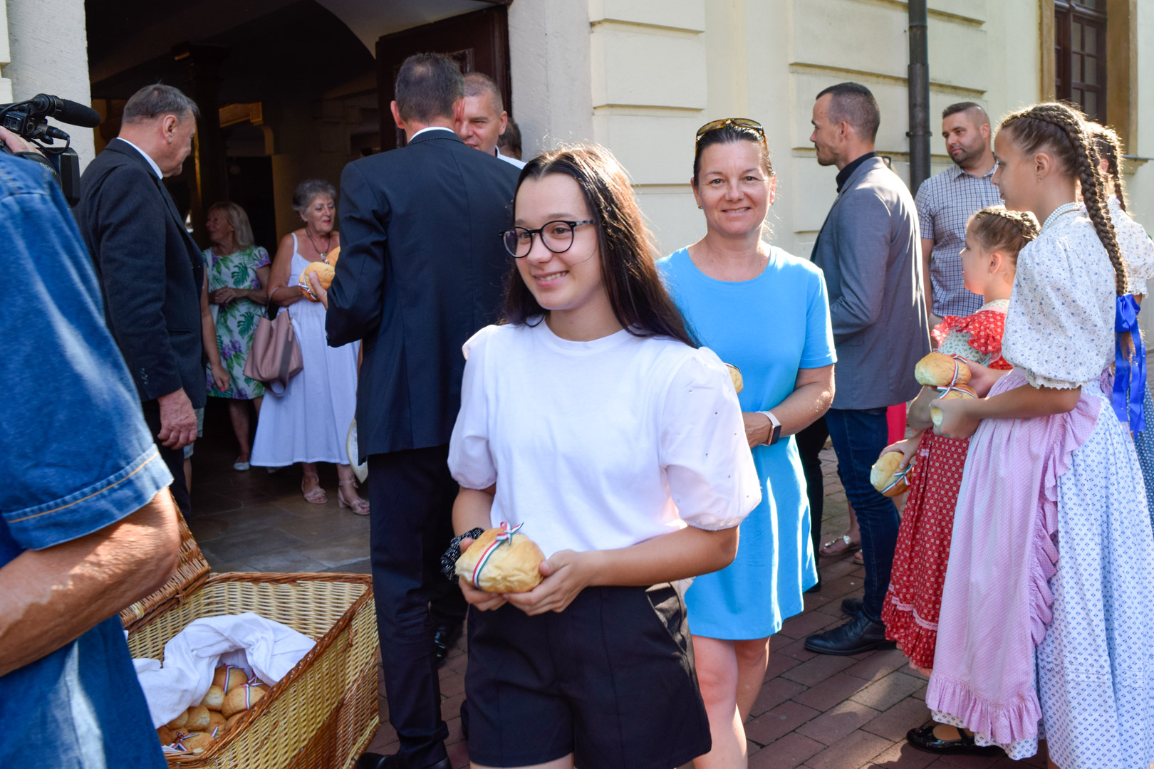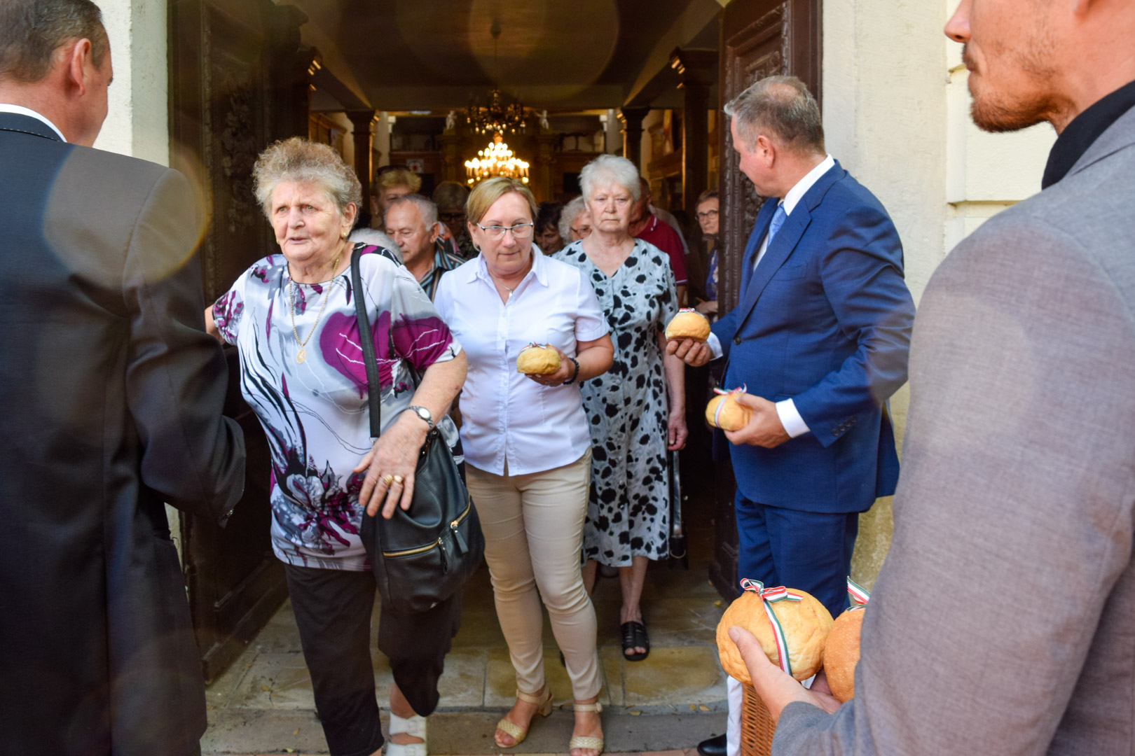 Koradélutáni kánikulában kezdődött a kenyéráldás Szarvason, vasárnap, az augusztus 20-iki ünnepi programok részeként. Az Ótemplom árnyas oldalán a Szarvasi Fúvószenekar Szabados Tóth Gábor vezetésével népszerű melódiákat játszott a gyülekezőknek, majd az újkenyeret és az aratókoszorút követve vonultak be, hogy elfoglalják helyüket a templom padsoraiban.