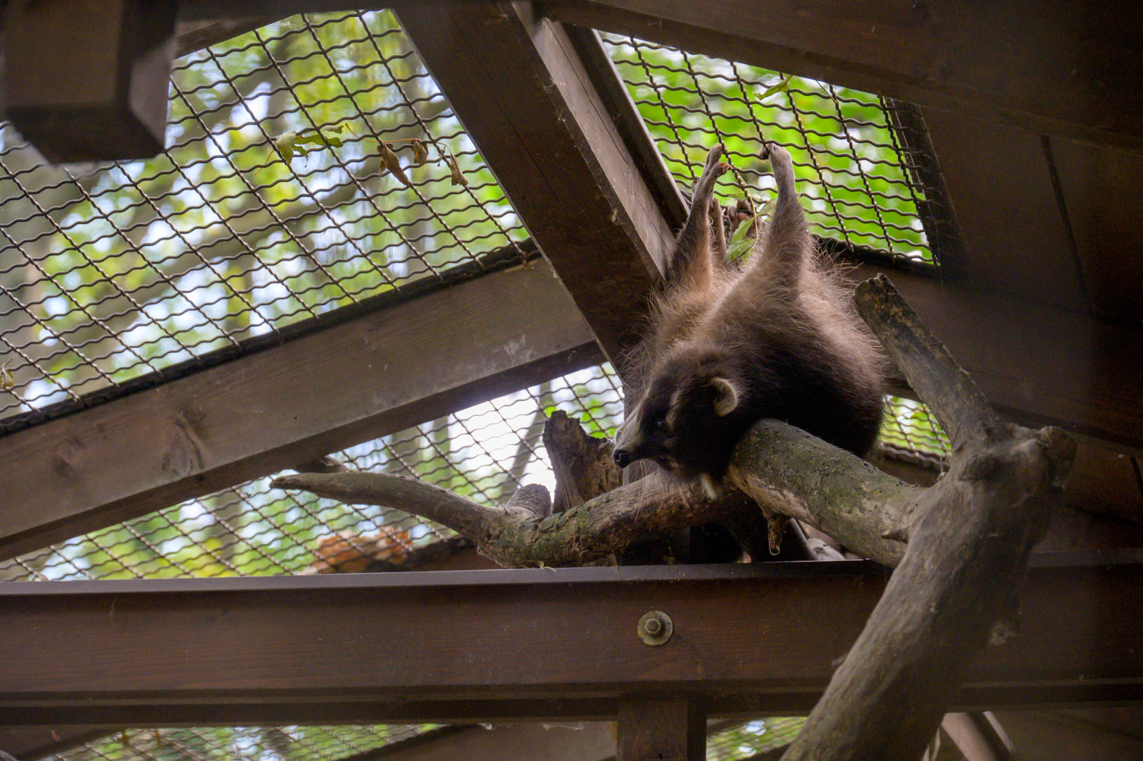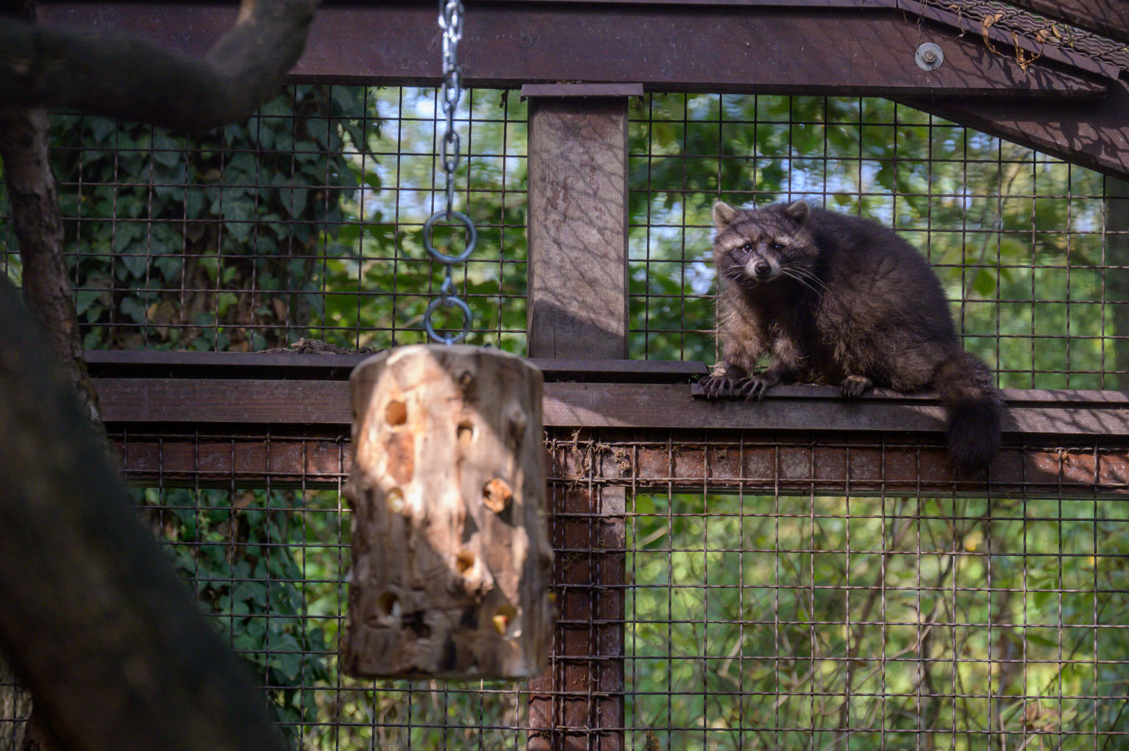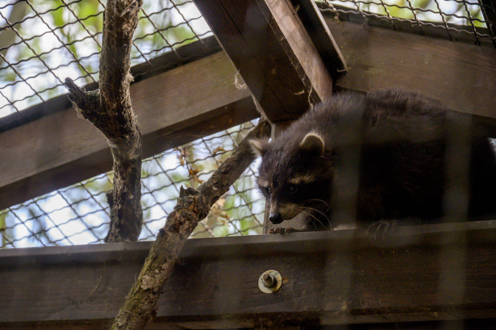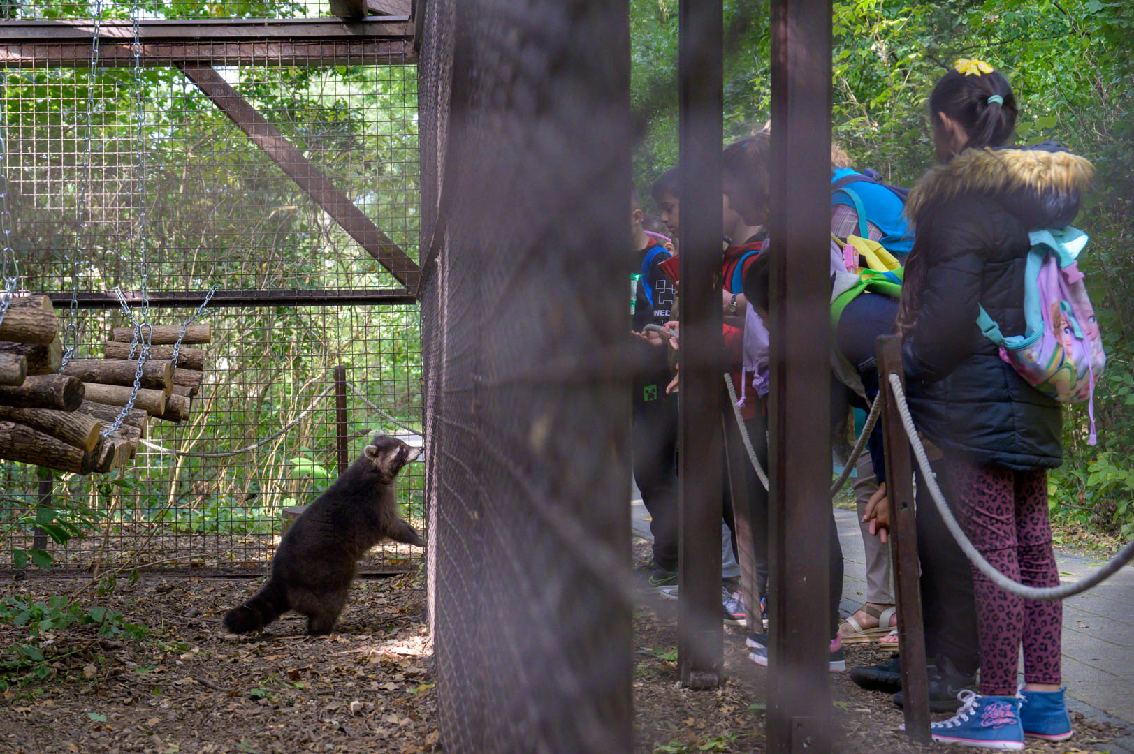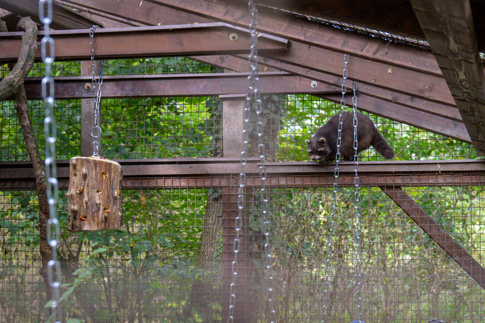 A hollót követően a mosómedvéhez vonult a diáksereg. Az ő ketrecébe egy új kötélhágcsó került, amire némi élelemmel szerették volna felcsalogatni az egyébként kíváncsi természetű, de most meglehetősen tartózkodó kutyafélét. Egy darabig biztos magasból figyelte Körömi Krisztinát, milyen csemegéket rejt el a másik ajándékába, egy felfüggesztett tuskóba fúrt lyukakba. Számára is szükség volt némi időre, meg egy kis magányra, hogy felfedezze az újdonságokat.