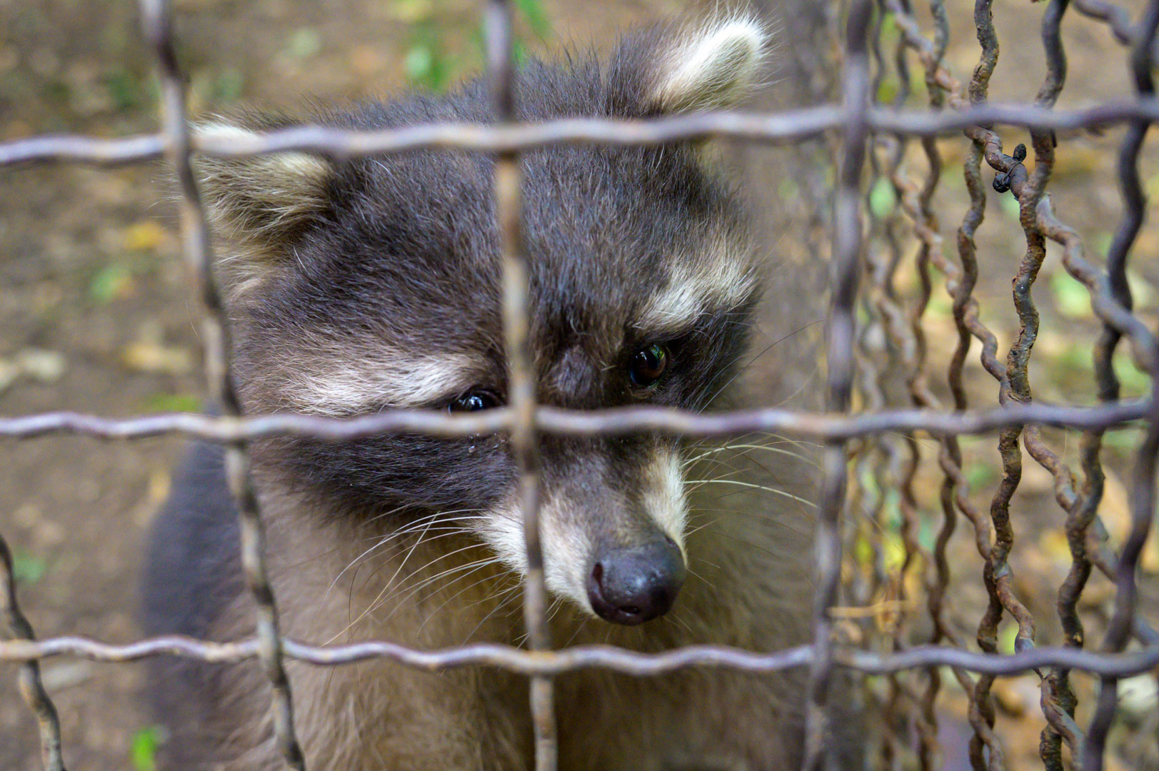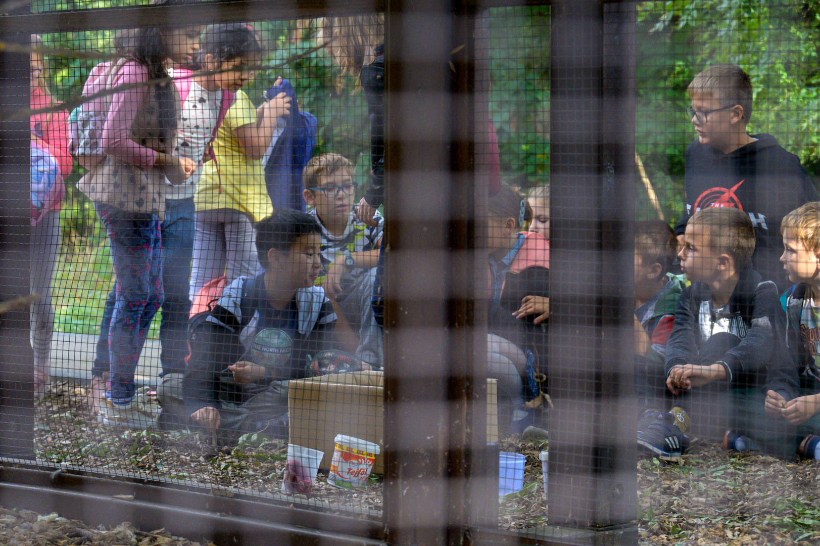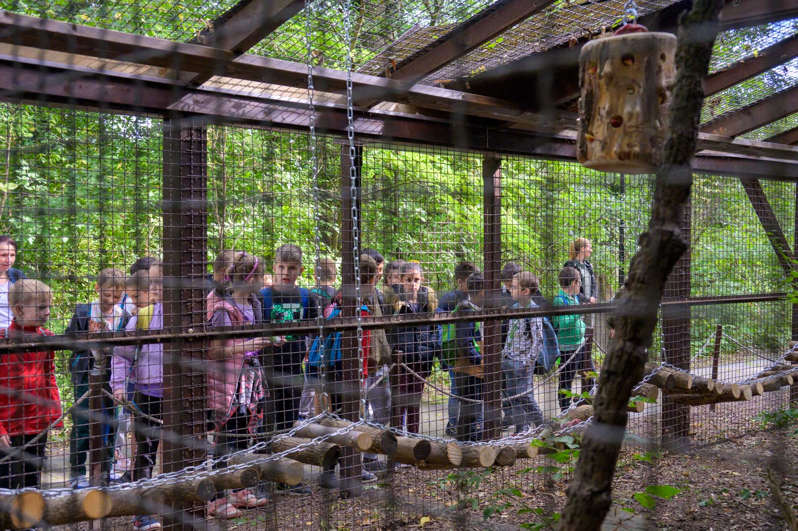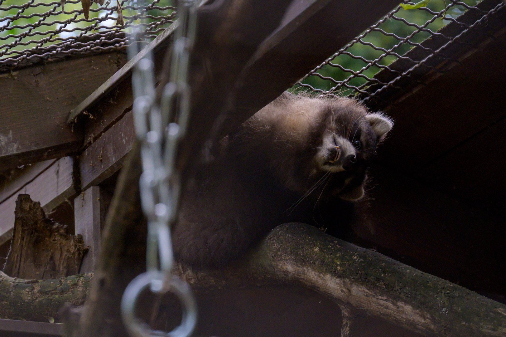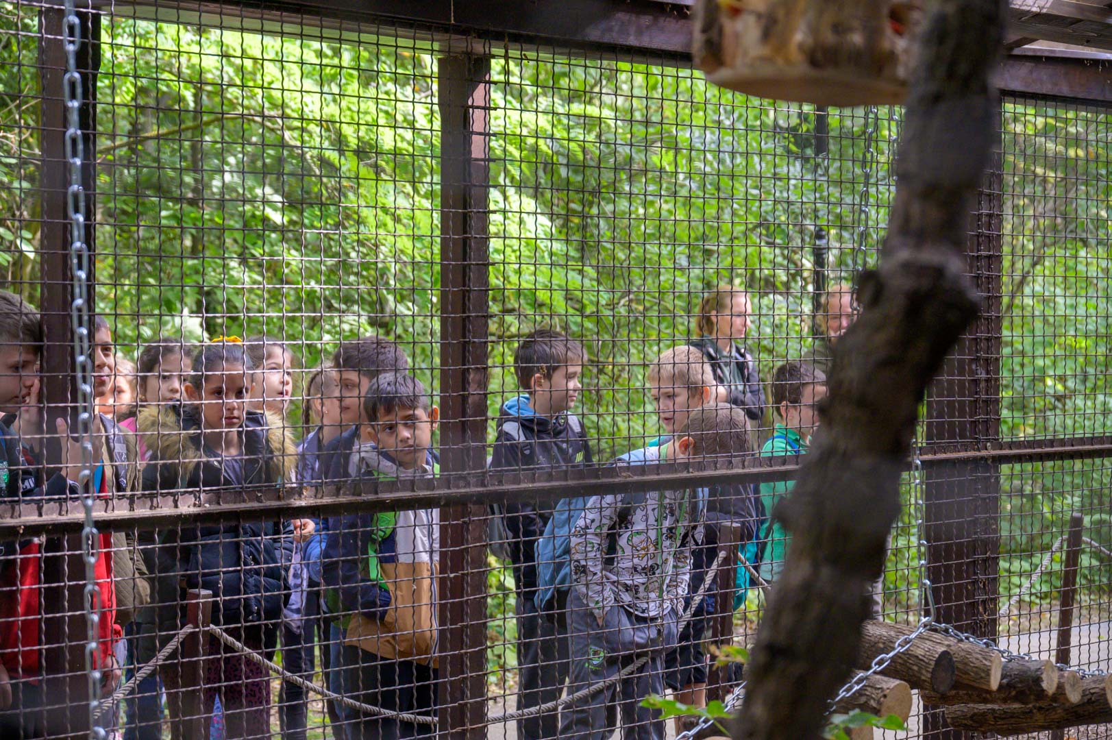 A hollót követően a mosómedvéhez vonult a diáksereg. Az ő ketrecébe egy új kötélhágcsó került, amire némi élelemmel szerették volna felcsalogatni az egyébként kíváncsi természetű, de most meglehetősen tartózkodó kutyafélét. Egy darabig biztos magasból figyelte Körömi Krisztinát, milyen csemegéket rejt el a másik ajándékába, egy felfüggesztett tuskóba fúrt lyukakba. Számára is szükség volt némi időre, meg egy kis magányra, hogy felfedezze az újdonságokat.