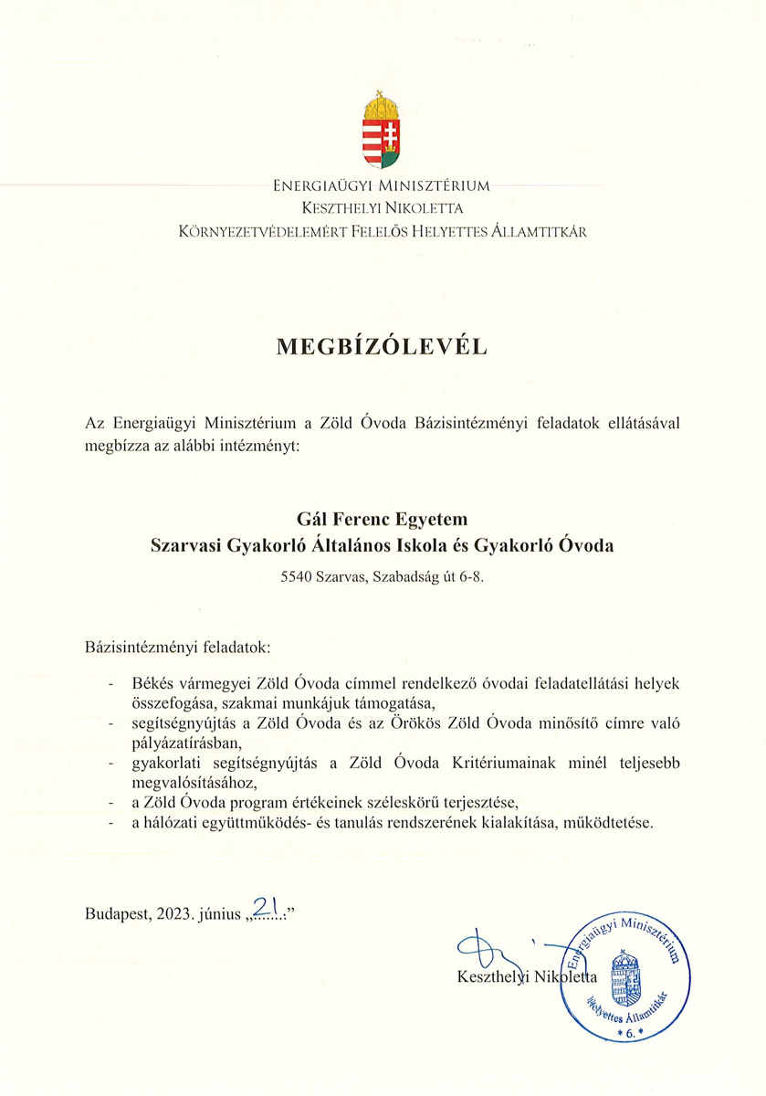 2023. október 18-án az Energiaügyi Minisztérium Környezetvédelemért Felelős Államtitkárságán került átadásra, Keszthelyi Nikoletta környezetvédelemért felelős helyettes államtitkár asszony részéről, a GFE Szarvasi Gyakorlóintézményének a Békés vármegye Zöld Óvoda Bázisintézményi feladatellátásról szóló megbízólevele.
