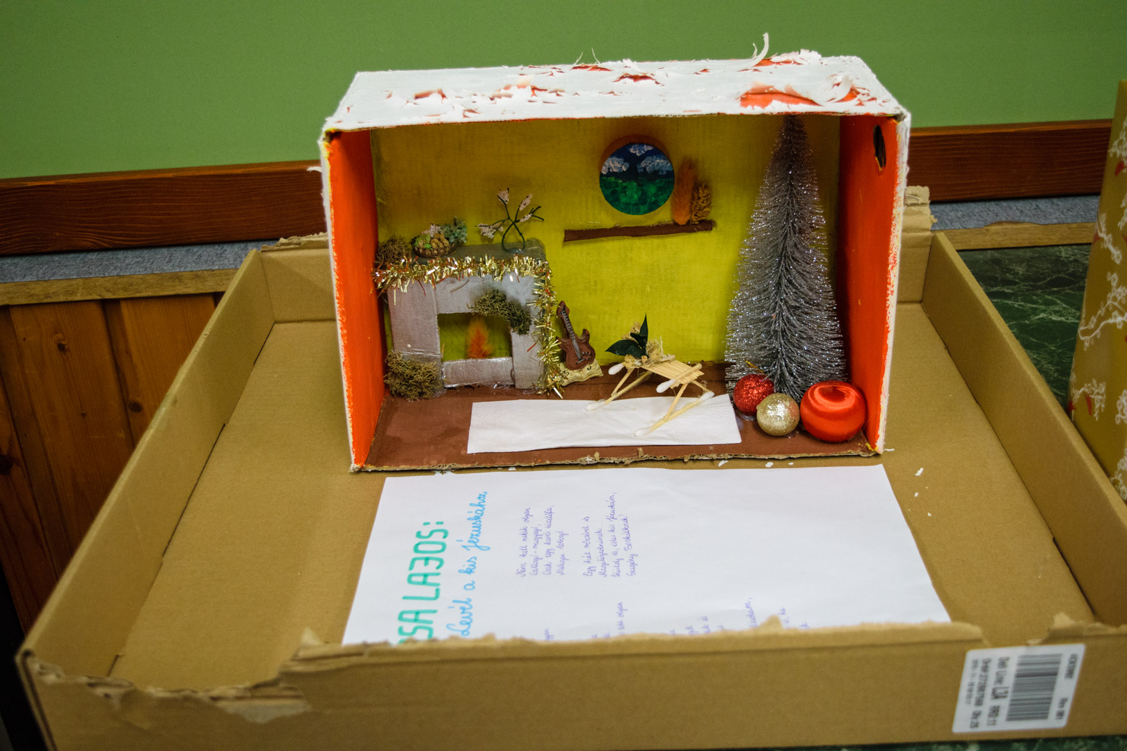 A Városi Könyvtár szakítani akart az ilyenkor szokásos karácsonyi rajzpályázat hagyományával és kapóra jött, hogy a megyei könyvtárban megismerték a diorámát, a 3D-s makettezést – vezette be a kiállítással egybekötött eredményhirdetést Molnárné Pető Beáta könyvtárigazgató december 15-én, pénteken délután. A feladat az volt, hogy egy kedvenc téli verset kellett „életre kelteni” egy cipősdoboz méretű diorámában. A dioráma elkészítésénél többféle technikát (festés, ragasztás, kézimunkázás stb.) és anyagot (termések, kövek, papír, textil, műanyag stb.) is használhattak a pályázók.