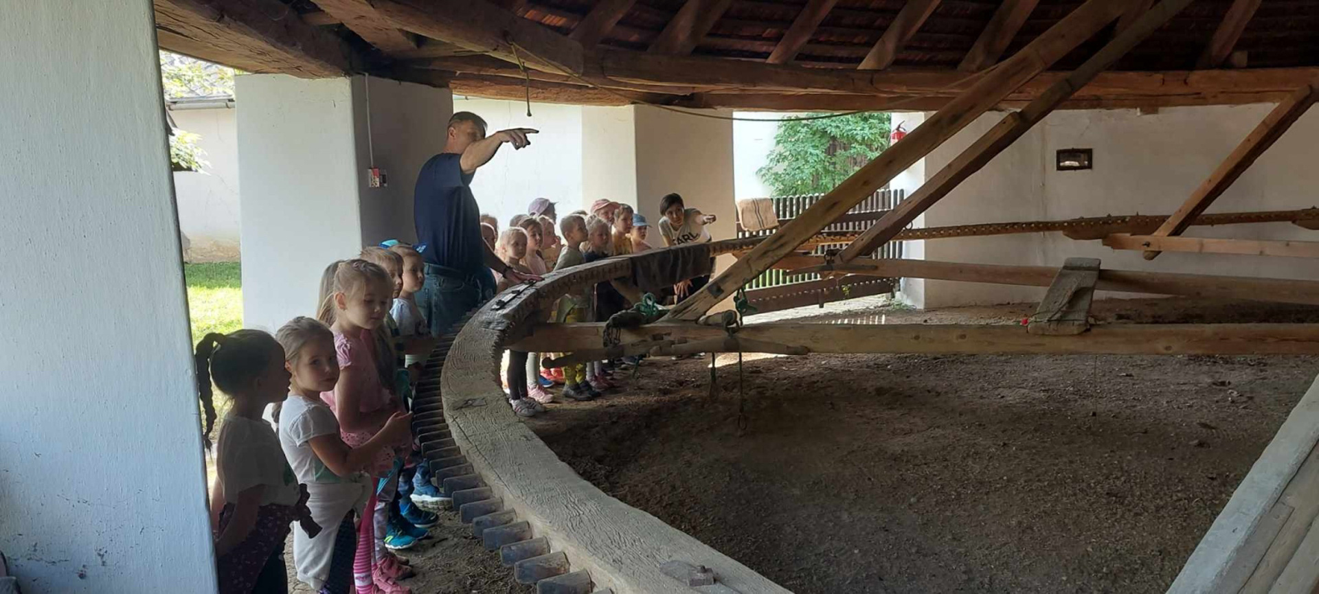 A Gál Ferenc Egyetem Szarvasi Gyakorlóóvodája a Kulturális és Innovációs Minisztérium megbízásából a Nemzeti Kulturális Támogatáskezelő által kiírt „KINCSES KULTÚRÓVODA 2023” nyertes pályázatának segítségével 2024. április 10-én az Alma- és a Búzavirág csoport nagycsoportosai látogatást tettek a Szarvasi Szárazmalomban. Lehetőségük nyílt arra, hogy közelebbről is megismerkedjenek a régmúlt idők hagyományos őrlési technikájával, történetével. A kirándulás során a gyerekek izgalommal telve fedezték fel a malom világát és érdekességeket tudtak meg a liszt előállításának folyamatáról. A látogatás a szárazmalom bemutatásával kezdődött, a gyerekek megtudták mi is pontosan a szárazmalom és hogyan működik. Az interaktív bemutató során a malom dolgozója elmagyarázta, hogy hogyan hozzák mozgásba a lovak a malmot, és hogyan alakítják az őrlőkövek a gabonát liszté. Miután megtudták, hogyan működik a szárazmalom, a gyerekeknek lehetőségük volt felfedezni a malom környékét és megfigyelni a lovak munkáját. Az izgalom és a kíváncsiság ragyogott a gyerekek szemében, ahogy figyelték, hogy a lovak hogyan mozgatják a malom kerekét, és hogyan segítik az őrlőkövek forgását.