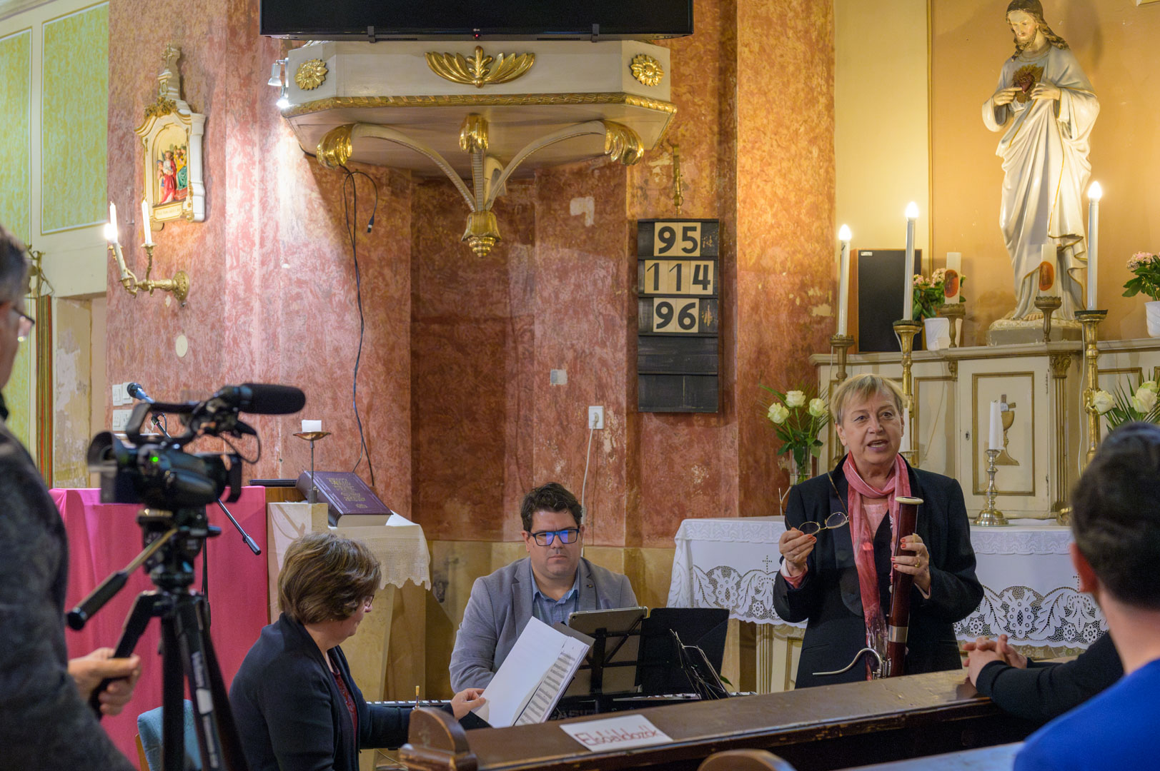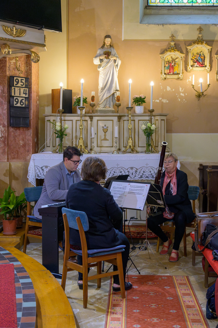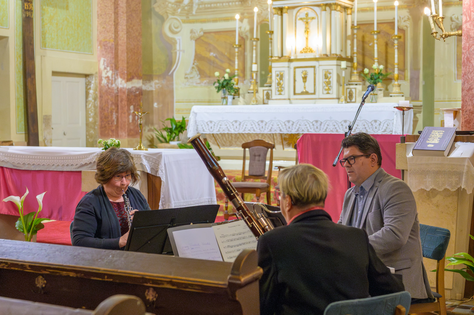 Ezen a napon Varga Laura fuvolaművész helyét Tóth Györgyi oboaművész foglalta el a trióban. Mellé a hármas két eredeti tagja, Vizsolyi Lívia fagottművész és Klebniczki György zongoraművész ült. A művészek mindhárman a Szegedi Tudományegyetem Zeneművészeti Karának oktatói, ahogy Tóth Györgyi is, aki a szomszédos teremben tanít.